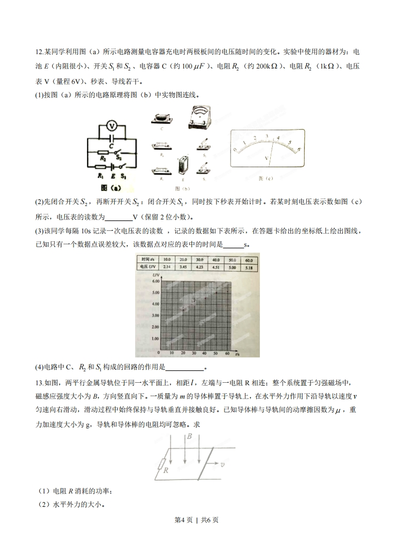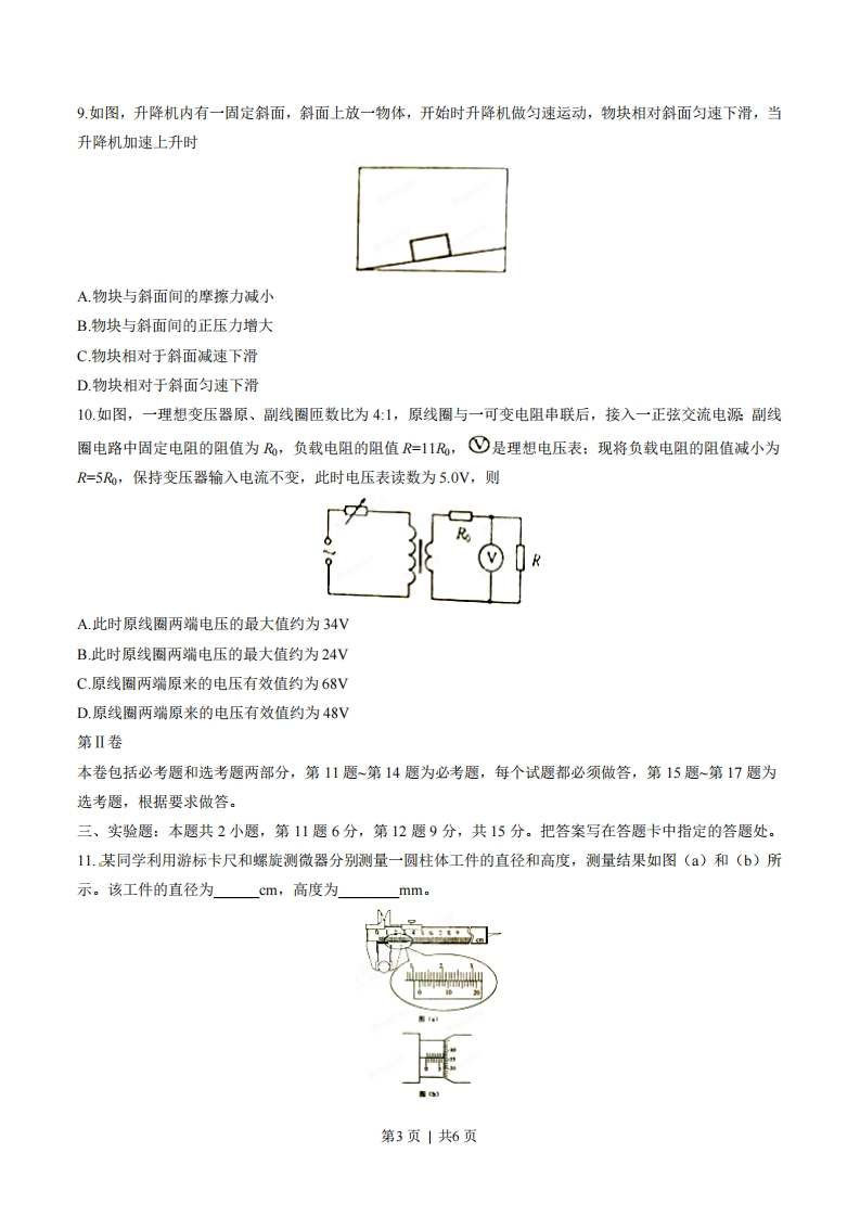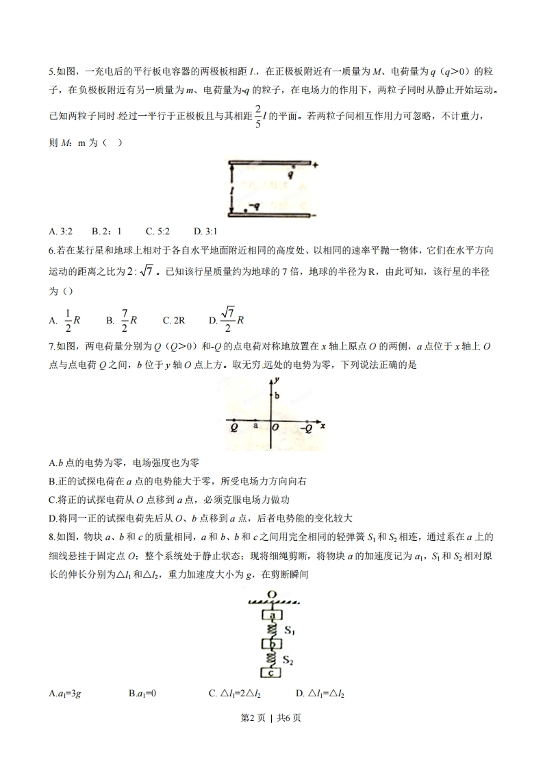 2015年普通高等学校招生全国统一考试物理(海南卷)一、单项选择题:本题共6小题,每小题3分,共18分。在每小题给出的四个选项中,只有一项是符合题目要求的。1如图,a是竖直平面P上的一点,P前有,一条形磁铁垂直于P,,且S极朝向a点,P后一电子在偏转线圈和条形磁铁的磁场的共同作用下,在水平面内向右弯曲经过α点。在电子经过α点的瞬间。条形磁铁的磁场对该电子的作用力的方向()..A.向上B.向下C.向左D.向右2如图,空间有一匀强磁场,一直金属棒与磁感应强度方向垂直,当它以速度ⅴ沿与棒和磁感应强度都垂直的方向运动时,棒两端的感应电动势大小8,将此棒弯成两段长度相等且相互垂直的折弯,置于磁感应强度相垂直的平面内,当它沿两段折线夹角平分线的方向以速度v运动时,棒两端的感应电动势大小为£',则三等于()××X×1×X×+A.1/2B.迈C.1D.√23假设摩托艇受到的阻力的大小正比于它的速率。如果摩托艇发动机的输出功率变为原来的2倍,则摩托艇的最大速率变为原来的()A.4倍B.2倍C.V3倍D.√2倍4.如图,一半径为R的半圆形轨道竖直固定放置,轨道两端登高。质量为m的质点自轨道端点P由静止开始滑下,滑到最低点Q时,对轨道的正压力为2mg,重力加速度大小为g,质点自P滑到Q的过程中,克服摩擦力所做的功为()11πA.mgRB.C.-mgRD.4mgR4第1页|共6页5如图,一充电后的平行板电容器的两极板相距1,在正极板附近有一质量为M、电荷量为q(q>0)的粒子,在负极板附近有另一质量为m、电荷量为-q的粒子,在电场力的作用下,两粒子同时从静止开始运动。己知两粒子同时经过一平行于正极板且与其相距1的平面。若两粒子间相互作用力可忽略,不计重力,则Mm为()A.3:2B.2:1C.5:2D.3:16若在某行星和地球上相对于各自水平地面附近相同的高度处、以相同的速率平抛一物体,它们在水平方向运动的距离之比为2:√7。己知该行星质量约为地球的7倍,地球的半径为R,由此可知,该行星的半径为()A.RB.2RC.2R27.如图,两电荷量分别为Q(Q>0)和-Q的点电荷对称地放置在x轴上原点O的两侧,a点位于x轴上O点与点电荷Q之间,b位于y轴O点上方。取无穷远处的电势为零,下列说法正确的是A.b点的电势为零,电场强度也为零B.正的试探电荷在a点的电势能大于零,所受电场力方向向右C.将正的试探电荷从O点移到α点,必须克服电场力做功D.将同一正的试探电荷先后从O、b点移到a点,后者电势能的变化较大8.如图,物块a、b和c的质量相同,a和b、b和c之间用完全相同的轻弹簧S1和S2相连,通过系在a上的细线悬挂于固定点O:整个系统处于静止状态:现将细绳剪断,将物块α的加速度记为1,S,和S2相对原长的伸长分别为△山1和△2,重力加速度大小为g,在剪断瞬间写S,号52cA.a1=3gB.a1=0C.△11=2△12D.△I1=△12第2页|共6页9.如图,升降机内有一固定斜面,斜面上放一物体,开始时升降机做匀速运动,物块相对斜面匀速下滑,当升降机加速上升时A.物块与斜面间的摩擦力减小B.物块与斜面间的正压力增大C.物块相对于斜面减速下滑D.物块相对于斜面匀速下滑10.如图,一理想变压器原、副线圈匝数比为4:1,原线圈与一可变电阻串联后,接入一正弦交流电源副线圈电路中固定电阻的阻值为R,负载电阻的阻值R=I1R,)是理想电压表:现将负载电阻的阻值减小为R=5R,保持变压器输入电流不变,此时电压表读数为5.0V,则A.此时原线圈两端电压的最大值约为34VB.此时原线圈两端电压的最大值约为24VC.原线圈两端原来的电压有效值约为68VD.原线圈两端原来的电压有效值约为48V第Ⅱ卷本卷包括必考题和选考题两部分,第11题~第14题为必考题,每个试题都必须做答,第15题~第17题为选考题,根据要求做答。三、实验题:本题共2小题,第11题6分,第12题9分,共15分。把答案写在答题卡中指定的答题处.11.某同学利用游标卡尺和螺旋测微器分别测量一圆柱体工件的直径和高度,测量结果如图(a)和(b)所示。该工件的直径为cm,高度为mm第3页|共6页