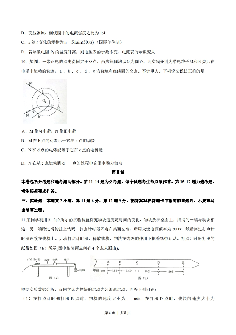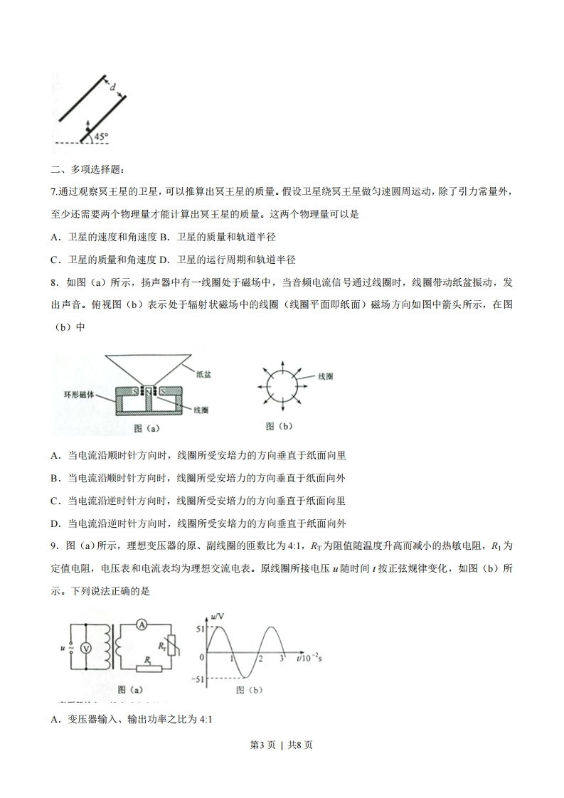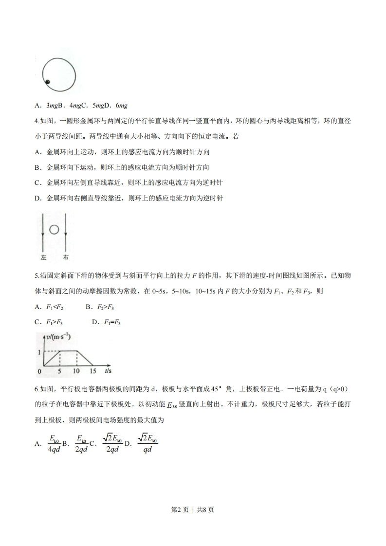 绝密★启用前2016年普通高等学校招生全国统一考试物理注意事项:1本试卷分第I卷(选择题)和第Ⅱ卷(非选择题)两部分。答卷前,考生务必将自己的姓名、准考证号填写在答题卡上。2回答第【卷时,选出每小题答案后,用铅笔把答题卡上对应题目的答案标号涂黑。如需改动,用橡皮擦干净后,再选涂其他答案标号。写在本试卷上无效。3.回答第Ⅱ卷时,将答案写在答题卡上。写在本试卷上无效。4.考试结束后,将本试卷和答题卡一并交回。第I卷一、单项选择题:本题共6小题,每小题3分。在每小题给出的四个选项中,只有一项是符合题目要求的。1在地面上方某一点将一小球以一定的初速度沿水平方向抛出,不计空气阻力,则小球在随后的运动中A.速度和加速度的方向都在不断变化B.速度与加速度方向之间的夹角一直减小C.在相等的时间间隔内,速率的该变量相等D.在相等的时间间隔内,动能的改变量相等2.如图,在水平桌面上放置一斜面体P,两长方体物块α和b叠放在P的斜面上,整个系统处于静止状态。若将a和b、b与P、P与桌面之间摩擦力的大小分别用万、f6和5表示。则A.f=0,f0,f0B.0,=0,f5=0C.万0,f0,f5-0D.i0,0,f03.如图,光滑圆轨道固定在竖直面内,一质量为m的小球沿轨道做完整的圆周运动。己知小球在最低点时对轨道的压力大小为N,在高点时对轨道的压力大小为N2,重力加速度大小为g,则N-N2的值为第1页|共8页A.3mgB.4mgC.5mgD.6mg4如图,一圆形金属环与两固定的平行长直导线在同一竖直平面内,环的圆心与两导线距离相等,环的直径小于两导线间距。两导线中通有大小相等、方向向下的恒定电流。若A.金属环向上运动,则环上的感应电流方向为顺时针方向B.金属环向下运动,则环上的感应电流方向为顺时针方向C.金属环向左侧直导线靠近,则环上的感应电流方向为逆时针D.金属环向右侧直导线靠近,则环上的感应电流方向为逆时针左5.沿固定斜面下滑的物体受到与斜面平行向上的拉力F的作用,其下滑的速度时间图线如图所示。己知物体与斜面之间的动摩擦因数为常数,在05s,5~10s,10-15s内F的大小分别为F1、F2和F3,则A.F1F3C.F>F3D.F=F34l(m-5051015s6.如图,平行板电容器两极板的间距为d,极板与水平面成45°角,上极板带正电。一电荷量为q(q>0)的粒子在电容器中靠近下极板处。以初动能E。竖直向上射出。不计重力,极板尺寸足够大,若粒子能打到上极板,则两极板间电场强度的最大值为A.Exo-B.C.Eu D.EuE-C.4gd2gd2gdqd第2页|共8页二、多项选择题:7通过观察冥王星的卫星,可以推算出冥王星的质量。假设卫星绕冥王星做匀速圆周运动,除了引力常量外,至少还需要两个物理量才能计算出冥王星的质量。这两个物理量可以是A.卫星的速度和角速度B.卫星的质量和轨道半径C.卫星的质量和角速度D.卫星的运行周期和轨道半径8.如图(a)所示,扬声器中有一线圈处于磁场中,当音频电流信号通过线圈时,线圈带动纸盆振动,发出声音。俯视图(b)表示处于辐射状磁场中的线圈(线圈平面即纸面)磁场方向如图中箭头所示,在图(b)中纸环形磁体线圈图(a)图(b)A.当电流沿顺时针方向时,线圈所受安培力的方向垂直于纸面向里B.当电流沿顺时针方向时,线圈所受安培力的方向垂直于纸面向外C.当电流沿逆时针方向时,线圈所受安培力的方向垂直于纸面向里D.当电流沿逆时针方向时,线圈所受安培力的方向垂直于纸面向外9.图(a)所示,理想变压器的原、副线圈的匝数比为4:1,RT为阻值随温度升高而减小的热敏电阻,R1为定值电阻,电压表和电流表均为理想交流电表。原线圈所接电压随时间t按正弦规律变化,如图(b)所示。下列说法正确的是-51图(a)图(b)A.变压器输入、输出功率之比为4:1第3页|共8页