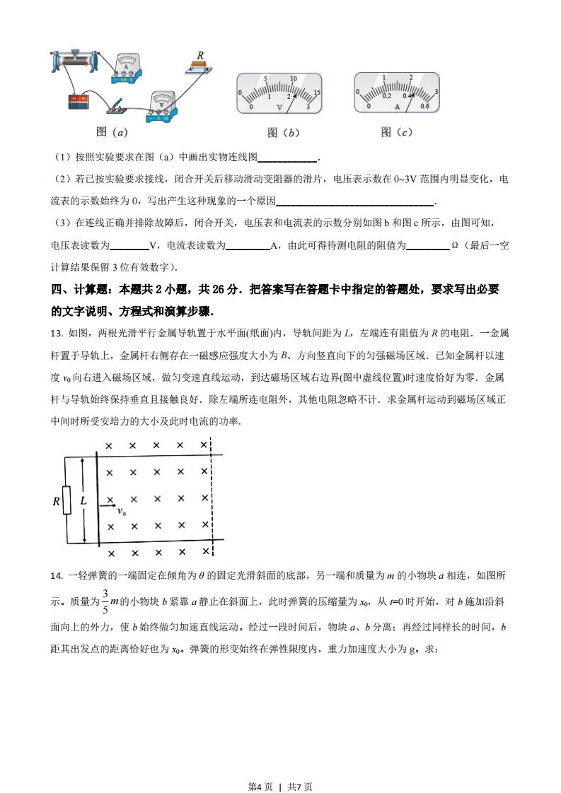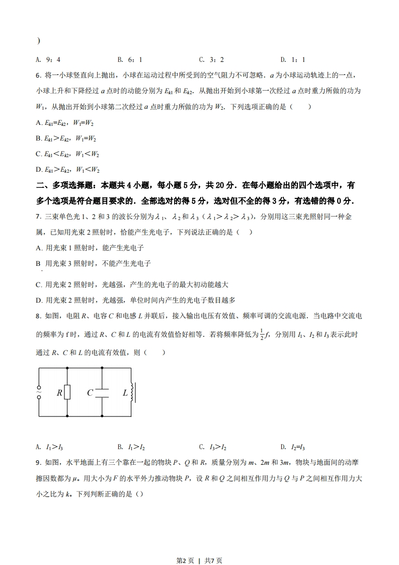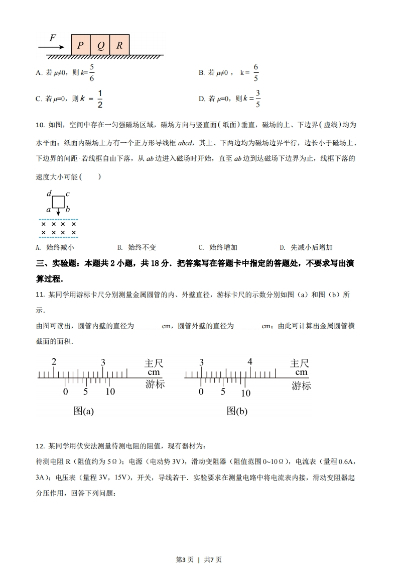 海南省2017年高考物理试卷一、单项选择题:本题共6小题,每小题4分,共24分.在每小题给出的四个选项中,只有一项是符合题目要求的1.光滑水平桌面上有A、B两个物块,B的质量是A的倍.将一轻弹簧置于A、B之间,用外力缓慢压A、B,撤去外力后,A、B开始运动,A和B的动量大小的比值为()A.1B.1/mC.nD.n22.关于静电场的电场线,下列说法正确的是()A.电场强度较大的地方电场线一定较密B沿电场线方向,电场强度一定越来越小C.沿电场线方向,电势一定越来越低D.电场线一定是带电粒子在电场中运动的轨迹3.汽车紧急刹车后,停止运动的车轮在水平地面上滑动直至停止,在地面上留下的痕迹称为刹车线。由刹车线的长短可知汽车刹车前的速度。己知汽车刹车减速运动的加速度大小为8.0m/s2,测得刹车线长25m。汽车在刹车前的瞬间的速度大小为()A.10m/sB.15m/sC.20m/sD.30m/s4.如图,平行板电容器的两极板竖直放置并分别与电源的正负极相连,一带电小球经绝缘轻绳悬挂于两极板之间,处于静止状态现保持右极板不动,将左极板向左缓慢移动关于小球所受的电场力大小F和绳子的拉力大小T,下列判断正确的是W业A.F逐渐减小,T逐渐减小B.F逐渐增大,T逐渐减小C.F逐渐减小,T逐渐增大D.F逐渐增大,T逐渐增大5.己知地球质量为月球质量的81倍,地球半径约为月球半径的4倍.若在月球和地球表面同样高度处,以相同的初速度水平抛出物体,抛出点与落地点间的水平距离分别为S月和5地,则S月:S地约为(第1页1共7页)A.9:4B.6:1C.3:2D.1:16.将一小球竖直向上抛出,小球在运动过程中所受到的空气阻力不可忽略.α为小球运动轨迹上的一点,小球上升和下降经过a点时的动能分别为E!和E2,从抛出开始到小球第一次经过a点时重力所做的功为W1,从抛出开始到小球第二次经过a点时重力所做的功为W2.下列选项正确的是()A.EM=E2,Wi=W2B.E>E2,Wi=W2C.EE,W1九2>元3),分别用这三束光照射同一种金属,己知用光束2照射时,恰能产生光电子,下列说法正确的是()A.用光束1照射时,能产生光电子B用光束3照射时,不能产生光电子C.用光束2照射时,光越强,产生的光电子的最大初动能越大D.用光束2照射时,光越强,单位时间内产生的光电子数目越多8.如图,电阻R、电容C和电感L并联后,接入输出电压有效值、频率可调的交流电源.当电路中交流电的频率为「时,通过R、C和L的电流有效值恰好相等.若将频率降低为,,分别用4、2和表示此时通过R、C和L的电流有效值,则()A.1>5B.I>2C.3>2D.I2=9.如图,水平地面上有三个靠在一起的物块P、Q和R,质量分别为m、2m和3m,物块与地面间的动摩擦因数都为“。用大小为F的水平外力推动物块P,设R和Q之间相互作用力与Q与P之间相互作用力大小之比为k。下列判断正确的是()第2页1共7页P oR777777777777777777777777777777A.若0,则K=36B.若0,k=651C.若0,则K=D.若0,则k=510.如图,空间中存在一匀强磁场区域,磁场方向与竖直面(纸面)垂直,磁场的上、下边界(虚线)均为水平面:纸面内磁场上方有一个正方形导线框abcd,其上、下两边均为磁场边界平行,边长小于磁场上、下边界的间距·若线框自由下落,从ab边进入磁场时开始,直至ab边到达磁场下边界为止,线框下落的速度大小可能(XXXX××××A.始终减小B.始终不变C.始终增加D.先减小后增加三、实验题:本题共2小题,共18分。把答案写在答题卡中指定的答题处,不要求写出演算过程。11.某同学用游标卡尺分别测量金属圆管的内、外壁直径,游标卡尺的示数分别如图(a)和图(b)所示由图可读出,圆管内壁的直径为cm,圆管外壁的直径为cm:由此可计算出金属圆管横截面的面积3主尺4主尺cmcm游标010游标10图(a)图b)12.某同学用伏安法测量待测电阻的阻值,现有器材为:待测电阻R(阻值约为5Q):电源(电动势3V),滑动变阻器(阻值范围0~10Ω),电流表(量程0.6A,3A):电压表(量程3V,15V),开关,导线若干,实验要求在测量电路中将电流表内接,滑动变阻器起分压作用,回答下列问题:第3页1共7页