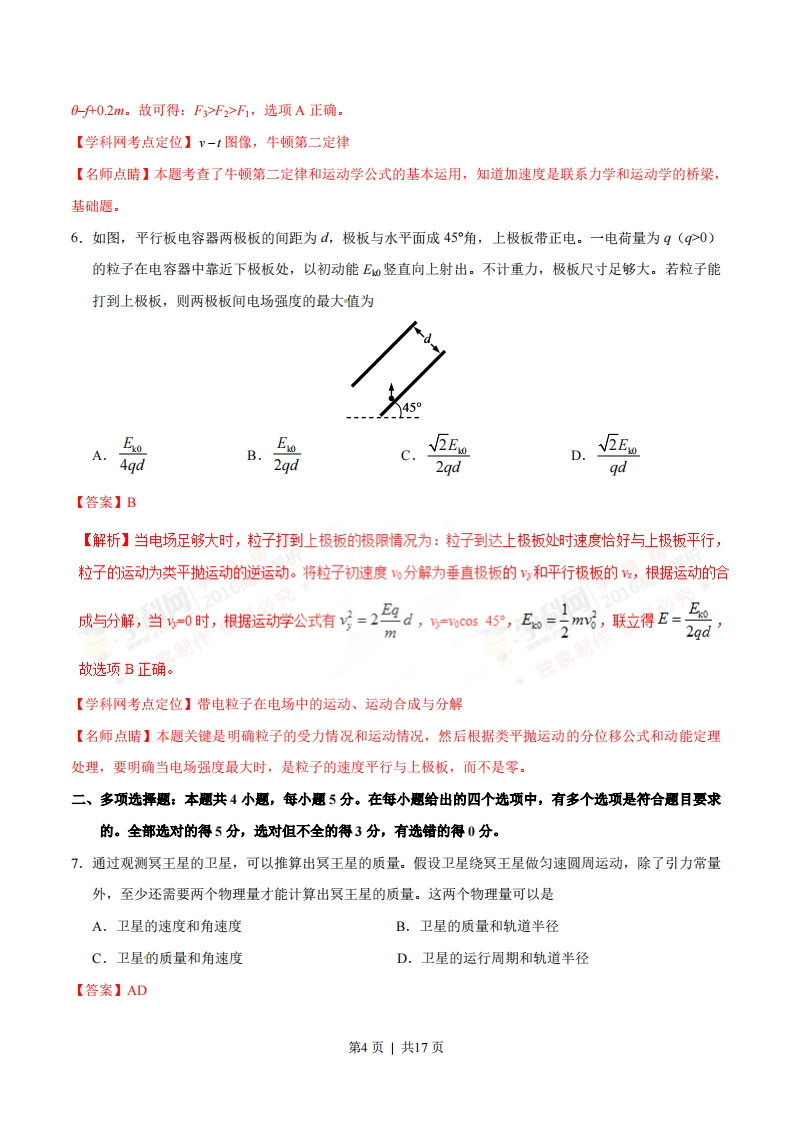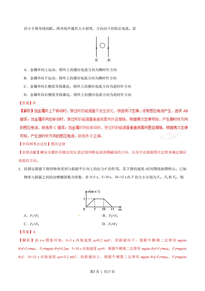 绝密★启用前2016年普通高等学校招生全国统一考试物理注意事项:1.本试卷分第I卷(选择题)和第Ⅱ卷(非选择题)两部分。答卷前,考生务必将自己的姓名、准考证号填写在答题卡上。2.回答第I卷时,选出每小题答案后,用铅笔把答题卡上对应题目的答案标号涂黑。如需改动,用橡皮擦干净后,再选涂其他答案标号。写在本试卷上无效。3.回答第Ⅱ卷时,将答案写在答题卡上。写在本试卷上无效。4.考试结束后,将本试卷和答题卡一并交回。第I卷一、单项选择题本题共6小题,每小题3分。在每小题给出的四个选项中,只有一项是符合题目要求的。1.在地面上方某点将一小球以一定的初速度沿水平方向抛出,不计空气阻力,则小球在随后的运动中,A.速度和加速度的方向都在不断变化B.速度与加速度方向之间的夹角一直减小、C.在相等的时间间隔内,速率的改变量相等D.在相等的时间间隔内,动能的改变量相等【答案】B【解析】由于物体只受重力作用,做平运动,故加速度不变,速度大小和方向时刻在变化,选项A错误;设菜时刻速度与竖直方向肤角力6,则如8-号云,随着时间:变大,m0变小,0变小,故法项B正确根据加速废定义式Q=-8,则△g丛,即在相等的时间间隔内,速度的改变量相等,故选项C错误)根据动能定理,在相等的时间间隔内,动能的改变量等于重力做的功,即WG=gh,对于平抛运动,由于在竖直方向上,在相等时间间隔内的位移不相等,故选项D错误。【学科网考点定位】平抛运动、动能定理【名师点睛】解决本题的关键知道平抛运动在水平方向和竖直方向上的运动规律,结合加速度公式和动能第1页|共17页定理公式灵活求解即可。2.如图,在水平桌面上放置一斜面体P,两长方体物块a和b叠放在P的斜面上,整个系统处于静止状态。若将a和b、b与P、P与桌面之间摩擦力的大小分别用、和5表示。则77777777A.f=0,f0,f0B.0,=0,=0C.f0,0,f-0D.0,0,50【答案】C【解析】对整体受力分析可知,整体相对地面没有相对运动趋势,故=0;再将α和b看成一个整体,a、b整体有相对斜面向下运动的趋势,故6与P之间有摩擦力,即0;再对a受力分析可知,a相对于b有向下运动的趋势,a和b之间存在摩擦力作用,即0。选项C正确。【学科网考点定位】共点力的平衡、整体法、隔离法【名师点睛】“整体隔离法”是力学中的重要方法,一定要熟练掌握,注意对于由多个物体组成的系统,不涉及内力时优先考虑以整体为研究对象。3.如图,光滑圆轨道固定在竖直面内,一质量为m的小球沿轨道做完整的圆周运动。已知小球在最低点时对轨道的压力大小为N1,在高点时对轨道的压力大小为N2。重力加速度大小为g,则N一N2的值为A.3mgB.4mg。C.5mgD.6mg【答案】D【解析】设小球在最低点时速度为,在最高点时速度为2,根据牛顿第二定律有,在最低点:Nmg严,在最高点:Nmg2中从最高点到最低点,根据动能定理有mg2Rm_m,联立R22可得:N-N6mg,故选项D正确。【学科网考点定位】牛顿第二定律、动能定理【名师点睛】解决本题的关键知道向心力的来源,知道最高点的临界情况,通过动能定理和牛顿第二定律进行求解.4.如图,一圆形金属环与两固定的平行长直导线在同一竖直平面内,环的圆心与两导线距离相等,环的直第2页|共17页径小于两导线间距。两导线中通有大小相等、方向向下的恒定电流。若左右A,金属环向上运动,则环上的感应电流方向为顺时针方向B.金属环向下运动,则环上的感应电流方向为顺时针方向C.金属环向左侧直导线靠近,则环上的感应电流方向为逆时针方向D.金属环向右侧直导线靠近,则环上的感应电流方向为逆时针方向【答案】D【解析】当金属环上下移动时,穿过环的磁通量不发生变化,根据楞次定律,没有感应电流产生,选项AB错误;当金属环向左移动时,穿过环的磁通量垂直纸面向外且增强,根据楞次定律可知,产生顺时针方向的感应电流,故选项C错误;当金属环向右移动时,穿过环的通量垂直纸面向里且增强,根据楞次定律可知,产生逆时针方向的感应电流,故选项D正确。【学科网考点定位】楞次定律【名师点睛】解决本题的关键会用安培定则判断电流周围磁场的方向,以及学会根据楞次定律来确定感应电流的方向。5.沿固定斜面下滑的物体受到与斜面平行向上的拉力F的作用,其下滑的速度-时间图线如图所示。己知物体与斜面之间的动摩擦因数为常数,在05s、5~10s、10~15s内F的大小分别为F1、F2和F3,则4/(m's)051015sA.F1F3C.F>F3D.F=F3【答案】A【解析】由-1图象可知,0-5s内加速度a1=0.2m/92,沿斜面向下,根据牛顿第二定律有mgin0-人F=ma1,F=mngsin0--0.2m:5-10s内加速度a0,根据牛顿第二定律有mngsin0千F2ma2,F=ngsin0-子:10-15s内加速度a=0.2m/s2,沿斜面向上,根据牛顿第二定律有ngsin0-fF=ma3,F=mngsin第3页|共17页