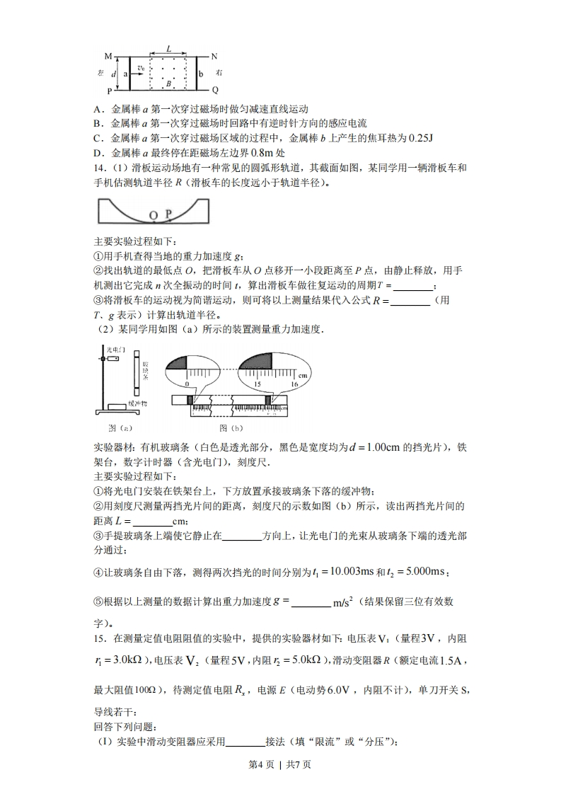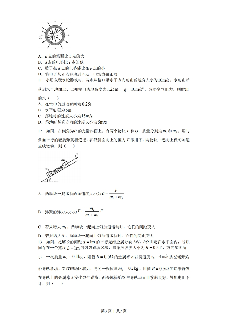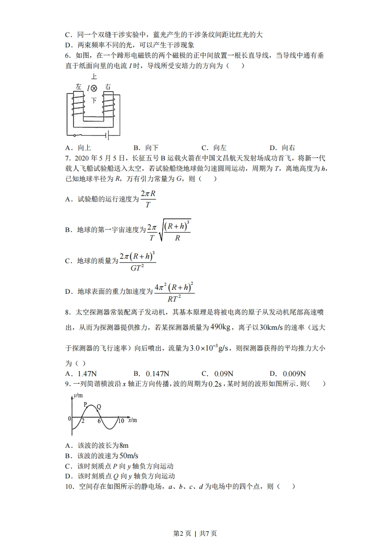 2020年海南省高考物理试卷1.100年前,卢瑟福猜想在原子核内除质子外还存在着另一种粒子X,后来科学家用粒子轰击铍核证实了这一猜想,该核反应方程为:He+?Be→。C+mX,则()A.m=1,n=0,X是中子B.m=1,n=0,X是电子C.m=0,n=1,X是中子D.m=0,n=1,X是电子2.如图,上网课时小明把手机放在斜面上,手机处于静止状态。则斜面对手机的()A.支持力竖直向上B.支持力小于手机所受的重力C.摩擦力沿斜面向下D.摩擦力大于手机所受的重力沿斜面向下的分力3.图甲、乙分别表示两种电流的波形,其中图乙所示电流按正弦规律变化,分别用I1和I2表示甲和乙两电流的有效值,则()TA.I1:I2=2:1B.I:I2=1:2C.I:12=W2D.I:I=√2:14.一车载加热器(额定电压为24V)发热部分的电路如图所示,a、b、c是三个接线端点,设ab、ac、bc间的功率分别为P、P、Re,则()9A.Pst PbeB.Pb =PeC.Pe=PbeD.P