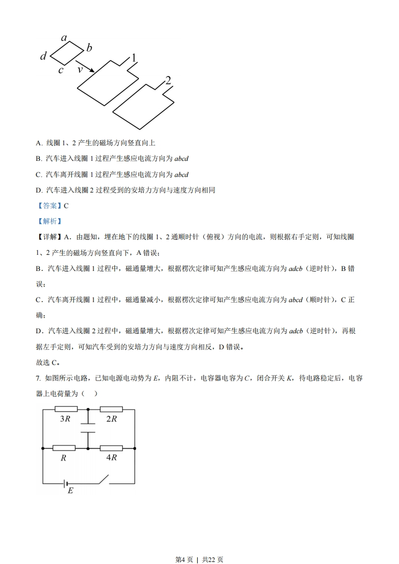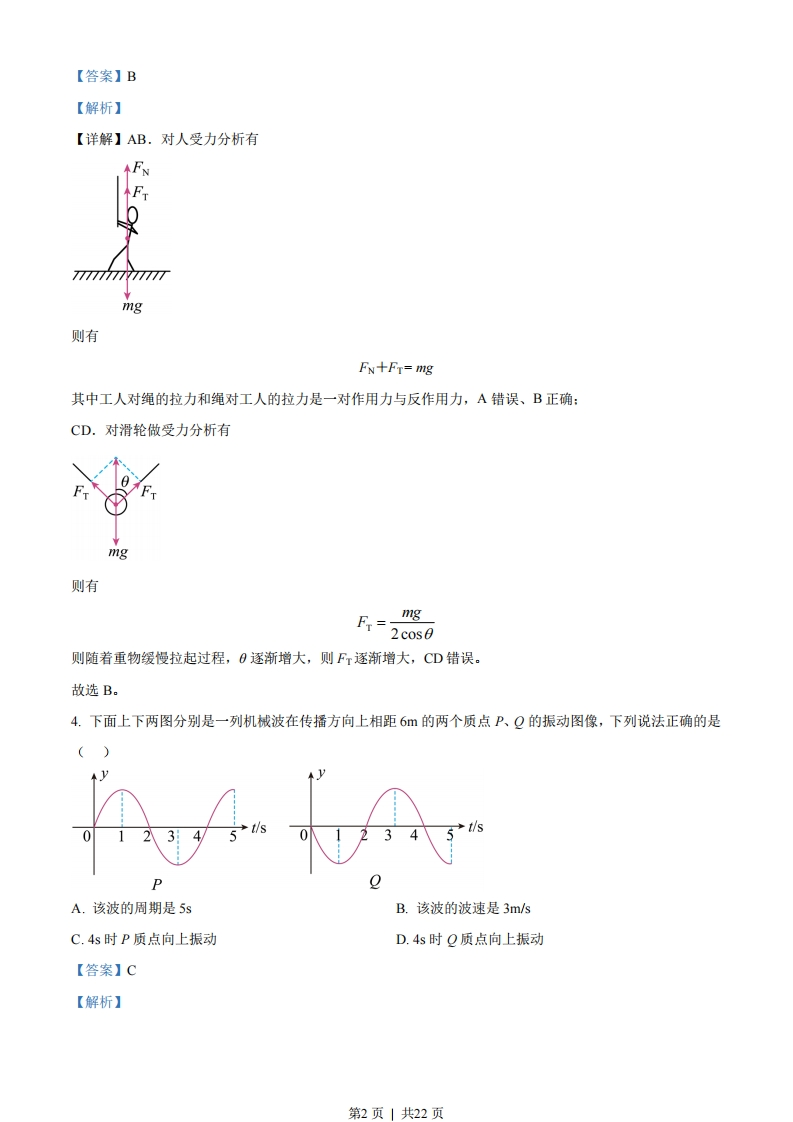 2023年海南省普通高等学校招生选择性考试物理一、单项选择题,每题3分,共24分1.钍元素衰变时会放出B粒子,其中B粒子是()A中子B.质子C.电子D.光子【答案】C【解析】【详解】放射性元素衰变时放出的三种射线a、B、y分别是氨核流、电子流和光子流。故选C。2.如图所示,带正电的小球竖直向下射入垂直纸面向里的匀强磁场,关于小球运动和受力说法正确的是()⊕十BXX i XXXXXXA.小球刚进入磁场时受到的洛伦兹力水平向右B.小球运动过程中的速度不变C.小球运动过程的加速度保持不变D.小球受到的洛伦兹力对小球做正功【答案】A【解析】【详解】A.根据左手定则,可知小球刚进入磁场时受到的洛伦兹力水平向右,A正确:BC.小球受洛伦兹力和重力的作用,则小球运动过程中速度、加速度大小,方向都在变,BC错误:D.洛仑兹力永不做功,D错误。故选A。3.如图所示,工人利用滑轮组将重物缓慢提起,下列说法正确的是()7777777777777777777777777A.工人受到的重力和支持力是一对平衡力B.工人对绳的拉力和绳对工人的拉力是一对作用力与反作用力C.重物缓慢拉起过程,绳子拉力变小D.重物缓慢拉起过程,绳子拉力不变第1页」共22页【答案】B【解析】【详解】AB.对人受力分析有mg则有FN+FT=mg其中工人对绳的拉力和绳对工人的拉力是一对作用力与反作用力,A错误、B正确:CD.对滑轮做受力分析有mg则有则随着重物缓慢拉起过程,0逐渐增大,则F逐渐增大,CD错误。故选B。4.下面上下两图分别是一列机械波在传播方向上相距6m的两个质点P、Q的振动图像,下列说法正确的是()t/s3A.该波的周期是5sB.该波的波速是3m/sC.4s时P质点向上振动D.4s时Q质点向上振动【答案】C【解析】第2页|共22页【详解】A.由振动图像可看出该波的周期是4s,A错误:B.由于Q、P两个质点根动反相,则可知两者间距离等于n+2)=6m,n=0,1,2,…根据九3v=T-2n+1m/s,n=0,1,2,…B错误:C.由P质点的振动图像可看出,在4s时P质点在平衡位置向上振动,C正确:D.由Q质点的振动图像可看出,在4s时Q质点在平衡位置向下振动,D错误。故选C。5.下列关于分子力和分子势能的说法正确的是()6A.分子间距离大于%时,分子间表现为斥力B.分子从无限远靠近到距离%处过程中分子势能变大C.分子势能在%处最小D.分子间距离小于o且减小时,分子势能在减小【答案】C【解析】【详解】分子间距离大于,分子间表现为引力,分子从无限远靠近到距离”处过程中,引力做正功,分子势能减小,则在%处分子势能最小:继续减小距离,分子间表现为斥力,分子力做负功,分子势能增大。故选C。6.汽车测速利用了电磁感应现象,汽车可简化为一个矩形线圈abcd,埋在地下的线圈分别为1、2,通上顺时针(俯视)方向电流,当汽车经过线圈时()第3页」共22页