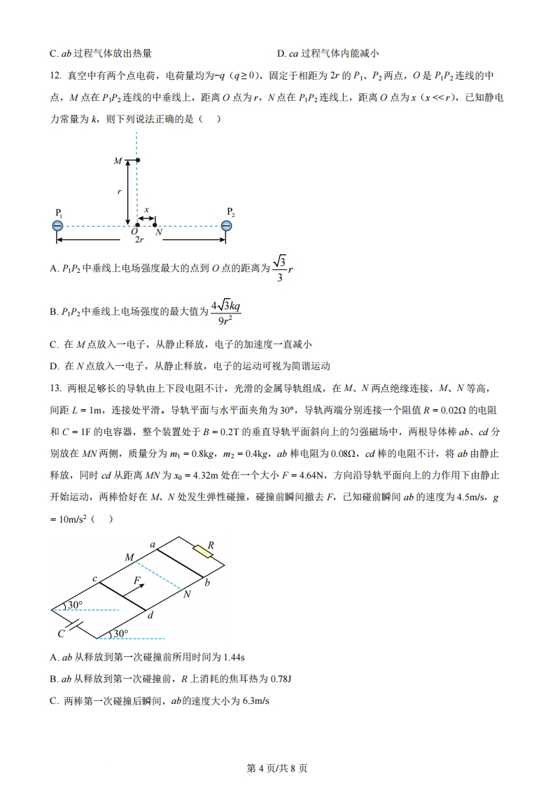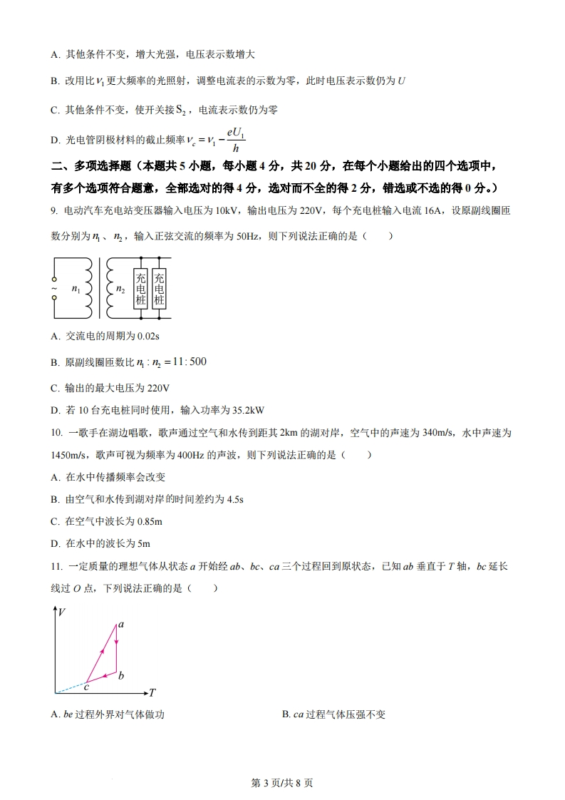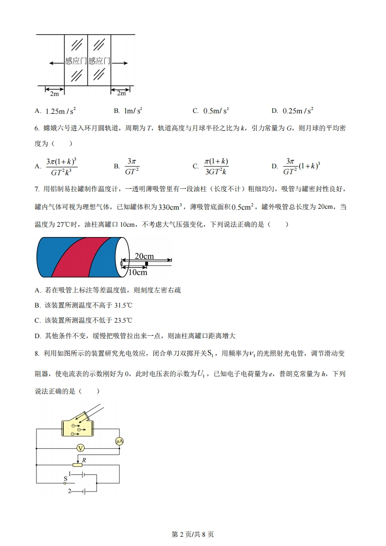 2024年海南省高考物理试题一、单选题(本题共8小题,每小题3分,共24分。在每个小题给出的四个选项中,只有一个选项符合题意)1.神舟十七号载人飞船返回舱于2024年4月30日在东风着陆场成功着陆,在飞船返回至离地面十几公里时打开主伞飞船快速减速,返回舱速度大大减小,在减速过程中()A.返回舱处于超重状态B.返回舱处于失重状态C.主伞的拉力不做功D.重力对返回舱做负功2.人工核反应0Si+H→X+0P中的X是(A.中子B.质子C.电子D.a粒子3.在跨越河流表演中,一人骑车以25m/s的速度水平冲出平台,恰好跨越长x=25m的河流落在河对岸平台上,己知河流宽度25m,不计空气阻力,取g=10m/s2,则两平台的高度差h为()25mA0.5mB.5mC.10mD.20m4.一正三角形OPQ玻璃砖,某束光线垂直火OP射入,恰好在PQ界面发生全反射,则玻璃砖的折射率oA.B.√5c.25D.235.商场自动感应门如图所示,人走进时两扇门从静止开始同时向左右平移,经4s恰好完全打开,两扇门移动距离均为2m,若门从静止开始以相同加速度大小先匀加速运动后匀减速运动,完全打开时速度恰好为0,则加速度的大小为()第1页共8页感应门感应A.1.25m/s2B.1m/s2c.0.5m/s2D.0.25m/s26.嫦娥六号进入环月圆轨道,周期为T,轨道高度与月球半径之比为k,引力常量为G,则月球的平均密度为()3π(1+k)33πB.C.π(1+k)D.GT2kG723GTk品+7.用铝制易拉罐制作温度计,一透明薄吸管里有一段油柱(长度不计)粗细均匀,吸管与罐密封性良好,罐内气体可视为理想气体,己知罐体积为330cm3,薄吸管底面积0.5cm2,罐外吸管总长度为20cm,当温度为27℃时,油柱离罐口10cm,不考虑大气压强变化,下列说法正确的是()20cm10cmA.若在吸管上标注等差温度值,则刻度左密右疏B.该装置所测温度不高于31.5℃C.该装置所测温度不低于23.5℃D.其他条件不变,缓慢把吸管拉出来一点,则油柱离罐口距离增大8.利用如图所示的装置研究光电效应,闭合单刀双掷开关S,,用频率为y的光照射光电管,调节滑动变阻器,使电流表的示数刚好为0,此时电压表的示数为U,己知电子电荷量为,普朗克常量为h,下列说法正确的是()第2页共8页A.其他条件不变,增大光强,电压表示数增大B.改用比更大频率的光照射,调整电流表的示数为零,此时电压表示数仍为UC.其他条件不变,使开关接S,,电流表示数仍为零D.光电管阴极材料的截止频率y.=y-e二、多项选择题(本题共5小题,每小题4分,共20分,在每个小题给出的四个选项中,有多个选项符合题意,全部选对的得4分,选对而不全的得2分,错选或不选的得0分。)9.电动汽车充电站变压器输入电压为10kV,输出电压为220V,每个充电桩输入电流16A,设原副线圈匝数分别为%、乃2,输入正弦交流的频率为50Hz,则下列说法正确的是()电充电桩A.交流电的周期为0.02sB.原副线圈匝数比%:乃2=11:500C.输出的最大电压为220VD.若10台充电桩同时使用,输入功率为35.2kW10.一歌手在湖边唱歌,歌声通过空气和水传到距其2km的湖对岸,空气中的声速为340m/s,水中声速为1450m/s,歌声可视为频率为400Hz的声波,则下列说法正确的是()A.在水中传播频率会改变B.由空气和水传到湖对岸的时间差约为4.5sC.在空气中波长为0.85mD.在水中的波长为5m11.一定质量的理想气体从状态a开始经ab、bc、ca三个过程回到原状态,己知ab垂直于T轴,bc延长线过O点,下列说法正确的是()TA.b过程外界对气体做功B.ca过程气体压强不变第3页/共8页