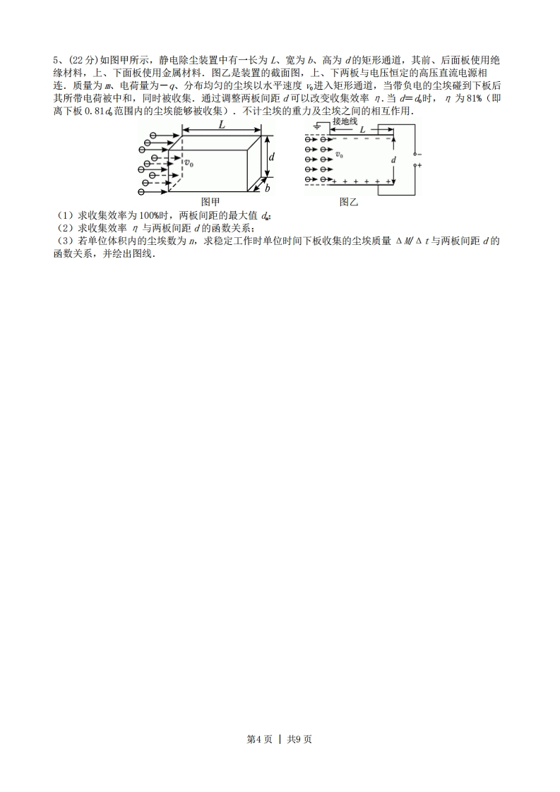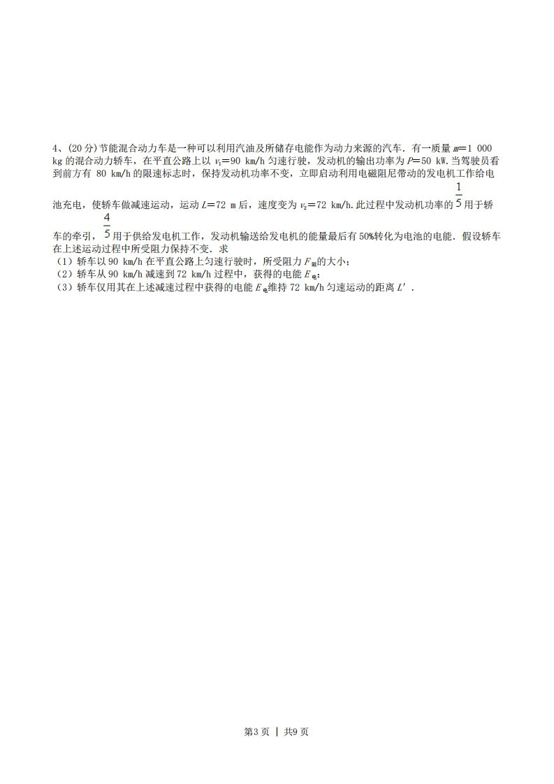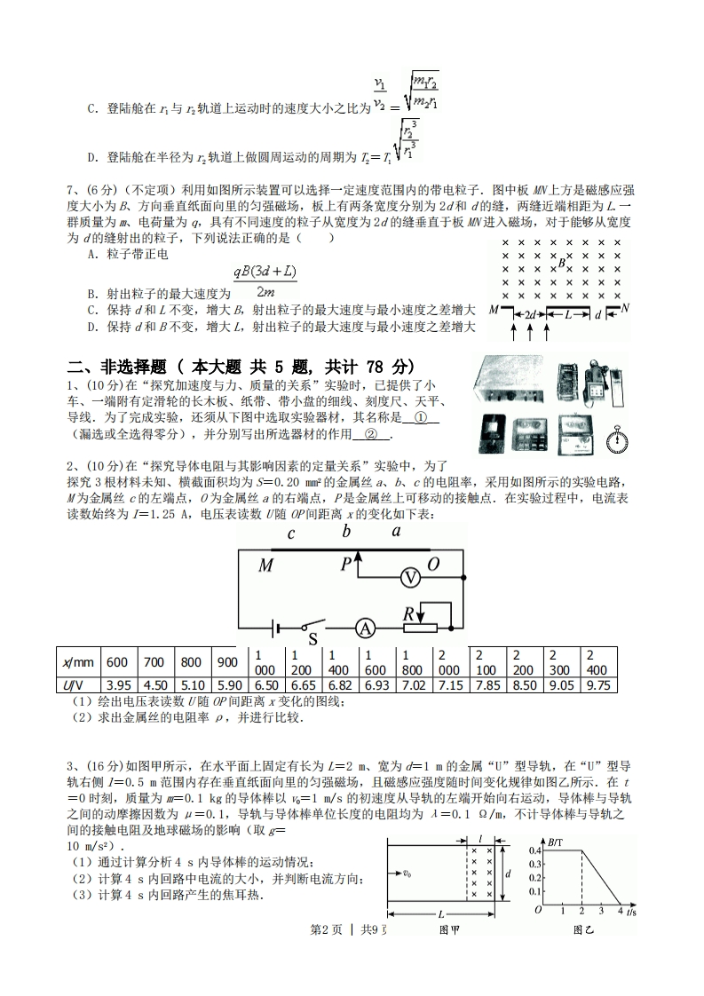 2011年普通高等学校夏季招生考试理科综合能力测试(浙江卷)一、选择题(本大题共7题,共计42分)1、(6分)如图所示,甲、乙两人在冰面上“拔河”,两人中间位置处有一分界线,约定先使对方过分界线者为赢.若绳子质量不计,冰面可看成光滑,则下列说法正确的是(A.甲对绳的拉力与绳对甲的拉力是一对平衡力B.甲对绳的拉力与乙对绳的拉力是作用力与反作用力C.若甲的质量比乙大,则甲能赢得“拔河”比赛的胜利D.若乙收绳的速度比甲快,则乙能赢得“拔河”比赛的胜利2、(6分)关于天然放射现象,下列说法正确的是()777777777777777777分界线A.a射线是由氢原子核衰变产生B.B射线是由原子核外电子电离产生C.Y射线是由原子核外的内层电子跃迁产生D.通过化学反应不能改变物质的放射性3、(6分)如图所示,在铁芯上、下分别绕有匝数=800和,=200的两个线圈,上线圈两端与u=51sin314tV的交流电源相连,将下线圈两端接交流电压表,则交流电压表的读数可能是()A.2.0VB.9.0V12C.12.7VD.144.0V4、(6分)“B超”可用于探测人体内脏的病变状况,如图是超声波从肝脏表面入射,经折射与反射,最后从肝脏表面射出的示意图.超声波在进入肝脏发生折射时遵循的规律与光的折射规律类似,可表述为sin月4sin 2 =V2(式中日,是入射角,02是折射角,、分别是超声波在肝外和肝内的传播速度),超声波在肿瘤表面发生反射时遵循的规律与光的反射规律相同.己知=0.9,入射点与出射点之间的距离是d,入射角为,肿瘤的反射面恰好与肝脏表面平行,则肿瘤离肝脏表面的深度h为()9d sin iA.2W100-81sin2iBdv81-100sin2i肝脏10sinidv81-100sin2i肿瘤C.20sinidv100-81sin2iD.18sini5、(6分)(不定项)关于波动,下列说法正确的是()A.各种波均会发生偏振现象B.用白光做单缝衍射与双缝干涉实验,均可看到彩色条纹C.声波传播过程中,介质中质点的运动速度等于声波的传播速度D.已知地震波的纵波波速大于横波波速,此性质可用于横波的预警6、(6分)(不定项)为了探测X星球,载着登陆舱的探测飞船在以该星球中心为圆心,半径为的圆轨道上运动,周期为T,总质量为m.随后登陆舱脱离飞船,变轨到离星球更近的半径为的圆轨道上运动,此时登陆舱的质量为,则()4r元4元万A.X星球的质量为仁G沉B。X星球表面的重力加速度为感=了第1页|共9页当C.登陆舱在方与轨道上运动时的速度大小之比为片=Vm奶D.登陆舱在半径为轨道上做圆周运动的周期为=?V分7、(6分)(不定项)利用如图所示装置可以选择一定速度范围内的带电粒子.图中板W上方是磁感应强度大小为R方向垂直纸面向里的匀强磁场,板上有两条宽度分别为2d和d的缝,两缝近端相距为L.一群质量为m、电荷量为q,具有不同速度的粒子从宽度为2d的缝垂直于板W进入磁场,对于能够从宽度为d的缝射出的粒子,下列说法正确的是()××××××××A.粒子带正电qB(3d+L)义文g必文×X×XXXXXB.射出粒子的最大速度为2m×X×XXXXXC.保持d和L不变,增大B射出粒子的最大速度与最小速度之差增大M一+2d,L习dFND.保持d和B不变,增大L,射出粒子的最大速度与最小速度之差增大↑↑↑二、非选择题(本大题共5题,共计78分)1、(10分)在“探究加速度与力、质量的关系”实验时,己提供了小车、一端附有定滑轮的长木板、纸带、带小盘的细线、刻度尺、天平、导线.为了完成实验,还须从下图中选取实验器材,其名称是①(漏选或全选得零分),并分别写出所选器材的作用②2、(10分)在“探究导体电阻与其影响因素的定量关系”实验中,为了探究3根材料未知、横截面积均为S=0.20mm的金属丝a、b、c的电阻率,采用如图所示的实验电路,M为金属丝c的左端点,O为金属丝a的右端点,P是金属丝上可移动的接触点.在实验过程中,电流表读数始终为I=1.25A,电压表读数U随OP间距离x的变化如下表:beM力RAxmm600700800900111112222000200400600800000100200300400V3.954.505.105.906.506.656.826.937.027.157.858.509.059.75(1)绘出电压表读数U随OP间距离x变化的图线:(2)求出金属丝的电阻率p,并进行比较.3、(16分)如图甲所示,在水平面上固定有长为L=2m、宽为d=1m的金属“U”型导轨,在“U”型导轨右侧I=0.5m范围内存在垂直纸面向里的匀强磁场,且磁感应强度随时间变化规律如图乙所示.在t=0时刻,质量为=0.1kg的导体棒以%=1m/s的初速度从导轨的左端开始向右运动,导体棒与导轨之间的动摩擦因数为“=0.1,导轨与导体棒单位长度的电阻均为入=0.1Ω/m,不计导体棒与导轨之间的接触电阻及地球磁场的影响(取g=10m/s2).××041BT(1)通过计算分析4s内导体棒的运动情况:0.3(2)计算4s内回路中电流的大小,并判断电流方向:0.2(3)计算4s内回路产生的焦耳热.0.11234第2页丨共9图甲图乙4、(20分)节能混合动力车是一种可以利用汽油及所储存电能作为动力来源的汽车.有一质量三1000kg的混合动力轿车,在平直公路上以=90km/h匀速行驶,发动机的输出功率为P=50kW.当驾驶员看到前方有80km/h的限速标志时,保持发动机功率不变,立即启动利用电磁阻尼带动的发电机工作给电1池充电,使轿车做减速运动,运动L=72m后,速度变为=72km/.此过程中发动机功率的5用于轿4车的牵引,5用于供给发电机工作,发动机输送给发电机的能量最后有50%转化为电池的电能.假设轿车在上述运动过程中所受阻力保持不变.求(1)轿车以90km/h在平直公路上匀速行驶时,所受阻力F的大小:(2)轿车从90km/h减速到72km/h过程中,获得的电能E电:(3)轿车仅用其在上述减速过程中获得的电能E电维持72km/h匀速运动的距离L',第3页|