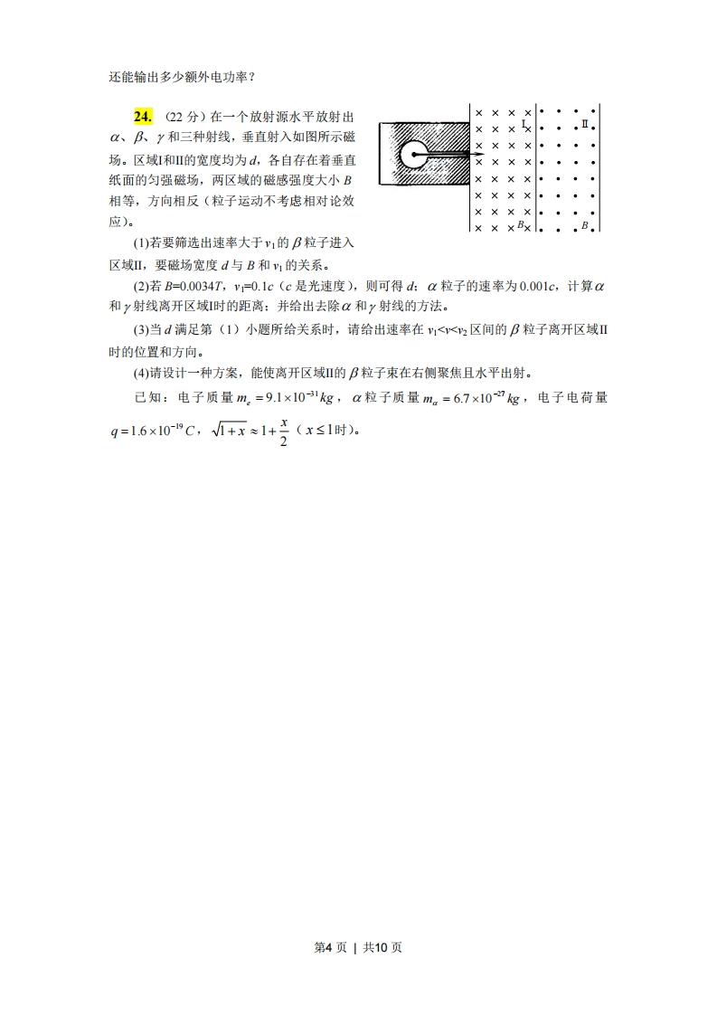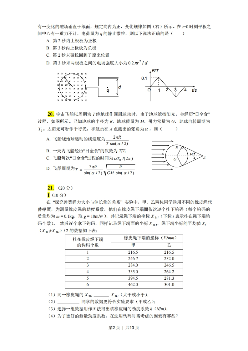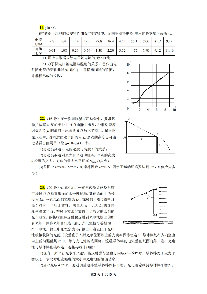 2010年高考浙江理综试卷中物理试题14.如图所示,A、B两物体叠放在一起,以相同的初速度上抛(不计空气阻力)。下列说法正确的是()A.在上升和下降过程中A对B的压力一定为零AB.上升过程中A对B的压力大于A对物体受到的重力BC.下降过程中A对B的压力大于A物体受到的重力D.在上升和下降过程中A对B的压力等于A物体受到的重力15.请用学过的电学知识判断下列说法正确的是()A.电工穿绝缘衣比穿金属衣安全B.制作汽油桶的材料用金属比用塑料好C.小鸟停在单要高压输电线上会被电死D.打雷时,呆在汽车里比呆在木屋里要危险16.在光电效应实验中,飞飞同学用同一光电◆I/A甲管在不同实验条件下得到了三条光电流与电压之间的关系曲线(甲光、乙光、丙光),如图所示。则可判断出()UNA.甲光的频率大于乙光的频率Ue Ua oB.乙光的波长大于丙光的波长C.乙光对应的截止频率大于丙光的截止频率D.甲光对应的光电子最大初动能大于丙光的光电子最大初动能17.某水电站,用总电阻为2.52的输电线输电给500km外的用户,其输出电功率是3×10kW。现用500kV电压输电,则下列说法正确的是()A.输电线上输送的电流大小为2.0×10AB.输电线上由电阻造成的损失电压为15kVC.若改用5kV电压输电,则输电线上损失的功率为9×10kWD.输电线上损失的功率为△P=Pr,U为输电电压,r为输电线的电阻18.在O点有一波源,0时刻开始向上振动,形成向右传播的一列横波。1=4s时,距离O点为3m的A点第一次达到波峰17s时,距离O点为4m的B点第一次达到波谷。则以下说法正确的是()A.该横波的波长为2mB.该横波的周期为4sC.该横波的波速为lm/sD.距离O点为1m的质点第一次开始向上振动的时刻为6s末19.半径为r带缺口的刚性金属圆环在纸面上固定放置,在圆环的缺口两端引出两根导线,分别与两块垂直于纸面固定放置的平行金属板连接,两板间距为d,如图(左)所示。第1页|共10页有一变化的磁场垂直于纸面,规定向内为正,变化规律如图(右)所示。在0时刻平板之间中心有一重力不计,电荷量为q的静止微粒,则以下说法正确的是()A.第2秒内上极板为正极B.第3秒内上极板为负极C.第2秒末微粒回到了原来位置D.第3秒末两极板之间的电场强度大小为0.2m2/dB/TXX x0.1t/s20.宇宙飞船以周期为T绕地球作圆周运动时,由于地球遮挡阳光,会经历“日全食”过程,如图所示。己知地球的半径为R,地球质量为M,引力常量为G,地球自转周期为T。。太阳光可看作平行光,宇航员在A点测出的张角为,则()A.飞船绕地球运动的线速度为2πRT sin(a/2)B.一天内飞船经历“日全食”的次数为TT6C.飞船每次“日全食”过程的时间为αT。(2π)D.飞船周期为T=,2Rsin(a /2)GM sin(a/2)21.(20分)1(10分)在“探究弹簧弹力大小与伸长量的关系”实验中,甲、乙两位同学选用不同的橡皮绳代替弹簧,为测量橡皮绳的劲度系数,他们在橡皮绳下端面依次逐个挂下钩码(每个钩码的质量均为m=0.1kg,取g=10m/g),并记录绳下端的坐标Xm,(下标i表示挂在绳下端钩码个数)。然后逐个拿下钩码,同样记录绳下端面的坐标X,绳下端坐标的平均值X,=(X如+X诚)/2的数据如下表:挂在橡皮绳下端橡皮绳下端的坐标(X,/mm)的钩码个数甲216.5216.52246.7232.03284.0246.54335.0264.2J394.5281.36462.0301.0(1)同一橡皮绳的X如iX城:(大于或小于):(2)同学的数据更符合实验要求(甲或乙):(3)选择一组数据用作图法得出该橡皮绳的劲度系数k(NWm):(4)为了更好的测量劲度系数,在选用钩码时需考虑的因素有哪些?第2页|共10页.(10分)在“描绘小灯泡的伏安特性曲线”的实验中,某同学测得电流-电压的数据如下表所示:电流2.75.412.419.527.836.447.156.169.681.793.2I/mA电压0.040.080.210.541.302.203.524.776.909.1211.46UN(1)用上表数据描绘电压随电流的变化曲线:(2)为了探究灯丝电阻与温度的关系,己作出电10阻随电流的变化曲线如图所示:请指出图线的特征,并解释形成的原因。2681022.(16分)在一次国际城市运动会中,要求运动员从高为H的平台上A点由静止出发,沿着动摩擦因数为滑山的道向下运动到B点后水平滑出,最后落在水池中。设滑道的水平距离为L,B点的高度h可由H运动员自由调节(取g=10m/s2)。求:(1)运动员到达B点的速度与高度h的关系:(2)运动员要达到最大水平运动距离,B点的高度h应调为多大?对应的最大水平距离Smr为多少?(3)若图中-4m,L=5m,动摩擦因数4=0.2,则水平运动距离要达到7m,h值应为多少?23.(20分)如图所示,一矩形轻质柔软反射膜可绕过O点垂直纸面的水平轴转动,其在纸面上的长度为L1,垂直纸面的宽度为L2。在膜的下端(图中A处)挂有一平行于转轴,质量为m,长为L2的导体棒使膜成平面。在膜下方水平放置一足够大的太阳能光电池板,能接收到经反射膜反射到光电池板上的所有光能,并将光能转化成电能。光电池板可等效为一个一电池,输出电压恒定为:输出电流正比于光电池板接收到的光能(设垂直于入射光单位面积上的光功率保持恒定)。导体棒处在方向竖直向上的匀强磁场B中,并与光电池构成回路,流经导体棒的电流垂直纸面向外(注:光电池与导体棒直接相连,连接导线未画出)。(1)现有一束平行光水平入射,当反射膜与竖直方向成日=60°时,导体棒处于受力平衡状态,求此时电流强度的大小和光电池的输出功率。(2)当0变成45°时,通过调整电路使导体棒保持平衡,光电池除维持导体棒平衡外,第3页|共10页