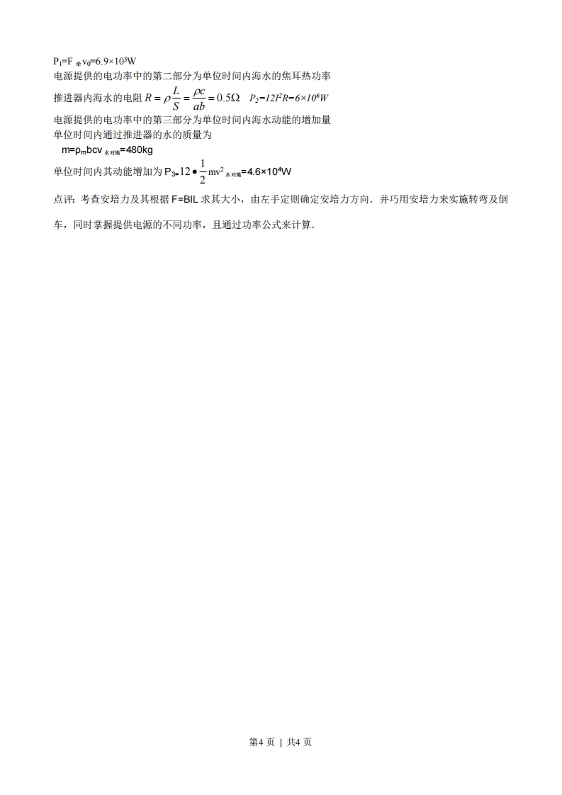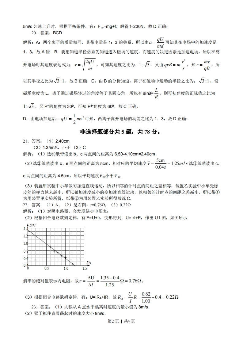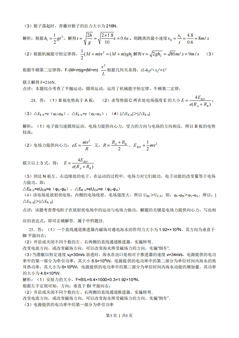 2013年普通高等学校招生全国统一考试理科综合能力测试物理答案(浙江卷)一、选择题(本题4小题。每题6分在每小题给出的四个选项中,只有一项是符合题目要求的。)14.答案:B解析:A、电磁波可以传递信息,如电视信号:声波也可以传递信息,如人说话:故A错误:B、手机用电磁波传递信息,人用声波说话,故B正确:C、太阳光中的可见光是电磁波,真空中为3×10s:“B超”中的超声波是声波,常温下,空气中大约为340m/s:故C错误:D、遥控器发出的红外线波长和医院CT中的X射线频率不同,波速相同,根据C=λf,波长不同,故D错误:15.答案:D解析:根据感应电动势公式E=BLV可知,其他条件不变时,感应电动势与导体的切割速度成正比,只将刷卡速度改为宁,则线圈中产生的感应电动势的最大值将变为原米的宁·磁卡通过刷卡暑的时间1一与1速率成反比,所用时间变为原来的2倍.故D正确16.答案:C解析:当太阳、地球、月球在同一直线上,地球位于太阳与月球之间时,太阳发出的沿直线传播的光被不透明的地球完全挡住,光线照不到月球上,在地球上完全看不到月球的现象就是月全食.看到整个月亮是暗红的,是因为太阳光中的红光经地球大气层折射到月球.故C正确,A、B、D错误.故选C.17.答案:D解析:A、在0-4s内,物体所受的摩擦力为静摩擦力,4s末开始运动,则5s内位移不为零,则拉力做功不为零.故A错误.B、4s末拉力为4N,摩擦力为4N,合力为零.故B错误.C、根据牛顿第二定律得,6s~9s内物体做匀加速直线运动的加速度F--5-3-2m1S/mg,解得==人=言=03。故C错误,D正确,故选D.Q=m12g10二、选择题(本题共3小题。在每小题给出的四个选项中,至少有一个选项是正确,全部选对的得6分,选对但不全的得3分,有选错的得0分。)18.答案:BC小、根据万有引力定律F=G你可知,质量分布均匀的球体何的引力距离「等于两球心间而R为同步卫星距地面的高度,故A错误B、计算卫星与地球间的引力,「应为卫星到地球球心间的距离也就是卫星运行轨道半径「,故B选项正确:=GC、根据几何关系可知,两同步卫星间的距离d=√5,故两卫星间的引力大小为GM伽d23,故C正确:D、卫星对地球的引力均沿卫星地球间的连线向外,由于三颗卫星质量大小相等,对地球的引力大小相等,又因为三颗卫星等间隔分布,根据几何关系可知,地球受到三个卫星的引力大小相等方向成120角,所以合力为0,故D错误19.答案:AD解析:A、从地面刚开始竖直上升时,速度为零,故阻力为零,气球受重力和浮力,根据牛顿第二粒,有:F深-mg=ma解得:F浮=m(g+a)=460×(10+0.5)N=4830N,故A正确:B、气球受重力、浮力和空气阻力,若阻力不变,合力不变,气球匀加速上升,矛盾,故B错误:C、刚开始竖直上升时的加速度为0.5m/s2,气球是变加速运动,加速度逐渐减小,故10s后的速度大小小于5m/s,故C错误:D、以第1页|共4页5ms匀速上升时,根据平衡条件,有:F浮=mg+f,解得仁230N,故D正确:20.答案:BCD解析:A:两个离子的质量相同,其带电量是1:3的关系,所以由a=9可知其在电场中的加速度是md1:3,故A错.B:要想知道半径必须先知道进入磁场的速度,而速度的决定因素是加速电场,所以在离2qU12开电场时其速度表达式为:ⅴ=17m可知其速度之比为:13.又由B=m·知r=%,所gB以其半径之比为√3:1,故B正确.C:由B的分析知道,离子在磁场中运动的半径之比为:√3:1,设<磁场宽度为L,离子通过磁场转过的角度等于其圆心角,所以有si=,则可知角度的正弦值之比为R1:√5,又P*的角度为300,可知P3*角度为60°,故C正确1D:由电场加速后:gU=一m2可知,两离子离开电场的动能之比为1:3,故D正确.非选择题部分共5题,共78分。21.答案:(1)2.40cm(2)125m/s,小于(3)C解析:(1)选②纸带读出b、c两点间的距离为6.50-4.10cm=2.40cm(2)选②纸带读出c、e两点间的距离为5cm,相对应的平均速度下=5cm-1.25m/5选0纸带读出c0.04se两点间的距离为4.5cm,所以平均速度下m小于下@.(3)装置甲实验中小车做匀加速直线运动,所以相邻的计时点的间距之差相等,装置乙实验中小车受橡皮筋的弹力越来越小,所以做加速度减小的变加速直线运动,以相邻的计时点的间距之差减小,所以带①为用装置甲实验所得,纸带②为用装置乙实验所得故选C.22.答案:(1)A:(2)见右图,0.760:(3)0.222.解析:(1)对照电路图,会发现缺少电压表:(2)根据闭合电路欧姆定律,有E=U+r,变形得到:U=+E,作出UH图,如图所示◆UUV00.60.0.51.01.5斜率的绝对值表示内电阻,故”=△U1.35-0.42=0.762:1.25U(3)根据闭合电路欧姆定律,有:U=RA+HR,故R4=二R=0.62-0.4=0.22211.0023.答案:(1)大猴从A点水平跳离时速度的最小值为8s.(2)猴子抓住青藤荡起时的速度大小9ms.第2页|共4页(3)猴子荡起时,青藤对猴子的拉力大小为216N,2×1.8解析:根据么=28,解得1一10=0.6s。则跳离的最小速度,=五=48=8m/5t0.6(2)根据机械能守恒定律得,2M+mr=(M+mg鼽解得v=2gh=VB0m/s=9m1s(3)根据牛顿第二定律得,F-(M+mg=(M+m)二根据几何关系得,亿-4-心联立解得F=216N点评:本题综合考查了平抛运动,圆周运动,运用了机械能守恒定律、牛顿第二定律,24.答:(1)B板电势高于A板:(2)求等势面C所在处电场强度E的大小E=AEKOe(R+Rg)(3)△E左=e(pc-pB),△Ek右=e(0c-pA):(4)I△Ek左>△E制解析:(1)电子做匀速圆周运动,电场力提供向心力,受力的方向与电场的方向相反,所以B板的电势较高:(2)电场力提供向心力:eE=mr又:R=RR,Eo=)m2R22联立以上3式,得:E=AE KOe(R+Rg)(3)到达N板左、右边缘处的电子,在运动的过程中,电场力对它们做功,电子动能的改变量等于电场力做功,即:△EK左=eUcB=e(pc-pB),△EK右=eUcA=e(pc-pA)(4)该电场