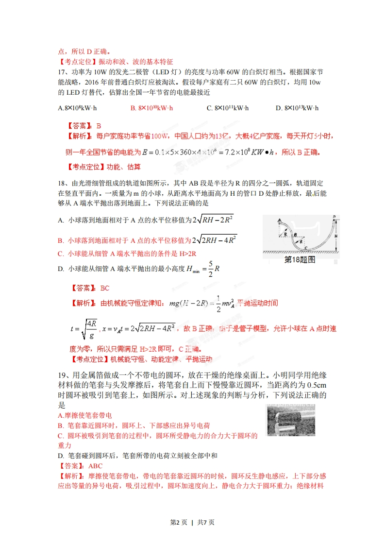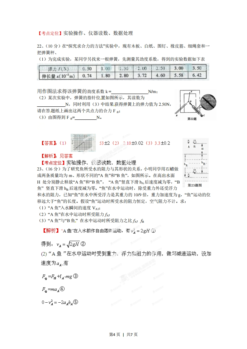 2012年高考浙江理综卷物理部分全卷注重对科学方法、思维能力听科学素养的考核,同时试题的设计和设问方面有所创新,一定数量的基础题和试题设问的梯度设置,使大多数学生容易入手。试题关注知识的获取过煜,重汽对实验、实线能力及理心度系实际能的考核。两个实省面过照片提供真实的实验精景,照考查了学生列实的规范誉术林验节把蛋,又考查了学生对实的拓展与探究。试强调解通用方法的运用,减少了复杂计算,注重思过程,为学生分折物过程留出时间,这对中学物理数学具有正的导的作用,有利于减少学中的低效、无效操练,轻学生负担。14、如图所示,与水平面夹角为30°的固定斜面上有一质量m=1.0kg的物体。细绳的一端摩擦不计的定滑轮与固定的弹簧秤相连。物体静止在斜面上,弹簧秤的示数为4.9N。关于物体受力的判断(取g=9.8m/s2),下列说法正确的是A斜面对物体的摩擦力大小为零B.斜面对物体的摩擦力大小为4.9N,方向沿斜面向上309C.斜面对物体的摩擦力大小为4.9V③N,方向沿斜面向上D.斜面对物体的摩擦力大小为4.9N,方向垂直斜面向上第14题图【答案】:A【解析】:重力沿斜面方向分力大小和绳子拉力相等,所以斜面对物体的摩擦力大小为零,A正确。【考点定位】受力平衡15、如图所示,在火星与木星轨道之间有一小行星带。假设该带中的小行星只受到太阳的引力,并绕太阳做匀速圆周运动。下列说法正确的是A.太阳对小行星的引力相同小行根得B.各小行星绕太阳运动的周期小于一年二地球C.小行星带内侧小行星的向心加速度值大于小行星带外侧小行星的向心加速度值第15题图D.小行星带内各小行星圆周运动的线速度值大于地球公转的线速度值【答案】C【解析】小行星质量不确定,所以太阳对小行星引力无法确定,A错误,由万有引力定律Gm=m兰=m(2贺r=咖得到:v=GM4x,GMT=2入¥GM2轨道半径r越大,周期越大,加速度越小、线速度越小,所以小行星绕太阳的周期大于1年,B错误;C正确;D错误.【考点定位】万有引力定律16、用手握住较长软绳的一端连续上下抖动,形成一列简谐横波。某一时刻的波形图如图所示,绳上a、b两质点均处于波锋位置。下列说法正确的是A.a、b两点之间的距离为半个波长B.a、b两点开始时刻相差半个周期C.b点完成全振动的次数比a点多一次D.b点完成全振动的次数比a点少一次第16题图【答案】:D【解析】:由图可知:A、B之间距离为一个波长,开始时刻相差1个周期,a点振动先于b第1页1共7页点,所以D正确。【考点定位】振动和波、波的基本特征17、功率为10W的发光二极管(LED灯)的亮度与功率60W的白炽灯相当。根据国家节能战略,2016年前普通白炽灯应被淘汰。假设每户家庭有二只60W的白炽灯,均用10w的LED灯替代,估算出全国一年节省的电能最接近A.8X108kW-hB.8X1010kW-hC.8X1011kW-hD.8X1013kW-h【答案】B【解析】每户家庭功率节省100W,中国人口约为13亿,大概4亿户家庭,每天开灯5小时,则一年全国节省的电能为E=0.1×5×360×4×10°=7.2×10KW●h,所以B正确.【考点定位】功能、估算18、由光滑细管组成的轨道如图所示,其中AB段是半径为R的四分之一圆弧,轨道固定在竖直平面内。一质量为m的小球,从距离水平地面高为H的管口D处静止释放,最后能够从A端水平抛出落到地面上。下列说法正确的是A.小球落到地面相对于A点的水平位移值为2√RH-2RB.小球落到地面相对于A点的水平位移值为2V2RH-4R2C.小球能从细管A端水平抛出的条件是H>2R777777777777777777775第18题图D.小球能从细管A端水平抛出的最小高度Hm=R【答案】BC【解析1由机械能守恒定律知:mg(因-2)=m2平地运动时间ARt=,x=y=2V2RH-4R2,故B正确,由于是管子模型,允许小球在A点时速Vg度为零,所以只需满足H>2R即可,C正确。【考点定位】机械能守恒、动能定律、平抛运动19、用金属箔做成一个不带电的圆环,放在干燥的绝缘桌面上。小明同学用绝缘材料做的笔套与头发摩擦后,将笔套自上而下慢慢靠近圆环,当距离约为0.5cm时圆环被吸引到笔套上,如图所示。对上述现象的判断与分析,下列说法正确的是A.摩擦使笔套带电B.笔套靠近圆环时,圆环上、下部感应出异号电荷C.圆环被吸引到笔套的过程中,圆环所受静电力的合力大于圆环的重力D.笔套碰到圆环后,笔套所带的电荷立刻被全部中和【答案】:ABC【解析】:摩擦使笔套带电,带电的笔套靠近圆环的时候,圆环反生静电感应,上下部分感应出等量的异号电荷,吸引过程中,圆环加速度向上,静电合力大于圆环重力:绝缘材料第2页1共7页做出的笔套,自由电子无法移动,电荷无法立刻被综合,故ABC正确【考点定位】静电感应,牛顿定律20、为了测量储罐中不导电液体的高度,将与储罐外面壳绝绿的两块平行金属板构成的电容C置于储罐中,电容器可通过开关S与线圈L或电源相连,如图所示。当开关从a拨到b时,由L与C构成的回路中产生周期T=2π√LC的振荡电流。当罐中的液面上升时A电,容器的电容减小bB.电容器的电容增大C.LC回路的振荡频率减小D.LC回路的振荡频率增大【答案1BC第20题图【解析】由电容器决定式知C=的当液面上升的时候,相当于介4πd电常数在变大,所以A错误,B正确,所以振荡周期变大,振荡频率在减小。C正确【考点定位】电磁波、电容器21、(10分)在“测定玻璃的折射率”实验中,某同学经正确操作插好了4枚大头针,如图甲所示。(1)在答题纸上相应的图中画出完整的光路图:(2)对你画出的光路图进行测