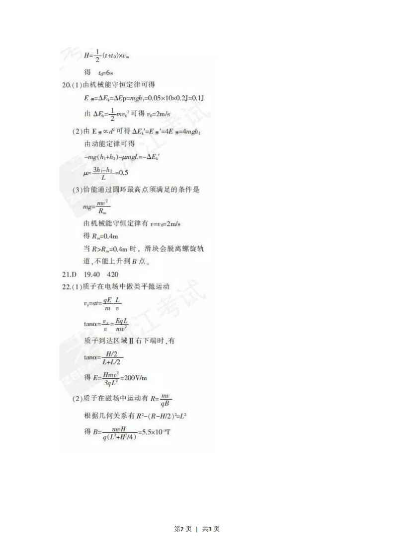 一、选择题1.C2B3.B4.A5.D6.C7D8.C9.D10.D11.C12.C13D二、选择题川14.BC15.AC16.AD三、非选择题17.(1)BC(2)BD②318.(1)(2)148-1.500.27(3)C19.(1)由运动学公式可得a==18ms=0.9m/420-x0.9x20m=180m(2)根据牛顿第二定律可得Fy-mg=mayFv=mg+ma =654N由牛顿第三定律可得小明对地板的压力FwN=Fx=654N,方向竖直向下(3)设匀速运动时间为0,运动的总时间为t,由r-4图可得第1页1共3页子tox得位620.(1)由机械能守恒定律可得E=△E=△Ep=mgh=0.05×10x0.2J-=0.1J由△=之m62可得w-2m6(2)由ExP可得△E'=E'=4E0=4mgh由动能定律可得-mg(h+h)mgl=-△Ee3h--0.5L(3)恰能通过圆环最高点须满足的条件是管由机械能守恒定律有=to=2ms得R.=0.4m当R>R=0.4m时,滑块会脱离螺旋轨道,不能上升到B点。21.D19.4042022.(1)质子在电场中做类平抛运动tat=9E Lm粒tanc==EqL质子到达区域Ⅱ右下端时,有tand=/2L+L得E=Hmg=200 V/m3L(2)质子在磁场中运动有R=m四qB根据几何关系有R2-(R-2)-L得B=mwH=5.5×10Tq(L2+4)第2页1共3页(3)质子运动轨迹如图所示。设质子进入磁场时的速率为。',sino=a=(Eq/m)(L/)EqLmov由几何关系知sing=12IBaLmv'/(Bq)2me得B=2E23.(1)根据电磁感应定律,有告9=Ar=4=B4S电流方向向右(2)平均感应电流1景器平均安培力F=BIL(下-mg)f=mo是祭-(3)以火箭为参考系,设竖直向上为正,由动量守恒定律-m'u+(m-m')△r=0得4rsm-m广第3页1共3页