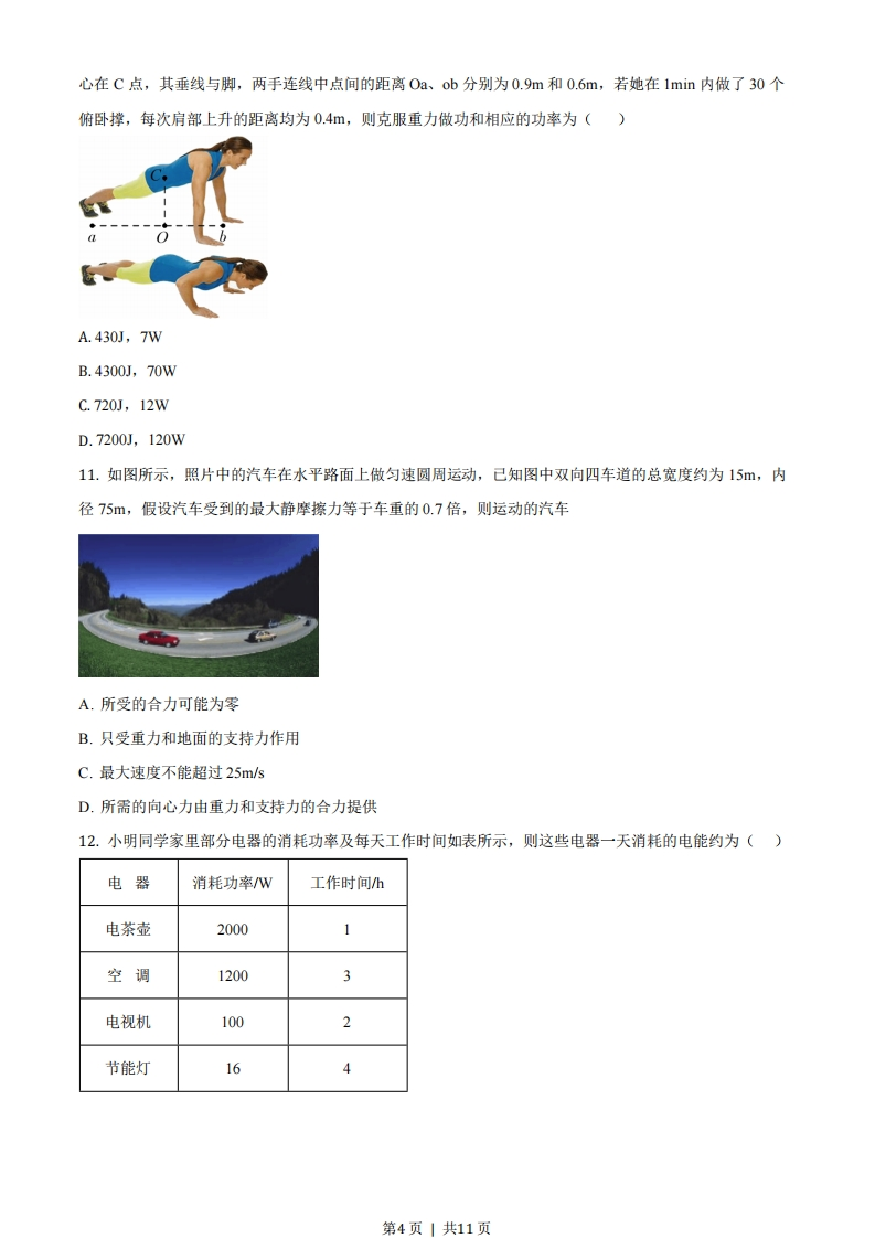 2017年11月浙江省普通高校招生选考科目考试物理试题一、选择题I(本题共13小题,每小题列出的四个备选项中只有一个是符合题目要求的)1.下列物理量中属于矢量的是(A.速率B.电势C.电流D.位移2.在国际单位制中,属于基本量及基本单位的是()A.质量千克B.能量焦耳C.电阻欧姆D.电量库仑3.获得2017年诺贝尔物理学奖的成果是(A.牛顿发现了万有引力定律B.卡文迪许测定了引力常量C.爱因斯坦预言了引力波D.雷纳韦斯等探测到了引力波4.如图所示,两位同学从滑道最高端的同一位置先后滑下,到达低端的同一位置,对于整个下滑过程,两同学的()A.位移一定相同B.时间一定相同C末速度一定相同D.平均速度一定相同5.叠放在水平地面上的四个完全相同的排球如图所示,质量均为m,相互接触,球与地面间的动摩擦因数均为4,则:A.上方球与下方3个球间均没有弹力第1页1共11页B下方三个球与水平地面间均没有摩擦力C.水平地面对下方三个球的支持力均为4m竖3D.水平地面对下方三个球的摩擦力均为4m飞36.电场线的形状可以用实验来模拟,把头发屑悬浮在蓖麻油里,加上电场,头发屑按照电场的方向排列起来,如图所示,关于此实验,下列说法正确的是()6A.a图是模拟两等量同种电荷的电场线B.b图一定是模拟两等量正电荷的电场线C.a图中A、B应接高压起电装置的两极D.b图中A、B应接高压起电装置的两极7.如图为人造地球卫星轨道的示意图,则卫星()A.在a轨道运行的周期为24hB.在b轨道运行的速度始终不变C.在c轨道运行的速度大小始终不变D.在c轨道运行时受到的地球引力大小是变化的8.如图所示,在两水平金属板构成的器件中,存在匀强电场与匀强磁场,电场强度E和磁感应强度B相互垂直,以某一水平速度进入的不计重力的带电粒子恰好能沿直线运动,下列说法正确的是()A.粒子一定带负电B.粒子的速度大小v=B/EC.若粒子速度大小改变,粒子将做曲线运动D.若粒子速度大小改变,电场对粒子的作用力会发生改变第2页1共11页9.杂技运动员在训练时的照片如图所示.有一小球自由落下,碰到水平桌面后反弹,如此数次落下和反弹.若规定竖直向下为正方向,碰撞时间不计,空气阻力不计,则下列-1图像中正确的是()10.如图所示,质量为60kg的某运动员在做俯卧撑运动,运动过程中可将她的身体视为一根直棒,己知重第3页」共11页