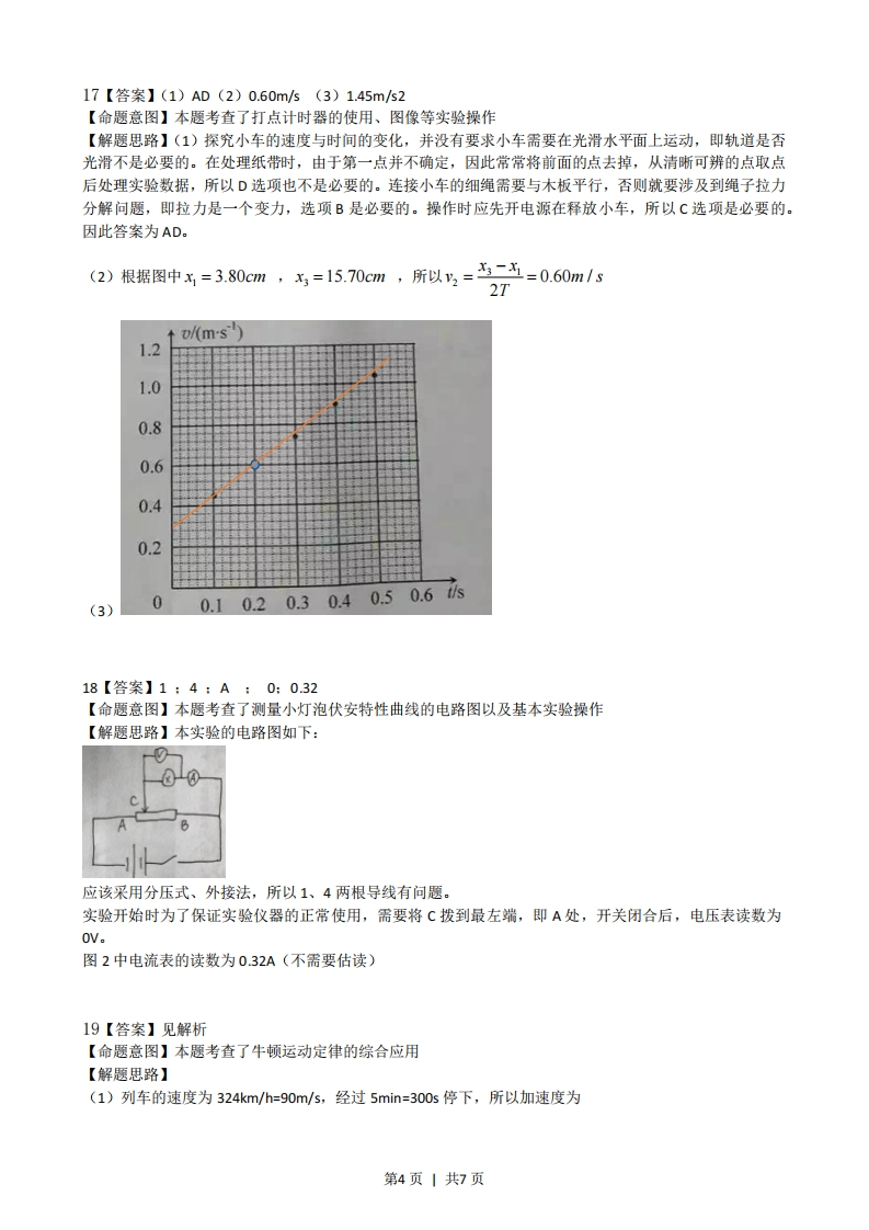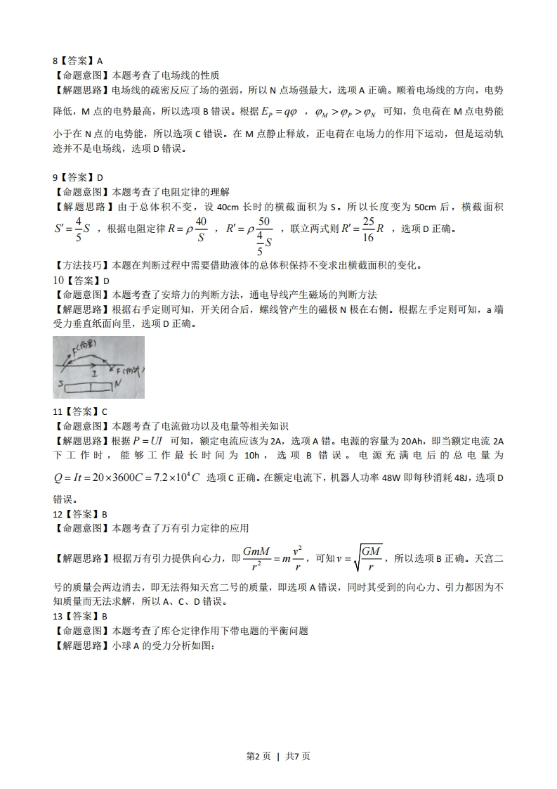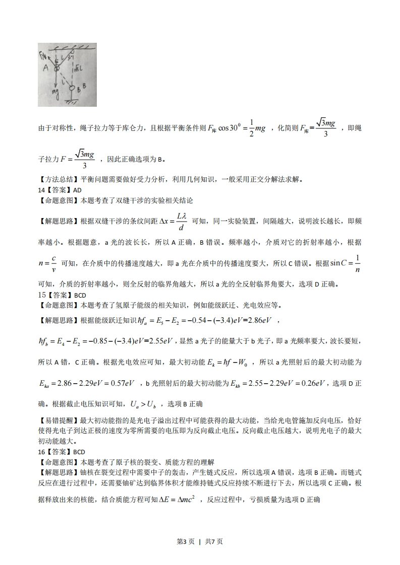 2016年10月浙江省普通高校招生选考科目考试:物理试题1【答案】A【命题意图】本题考查了标量、矢量的区分【解析思路】路程是只有大小的标量,选项A正确:位移、速度、加速度都是有方向的矢量,所以选项B、C、D不正确。2【答案】c【命题意图】本题考查了基本单位制【解析思路】力学中有3个基本物理量:质量、长度、时间,单位分别是:kg、、S。力(N),功(J)这些都不是国际基本物理量,所以答案为C。3【答案】C【命题意图】本题考查了对物体的受力分析的知识【解析思路】途中排球受到的力是:重力、空气对球的阻力,所以答案为C。此刻人手与球并没有接触,所以没有推力,所以选项A、B、D均错。【易错提醒】在受力分析时容易认为假想出个别力,例如下滑力、向心力等。判断力存在与否的关键是是否存在施力物体。4【答案】C【命题意图】本题考查了机械能、动能、重力势能的判断【解题思路】无人机匀速上升,所以动能保持不变,所以选项A、B、D均错。高度不断增加,所以重力势能不断增加,在上升过程中升力对无人机做正功,所以无人机机械能不断增加,所以选项C正确。【易错警示】机械能的变化需要看除重力之外的其他力是否做功,其他里做正功,机械能增加,反之减少。5【答案】D【命题意图】本题考查了角速度、线速度的判断2π【解题思路】由于A、B两处在人自转的过程中周期一样,所以根据@=可知,A、B两处的角速度一T样,所以A、B选项错误。根据v=ro可知A处转动半径越大,所以A处的线速度要大,即选项D正确。6【答案】c【命题意图】本题考查了自由落体运动规律的运用【解题思路】小石头落入井中,其下落规律可以看做自由落体运动。即h)8,带入数据则h=×9.8×52=122.5m考虑声音传回来大约有0.35,即下落距离应略小于122.5m,即选项C正确。27【答案】B【命题意图】本题考查了平抛运动规律应用【解愿思路】水平喷出的水,运动规律为平抛运动,根据平抛运动规律方=28可知,水在空中的时间为0.6s,根据x=t可知水平速度为。=2m/5。因此选项B正确。第1页1共7页8【答案】A【命题意图】本题考查了电场线的性质【解题思路】电场线的疏密反应了场的强弱,所以N点场强最大,选项A正确。顺着电场线的方向,电势降低,M点的电势最高,所以选项B错误。根据Ep=q,pM>Pp>Pw可知,负电荷在M点电势能小于在N点的电势能,所以选项C错误。在M点静止释放,正电荷在电场力的作用下运动,但是运动轨迹并不是电场线,选项D错误。9【答案】D【命题意图】本题考查了电阻定律的理解【解题思路】由于总体积不变,设40cm长时的横截面积为S。所以长度变为50cm后,横截面积S”=4S,根据电阻定律R=P0,R=P0,联立两式则R巧R,选项D正确S16【方法技巧】本题在判断过程中需要借助液体的总体积保持不变求出横截面积的变化。10【答案】D【命题意图】本题考查了安培力的判断方法,通电导线产生磁场的判断方法【解题思路】根据右手定则可知,开关闭合后,螺线管产生的磁极N极在右侧。根据左手定则可知,a端受力垂直纸面向里,选项D正确。向】(向11【答案】C【命题意图】本题考查了电流做功以及电量等相关知识【解题思路】根据P=UⅡ可知,额定电流应该为2A,选项A错。电源的容量为20Ah,即当额定电流2A下工作时,能够工作最长时间为10,选项B错误。电源充满电后的总电量为Q=It=20×3600C=7.2×10C选项C正确。在额定电流下,机器人功率48W即每秒消耗48别,选项D错误。12【答案】B【命题意图】本题考查了万有引力定律的应用【解题思路】根据万有引力提供向心力,即G=m二,可知rGM所以选项B正确。天宫二号的质量会两边消去,即无法得知天宫二号的质量,即选项A错误,同时其受到的向心力、引力都因为不知质量而无法求解,所以A、C、D错误。13【答案】B【命题意图】本题考查了库仑定律作用下带电题的平衡问题【解题思路】小球A的受力分析如图:第2页1共7页由于对称性,绳子拉力等于库仑力,且根据平衡条件则:6os30°-g,化简则F=3,即绳3子拉力F=V3mg,因此正确选项为B。【方法总结】平衡问题需要做好受力分析,利用几何知识,一般采用正交分解法求解。14【答案】AD【命题意图】本题考查了双缝干涉的实验相关结论【解愿思路】根据双缝干涉的条纹间距△x=L么可知,同一实验装置,间隔越大,说明波长越长,即频d率越小。根据题意,a光的波长长,所以A正确,B错误。频率越小,介质对它的折射率越小,根据n=。可知,在介质中的传播速度越大,即a光在介质中的传播速度要大,所以c错误。根据sinC=可知,介质的折射率越小,则全反射的临界角越大,所以a光的全反射临界角要大,选项D正确。15【答案】BCD【命题意图】本题考查了氢原子能级的相关知识,例如能级跃迁、光电效应等。【解题思路】根据能级跃迁知识ja=E-E2=-0.54-(-3.4)eV=2.86eV,j=E,-E2=-0.85-(-3.4)eV=2.55eV,显然a光子的能量大于b光子,即a光频率要大,波长要短,所以A错,C正确。根据光电效应可知,最大初动能E。=f-W。,所以a光照射后的最大初动能为Ea=2.86-2.29eV=0.57eV,b光照射后的最大初动能为Eh=2.55-2.29eV=0.26eV,选项D正确。根据截止电压知识可知,U,>U。,选项B正确【易错提醒】最大初动能指的是光电子溢出过程中可能获得的最大动能,当给光电管施加反向电压,恰好使得光电子到达正极的速度为零所需要的电压即为反向截止电压。反向截止电压越大,说明光电子的最大初动能越大。16【答案】B