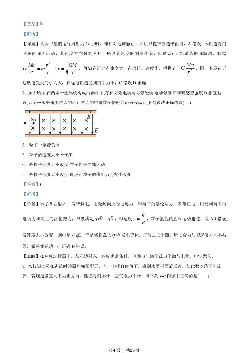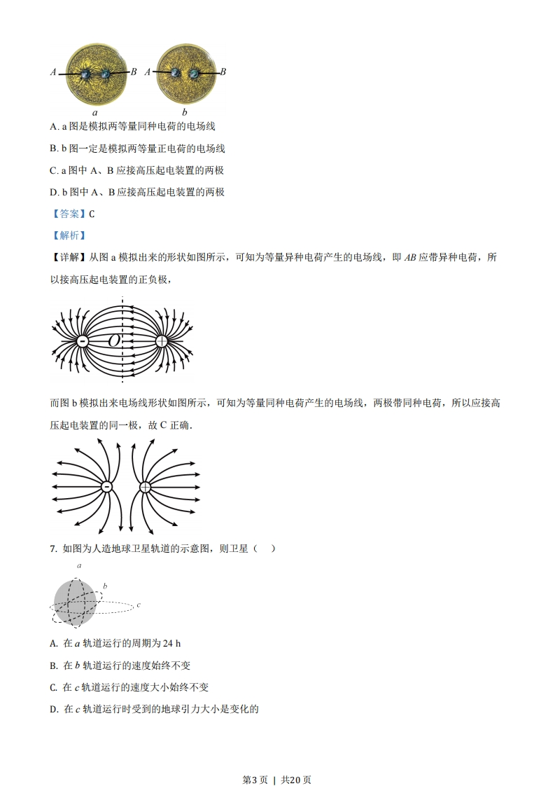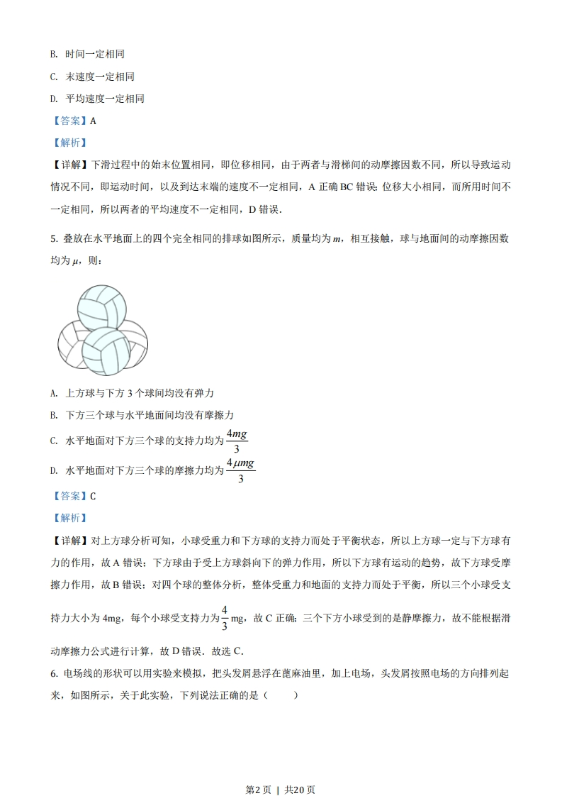 2017年11月浙江省普通高校招生选考科目考试物理试题一、选择题I(本题共13小题,每小题列出的四个备选项中只有一个是符合题目要求的)1.下列物理量中属于矢量的是()A.速率B.电势C.电流D.位移【答案】D【解析】【详解】既有大小又有方向的物理量叫做矢量,如速度,位移,力等于:只有大小没有方向的物理量叫做标量,如速率,电势,电流,时间等,D正确2.在国际单位制中,属于基本量及基本单位的是()A.质量千克B.能量焦耳C.电阻欧姆D.电量库仑【答案】A【解析】【详解】国际单位制规定了七个基本物理量.分别为长度、质量、时间、热力学温度、电流、光强度、物质的量.它们的在国际单位制中的单位称为基本单位,A正确3.获得2017年诺贝尔物理学奖的成果是()A.牛顿发现了万有引力定律B.卡文迪许测定了引力常量C.爱因斯坦预言了引力波D.雷纳韦斯等探测到了引力波【答案】D【解析】【详解】雷纳韦斯等探测到了引力波而获得了2017年诺贝尔物理学奖,其他三项不是2017年的,故D正确。4.如图所示,两位同学从滑道最高端的同一位置先后滑下,到达低端的同一位置,对于整个下滑过程,两同学的()A.位移一定相同第1页1共20页B.时间一定相同C.末速度一定相同D.平均速度一定相同【答案】A【解析】【详解】下滑过程中的始末位置相同,即位移相同,由于两者与滑梯间的动摩擦因数不同,所以导致运动情况不同,即运动时间,以及到达末端的速度不一定相同,A正确BC错误位移大小相同,而所用时间不一定相同,所以两者的平均速度不一定相同,D错误,5.叠放在水平地面上的四个完全相同的排球如图所示,质量均为m,相互接触,球与地面间的动摩擦因数均为4,则:A.上方球与下方3个球间均没有弹力B.下方三个球与水平地面间均没有摩擦力C.水平地面对下方三个球的支持力均为4m竖D.水平地面对下方三个球的摩擦力均为4m竖【答案】C【解析】【详解】对上方球分析可知,小球受重力和下方球的支持力而处于平衡状态,所以上方球一定与下方球有力的作用,故A错误:下方球由于受上方球斜向下的弹力作用,所以下方球有运动的趋势,故下方球受摩擦力作用,故B错误:对四个球的整体分析,整体受重力和地面的支持力而处于平衡,所以三个小球受支持力大小为4mg,每个小球受支持力为?mg,故C正确:三个下方小球受到的是静摩擦力,故不能根据滑动摩擦力公式进行计算,故D错误.故选C.6.电场线的形状可以用实验来模拟,把头发屑悬浮在蓖麻油里,加上电场,头发屑按照电场的方向排列起来,如图所示,关于此实验,下列说法正确的是()第2页1共20页6A.a图是模拟两等量同种电荷的电场线B.b图一定是模拟两等量正电荷的电场线C.a图中A、B应接高压起电装置的两极D.b图中A、B应接高压起电装置的两极【答案】C【解析】【详解】从图模拟出来的形状如图所示,可知为等量异种电荷产生的电场线,即AB应带异种电荷,所以接高压起电装置的正负极,而图b模拟出来电场线形状如图所示,可知为等量同种电荷产生的电场线,两极带同种电荷,所以应接高压起电装置的同一极,故C正确,得7.如图为人造地球卫星轨道的示意图,则卫星()A.在a轨道运行的周期为24hB.在b轨道运行的速度始终不变C.在c轨道运行的速度大小始终不变D.在c轨道运行时受到的地球引力大小是变化的第3页1共20页