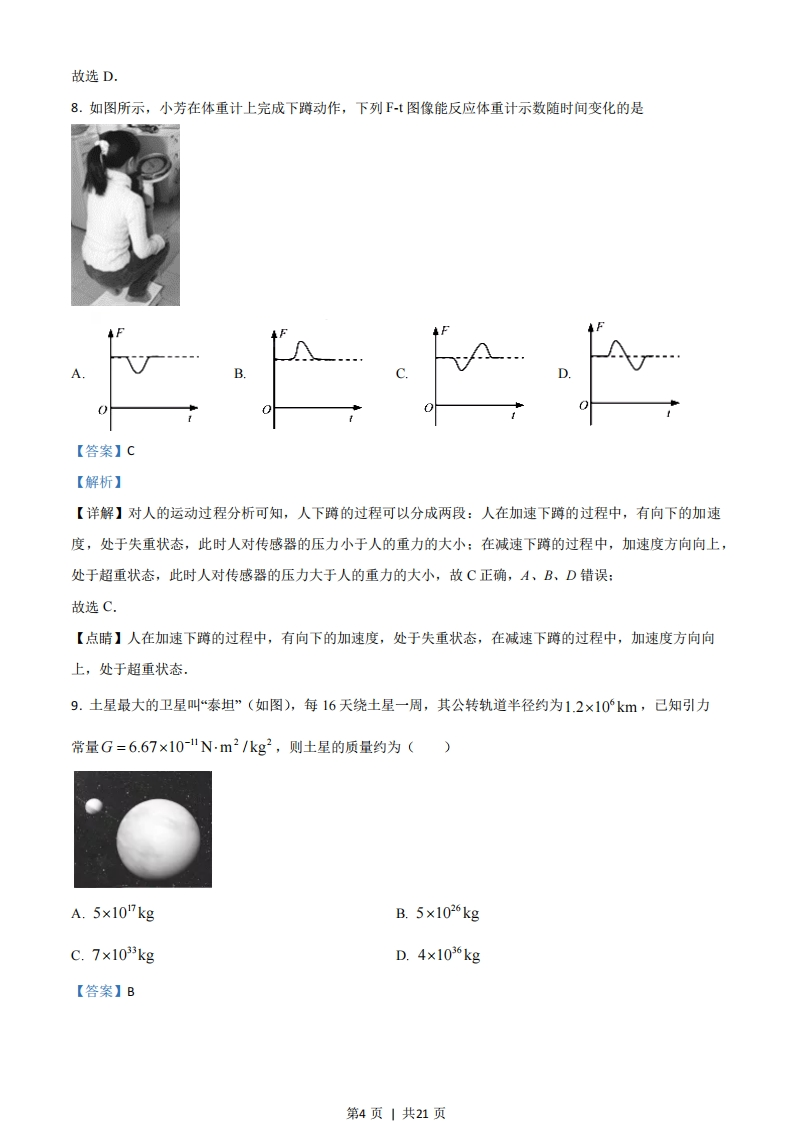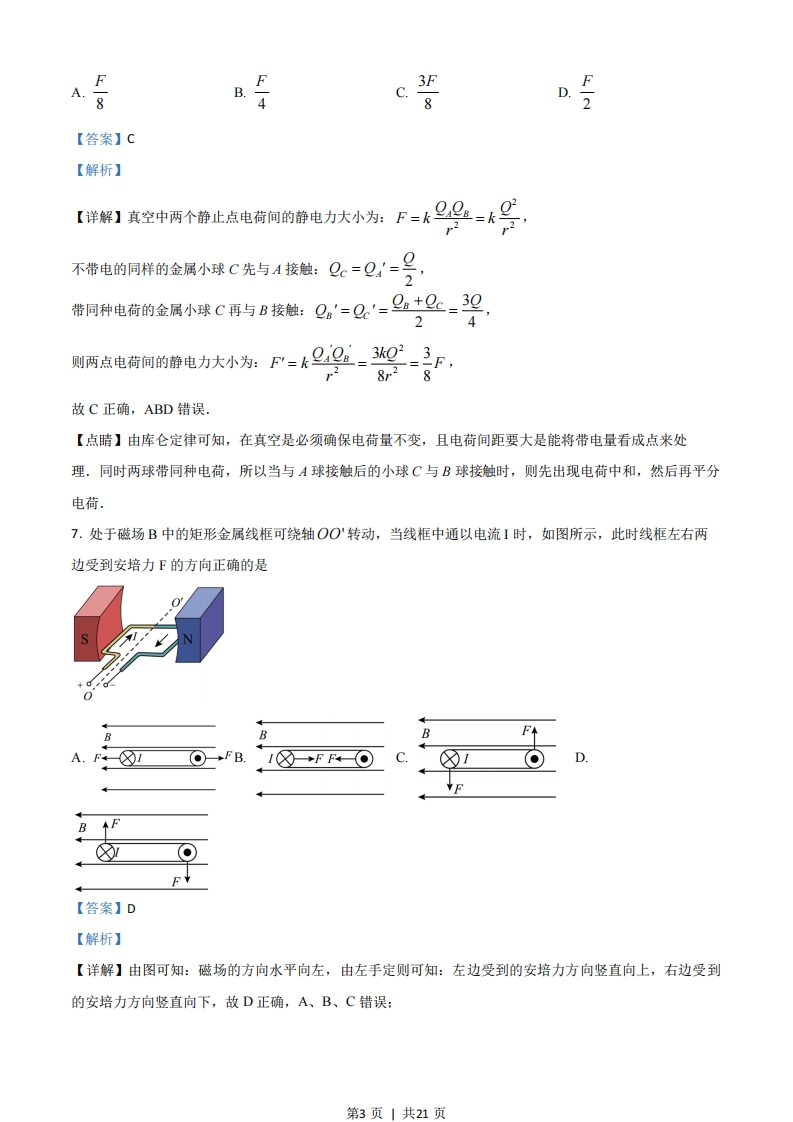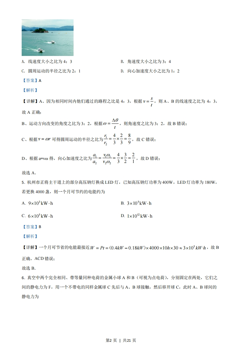 浙江新高考2018年4月选考科目物理试题一、选释题I:(本题共13小题,每小题3分,共39分,每小题列出的四个备选项中只有一个是符合题目要求的,不选、多选、错选均不得分)1.通过理想斜面实验得出“力不是维持物体运动的原因”的科学家是A.亚里士多德B.伽利略C.笛卡尔D.牛顿【答案】B【解析】【详解】A.亚里士多德认为力是维持物体运动状态的原因,故A项不符合题意:B.伽利略通过理想斜面实验提出了力不是维持物体运动的原因,故B项符合题意:C.笛卡尔在伽利略研究的基础上,强调了惯性运动的直线性,故C项不符合题意:D.牛顿在伽利略等前人研究的基础上提出了牛顿第一定律,认为力是改变物体运动状态的原因,但不是第一个根据实验提出力不是维持物体运动原因的科学家,也不是第一个提出惯性的科学家,故D项不符合题意2.某驾驶员使用定速巡航,在高速公路上以时速110公里行驶了200公里.其中“时速110公里”、“行驶200公里”分别是指()A.速度、位移B.速度、路程C.速率、位移D.速率、路程【答案】D【解析】【详解】行驶200公里指的是经过的路程的大小,时速为110公里是某一个时刻的速度,是瞬时速度的大小,故D正确,A、B、C错误:故选D.3.用国际单位制的基本单位表示能量的单位,下列正确的是A.kg.m2/s2B.kg.m/s2C.N/mD.N.m【答案】A【解析】【详解】根据W=Fs,F=ma,可得J=gm/s2m=kgm2/s2,故A正确,B、C、D错误:4.A、B两艘快艇在湖面上做匀速圆周运动(如图),在相同时间内,它们通过的路程之比是4:3,运动方向改变的角度之比是3:2,则它们()第1页|共21页A.线速度大小之比为4:3B.角速度大小之比为3:4C.圆周运动的半径之比为2:1D.向心加速度大小之比为1:2【答案】A【解析】【详解】A、因为相同时间内他们通过的路程之比是4:3,根据v=三,则A、B的线速度之比为4:3,故A正确:△0B、运动方向改变的角度之比为3:2,根据@=,则角速度之比为3:2,故B错误:C、根据v=r可得圆周运动的半径之比为上=×2-85339,故C错误:D根据心棉向6加速度之比为号-治-兴子,故D错误:故选A.5.杭州市正将主干道上的部分高压钠灯换成LED灯,己知高压钠灯功率为400W,LED灯功率为180W,若更换4000盏,则一个月可节约的电能约为A.9×103kW.hB.3×105kW.hC.6×105kW.hD.1×102kW.h【答案】B【解析】【详解】一个月可节省的电能最接近W=Pt=(0.4kW-0.18kW)×4000×10h×30≈3×10kWh,故B正确,ACD错误:故选B.6.真空中两个完全相同、带等量同种电荷的金属小球A和B(可视为点电荷),分别固定在两处,它们之间的静电力为F,用一个不带电的同样金属球C先后与A、B球接触,然后移开球C,此时A、B球间的静电力为第2页1共21页F3FFA.8C.8D.【答案】C【解析】【详解】真空中两个静止点电荷间的静电力大小为:F=k=k2不带电的同样的金属小球C先与A接触:Q=0,=g2带同种电荷的金属小球C再与B接触:Q。=Q。'=B+巴=324则两点电荷间的静电力大小为:F”=kC=39=3F,2-82-81故C正确,ABD错误,【点睛】由库仑定律可知,在真空是必须确保电荷量不变,且电荷间距要大是能将带电量看成点来处理.同时两球带同种电荷,所以当与A球接触后的小球C与B球接触时,则先出现电荷中和,然后再平分电荷。7.处于磁场B中的矩形金属线框可绕轴OO'转动,当线框中通以电流I时,如图所示,此时线框左右两边受到安培力F的方向正确的是BBBF个A.F←☒IO→FB.I+FFO1D.B AFIPY【答案】D【解析】【详解】由图可知:磁场的方向水平向左,由左手定则可知:左边受到的安培力方向竖直向上,右边受到的安培力方向竖直向下,故D正确,A、B、C错误:第3页|共21页