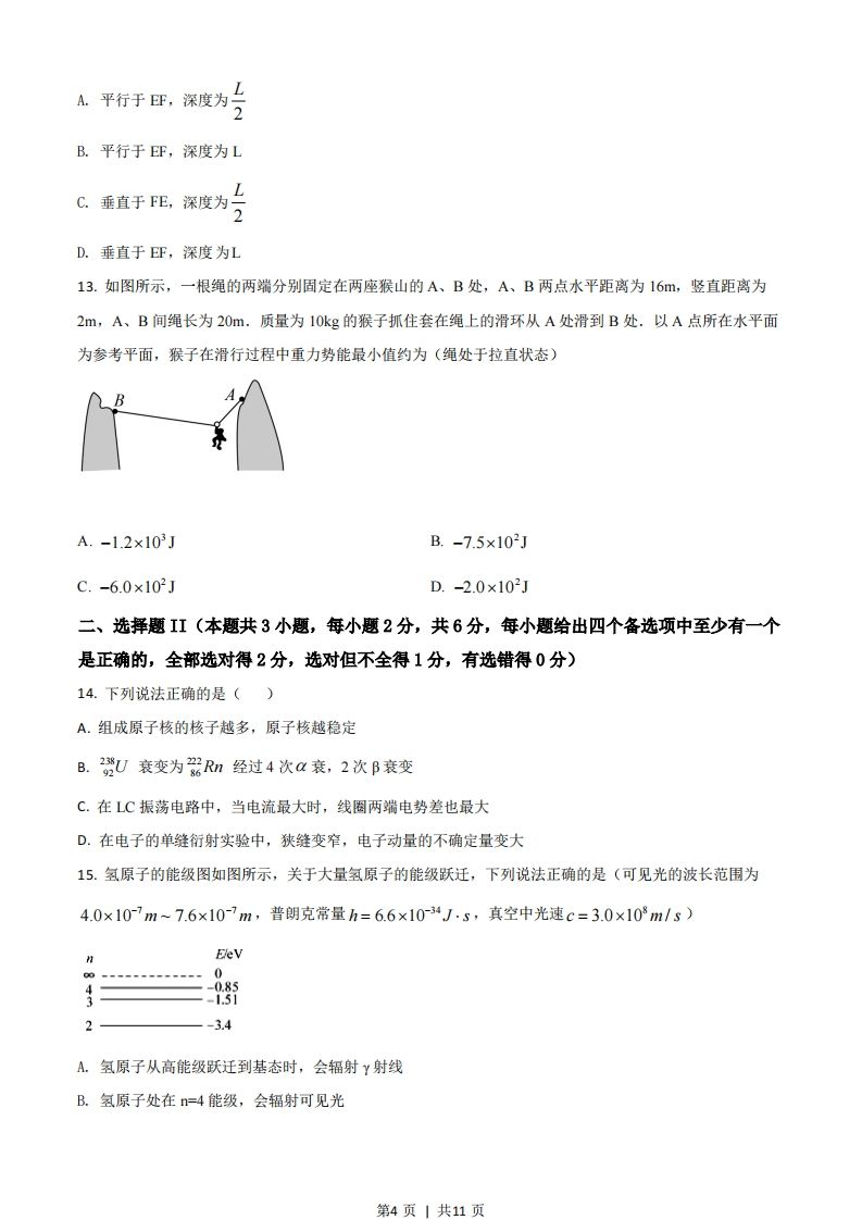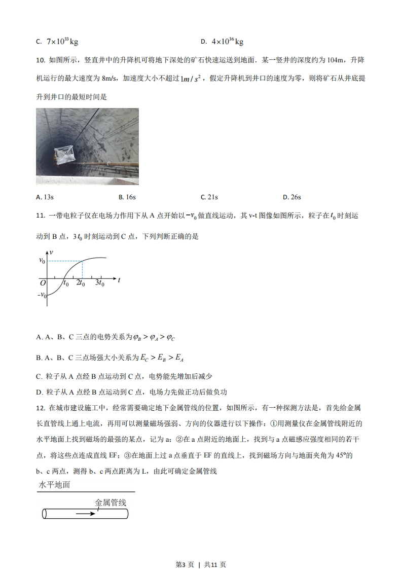 浙江新高考2018年4月选考科目物理试题一、选释题I:(本题共13小题,每小题3分,共39分,每小题列出的四个备选项中只有一个是符合题目要求的,不选、多选、错选均不得分)1.通过理想斜面实验得出“力不是维持物体运动的原因”的科学家是A.亚里士多德B.伽利略C.笛卡尔D.牛顿2.某驾驶员使用定速巡航,在高速公路上以时速110公里行驶了200公里.其中“时速110公里”、“行驶200公里”分别是指()A.速度、位移B.速度、路程C.速率、位移D.速率、路程3.用国际单位制的基本单位表示能量的单位,下列正确的是A.kg.m2/s2B.kg.m/s2C.N/mD.N.m4.A、B两艘快艇在湖面上做匀速圆周运动(如图),在相同时间内,它们通过的路程之比是4:3,运动方向改变的角度之比是3:2,则它们()A.线速度大小之比为4:3B.角速度大小之比为3:4C.圆周运动的半径之比为2:1D.向心加速度大小之比为1:25.杭州市正将主干道上的部分高压钠灯换成LED灯,己知高压钠灯功率为400W,LED灯功率为180W,若更换4000盏,则一个月可节约的电能约为A.9×103kW.hB.3×105kW.hC.6×105kW.hD.1×102kW.h6.真空中两个完全相同、带等量同种电荷的金属小球A和B(可视为点电荷),分别固定在两处,它们之间的静电力为F,用一个不带电的同样金属球C先后与A、B球接触,然后移开球C,此时A、B球间的静电力为FF3FFA.B.C.88D.7.处于磁场B中的矩形金属线框可绕轴OO'转动,当线框中通以电流I时,如图所示,此时线框左右两第1页1共11页边受到安培力F的方向正确的是BBFFFB.IF☒1DB8.如图所示,小芳在体重计上完成下蹲动作,下列F-t图像能反应体重计示数随时间变化的是9.土星最大的卫星叫“泰坦”(如图),每16天绕土星一周,其公转轨道半径约为1.2×10的km,己知引力常量G=6.67×10-1Nm2/kg2,则土星的质量约为()A.5×107kgB.5×1026kg第2页1共11页c.7×103kgD.4×1036kg10.如图所示,竖直井中的升降机可将地下深处的矿石快速运送到地面.某一竖井的深度约为104m,升降机运行的最大速度为8m/s,加速度大小不超过1m/s2,假定升降机到井口的速度为零,则将矿石从井底提升到井口的最短时间是A.13sB.16sC.21sD.26s11.一带电粒子仅在电场力作用下从A点开始以一'。做直线运动,其v-t图像如图所示,粒子在t。时刻运动到B点,36时刻运动到C点,下列判断正确的是3toA.A、B、C三点的电势关系为Pg>pA>PCB.A、B、C三点场强大小关系为Ec>EB>EC.粒子从A点经B点运动到C点,电势能先增加后减少D.粒子从A点经B点运动到C点,电场力先做正功后做负功12.在城市建设施工中,经常需要确定地下金属管线的位置,如图所示,有一种探测方法是,首先给金属长直管线上通上电流,再用可以测量磁场强弱、方向的仪器进行以下操作:①用测量仪在金属管线附近的水平地面上找到磁场的最强的某点,记为:②在a点附近的地面上,找到与a点磁感应强度相同的若干点,将这些点连成直线EF:③在地面上过a点垂直于EF的直线上,找到磁场方向与地面夹角为45的b、c两点,测得b、c两点距离为L,由此可确定金属管线水平地面金属管线第3页1共11页