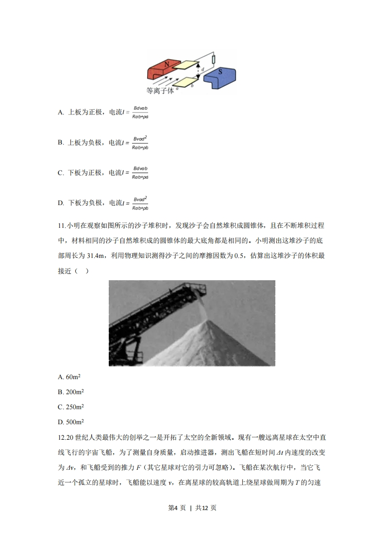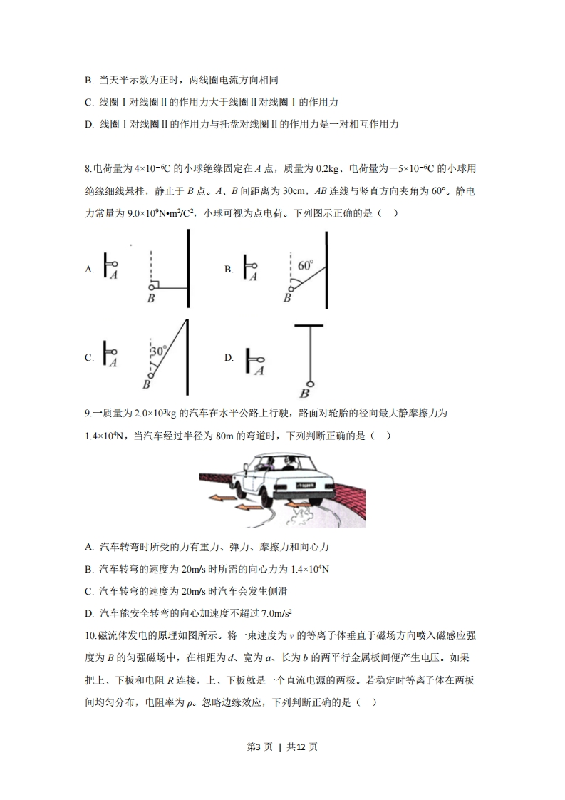 浙江省2019届高三上学期11月选考科目考试一、选择题1.下列物理量属于标量的是()A.速度B.加速度C.电流D.电场强度2.发现电流磁效应的物理学家是()A.法拉第B.奥斯特C.库仑D.安培3.用国际单位制的基本单位表示电场强度的单位,下列正确的是()A.N/CB.V/mC.kg-m/(C.s2)D.kg*m/(A.s3)4.一辆汽车沿平直道路行驶,其v一1图象如图所示。在=0到仁40s这段时间内,汽车的位移是()30/(m/s)2010010203040t/sA.0B.30mC.750mD.1200m5奥运会比赛项目撑杆跳高如图所示,下列说法不正确的是()第1页|共12页A.加速助跑过程中,运动员的动能增加B.起跳上升过程中,杆的弹性势能一直增加C.起跳上升过程中,运动员的重力势能增加D.越过横杆后下落过程中,运动员的重力势能减少动能增加6等量异种电荷的电场线如图所示,下列表述正确的是()A.a点的电势低于b点的电势B.a点的场强大于b点的场强,方向相同C.将一负电荷从a点移到b点电场力做负功D.负电荷在a点的电势能大于在b点的电势能7.电流天平是一种测量磁场力的装置,如图所示。两相距很近的通电平行线圈I和Ⅱ,线圈I固定,线圈Ⅱ置于天平托盘上。当两线圈均无电流通过时,天平示数恰好为零。下列说法正确的是()A.当天平示数为负时,两线圈电流方向相同第2页|共12页B.当天平示数为正时,两线圈电流方向相同C.线圈I对线圈Ⅱ的作用力大于线圈Ⅱ对线圈I的作用力D.线圈I对线圈Ⅱ的作用力与托盘对线圈Ⅱ的作用力是一对相互作用力8.电荷量为4×10-℃的小球绝缘固定在A点,质量为02kg、电荷量为一5×10-6C的小球用绝缘细线悬挂,静止于B点。A、B间距离为30Cm,AB连线与竖直方向夹角为60°。静电力常量为9.0x10Nm2C2,小球可视为点电荷。下列图示正确的是()60B9.一质量为2.0×10g的汽车在水平公路上行驶,路面对轮胎的径向最大静摩擦力为1.4×10N,当汽车经过半径为80m的弯道时,下列判断正确的是()A.汽车转弯时所受的力有重力、弹力、摩擦力和向心力B.汽车转弯的速度为20ms时所需的向心力为1.4×10NC.汽车转弯的速度为20ms时汽车会发生侧滑D.汽车能安全转弯的向心加速度不超过7.0m/s10.磁流体发电的原理如图所示。将一束速度为ⅴ的等离子体垂直于磁场方向喷入磁感应强度为B的匀强磁场中,在相距为d、宽为α、长为b的两平行金属板间便产生电压。如果把上、下板和电阻R连接,上、下板就是一个直流电源的两极。若稳定时等离子体在两板间均匀分布,电阻率为P。忽略边缘效应,下列判断正确的是()第3页|共12页