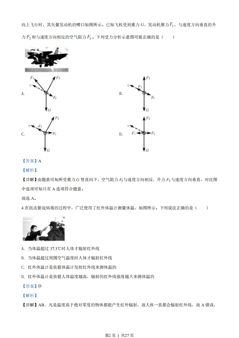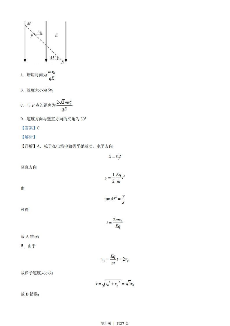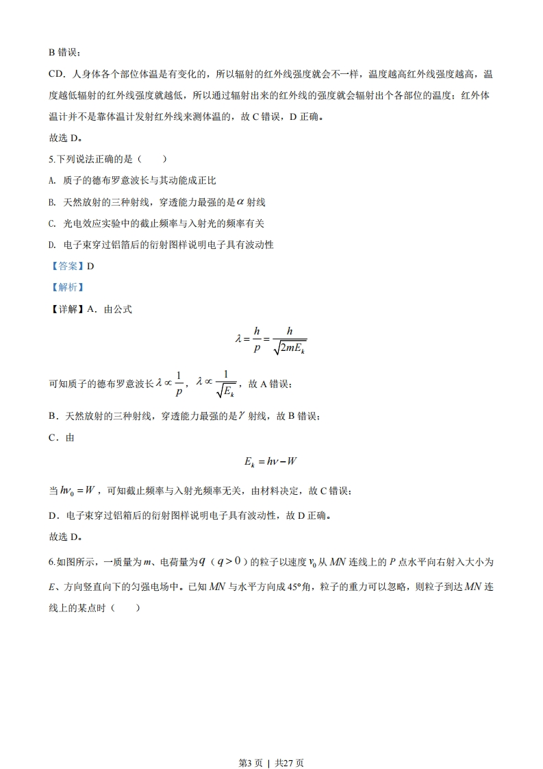 物理试题一、选释题I(本题共13小题,每小题3分,共39分。每小题列出的四个备选项中只有一个是符合题目要求的,不选、多选、错选均不得分)1国际单位制中电荷量的单位符号是C,如果用国际单位制基本单位的符号来表示,正确的是()A.F.VB.A.SC.J/VD.N.m/V【答案】B【解析】【详解】根据电荷量公式业可知,电流I的单位是A,时间1的单位是s,故用国际单位制的基本单位表示电量的单位为AS,故B正确,ACD错误。故选B。2.如图所示,底部均有4个轮子的行李箱竖立、b平卧放置在公交车上,箱子四周有一定空间。当公交车A.缓慢起动时,两只行李箱一定相对车子向后运动B.急刹车时,行李箱a一定相对车子向前运动C.缓慢转弯时,两只行李箱一定相对车子向外侧运动D.急转弯时,行李箱b一定相对车子向内侧运动【答案】B【解析】【详解】A.有题意可知当公交车缓慢启动时,两只箱子与公交车之间的有可能存在静摩擦使箱子与公交车一起运动,故A错误:B.急刹车时,由于惯性,行李箱一定相对车子向前运动,故B正确:C.当公交车缓慢转弯时,两只箱子与车之间的摩擦力可能提供向心力,与车保持相对静止,故C错误:D.当公交车急转弯时,由于需要向心力大,行李箱一定相对车子向外侧运动,故D错误。故选B。3.矢量发动机是喷口可向不同方向偏转以产生不同方向推力的一种发动机。当歼20隐形战斗机以速度ⅴ斜第1页」共27页向上飞行时,其矢量发动机的喷口如图所示。己知飞机受到重力G、发动机推力F、与速度方向垂直的升力F和与速度方向相反的空气阻力F。下列受力分析示意图可能正确的是()【答案】A【解析】【详解】由题意可知所受重力G竖直向下,空气阻力F与速度方向相反,升力F2与速度方向垂直,对比图中选项可知只有A选项符合题意。故选A。4在抗击新冠病毒的过程中,广泛使用了红外体温计测量体温,如图所示。下列说法正确的是()A.当体温超过37.3℃时人体才辐射红外线B.当体温超过周围空气温度时人体才辐射红外线C.红外体温计是依据体温计发射红外线来测体温的D.红外体温计是依据人体温度越高,辐射的红外线强度越大来测体温的【答案】D【解析】【详解】AB.凡是温度高于绝对零度的物体都能产生红外辐射,故人体一直都会辐射红外线,故A错误,第2页」共27页B错误:CD.人身体各个部位体温是有变化的,所以辐射的红外线强度就会不一样,温度越高红外线强度越高,温度越低辐射的红外线强度就越低,所以通过辐射出来的红外线的强度就会辐射出个各部位的温度:红外体温计并不是靠体温计发射红外线米测体温的,故C错误,D正确。故选D。5.下列说法正确的是()A.质子的德布罗意波长与其动能成正比B.天然放射的三种射线,穿透能力最强的是射线C.光电效应实验中的截止频率与入射光的频率有关D.电子束穿过铝箔后的衍射图样说明电子具有波动性【答案】D【解析】【详解】A,由公式hh==可知质子的德布罗意波长2x】,11VE故A错误:B.天然放射的三种射线,穿透能力最强的是Y射线,故B错误:C.由Es=hv-W当。=W,可知截止频率与入射光频率无关,由材料决定,故C错误:D.电子束穿过铝箱后的衍射图样说明电子具有波动性,故D正确。故选D。6.如图所示,一质量为m、电荷量为9(q>0)的粒子以速度%从N连线上的P点水平向右射入大小为E、方向竖直向下的匀强电场中。己知MN与水平方向成45°角,粒子的重力可以忽略,则粒子到达MW连线上的某点时()第3页」共27页