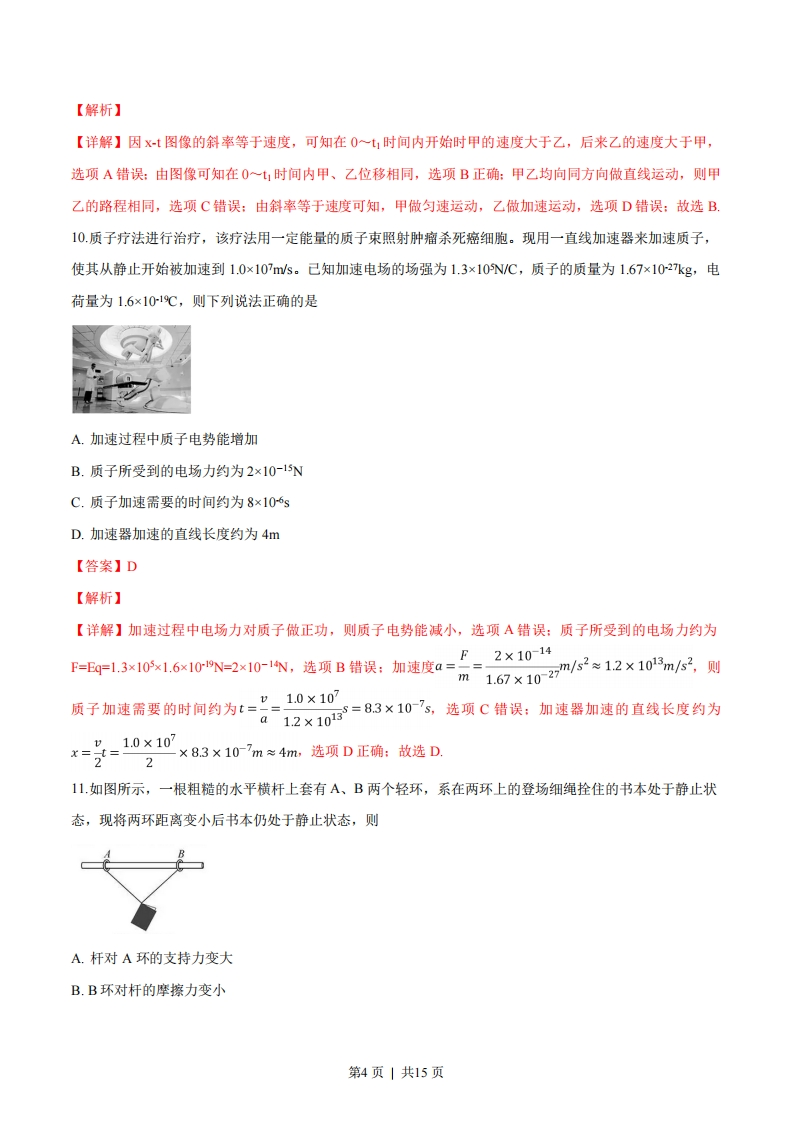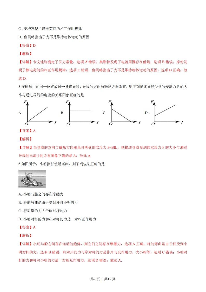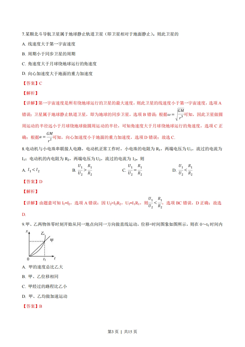 物理试题解析选择题部分一、选择题I(本题共13小题,每小题3分,共39分。每小题列出的四个备选项中只有一个是符合题目要求的,不选、多选、错选均不得分)1.下列物理量属于基本量且单位属于国际单位制中基本单位的是A.功/焦耳B.质量/千克C.电荷量/库仑D.力/牛顿【答案】B【解析】【详解】质量是国际单位制的基本量,其单位是千克,其他三个都不是基本量,其对应的单位也不是基本单位:故选B2.下列器件中是电容器的是【答案】B【解析】【详解】A是滑动变阻器:B是电容器:C是电阻箱:D是定值电阻:故选B.3.下列式子属于比值定义物理量的是A.t=ArFB.a=mC.C=UD./=R【答案】C【解析】【详解】物体运动的时间与位移成正比,与速度成反比,则A不是比值定义的物理量:加速度与合外力成正比,与质量成反比,则B不是比值定义的物理量:电容器的电容是由本身结构决定的,与两端的电压U与所带的电量Q无关,但是可以用带电量Q与电压U的比值来量度,则C采用的是比值定义法:导体的电流与加在其两端的电压成正比,与导体的电阻成反比,则D不是比值定义的物理量:故选C,4.下列陈述与事实相符的是A.牛顿测定了引力常量B.法拉第发现了电流周围存在磁场第1页|共15页C.安培发现了静电荷间的相互作用规律D.伽利略指出了力不是维持物体运动的原因【答案】D【解析】【详解】卡文迪许测定了引力常量,选项A错误:奥斯特发现了电流周围存在磁场,选项B错误:库伦发现了静电荷间的相互作用规律,选项C错误:伽利略指出了力不是维持物体运动的原因,选项D正确:故选D.5在磁场中的同一位置放置一条直导线,导线的方向与磁场方向垂直,则下列描述导线受到的安培力F的大小与通过导线的电流的关系图象正确的是【答案】A【解析】【详解】当导线的方向与磁场方向垂直时所受的安培力F=BL,则描述导线受到的安培力F的大小与通过导线的电流I的关系图象正确的是A:故选A,6如图所示,小明撑杆使船离岸,则下列说法正确的是A.小明与船之间存在摩擦力B.杆的弯曲是由于受到杆对小明的力C.杆对岸的力大于岸对杆的力D.小明对杆的力和岸对杆的力是一对相互作用力【答案】A【解析】【详解】小明与船之间存在运动的趋势,则它们之间存在摩擦力,选项A正确:杆的弯曲是由于杆受到小明对杆的力,选项B错误:杆对岸的力与岸对杆的力是作用与反作用力,大小相等,选项C错误:小明对杆的力和杆对小明的力是一对相互作用力,选项D错误:故选A.第2页|共15页7,某颗北斗导航卫星属于地球静止轨道卫星(即卫星相对于地面静止)。则此卫星的A.线速度大于第一宇宙速度B.周期小于同步卫星的周期C.角速度大于月球绕地球运行的角速度D.向心加速度大于地面的重力加速度【答案】C【解析】【详解】第一宇宙速度是所有绕地球运行的卫星的最大速度,则此卫星的线速度小于第一宇宙速度,选项AGM错误:卫星属于地球静止轨道卫星,即为地球的同步卫星,选项B错误根据仙=可知,因此卫星做圆周运动的半径远小于月球绕地球做圆周运动的半径,可知角速度大于月球绕地球运行的角速度,选项C正GM确:根据a=,子可知,向心加速度小于地面的重力加速度,选项D错误:故选C8.电动机与小电珠串联接人电路,电动机正常工作时,小电珠的电阻为R,两端电压为U1,流过的电流为I1:电动机的内电阻为R2,两端电压为U2,流过的电流为12。则U RU1 RA.1<12B.U2 R2C.U2R2D.2R2【答案】D【解析】U1 R1【详解】由愿意可知,选项A错误:因UR,UR,则元房选项BC错误,D正确:故选D.9.甲、乙两物体零时刻开始从同一地点向同一方向做直线运动,位移-时间图象如图所示,则在0一时间内0hA.甲的速度总比乙大B.甲、乙位移相同C.甲经过的路程比乙小D.甲、乙均做加速运动【答案】B第3页|共15页
