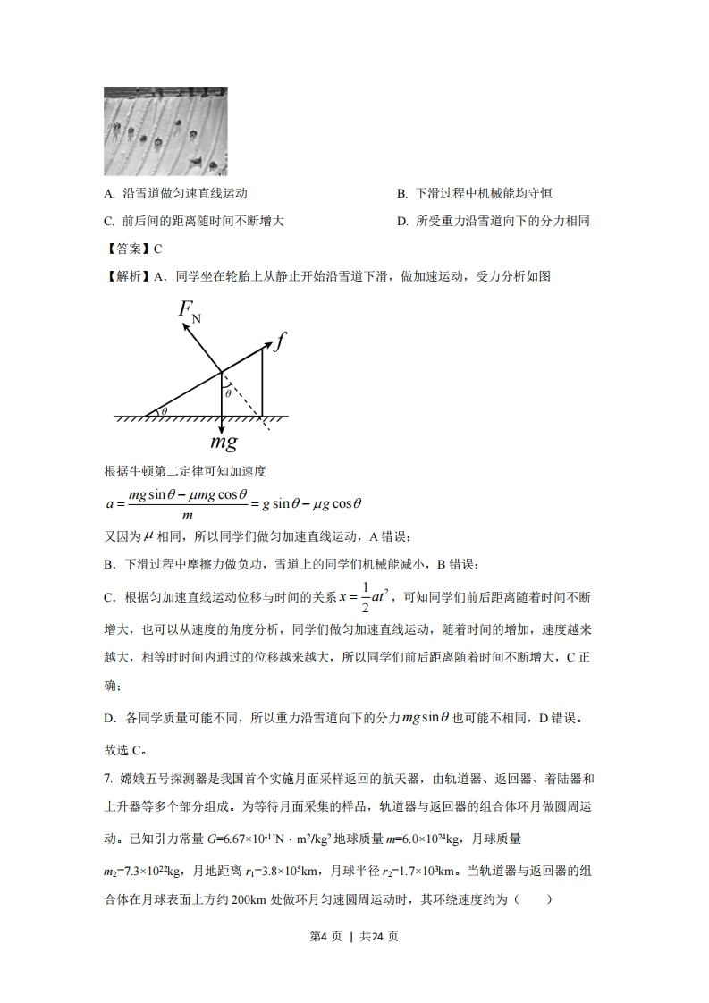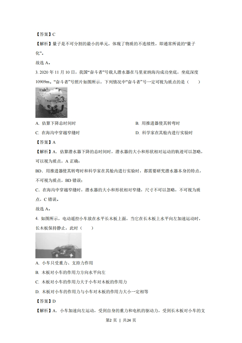 浙江省2021年1月高考物理试卷一、选择题(本共13小题,每小题3分,共39分。每小题列出的四个备选项中只有一个是符合题目要求的,不选、多选、错选均不得分)1.如图所示是我国自主研发的全自动无人值守望远镜,它安装在位于南极大陆的昆仑站,电力供应仅为1×103W。若用国际单位制基本单位的符号来表示W,正确的是()A.N·sB.N·m/sC.kg·m/sD.kg·m2s3【答案】D【解析】A.N不是国际单位制基本单位,根据冲量的定义I=F1可知,N·S是冲量的的单位,A错误:B.根据功率的计算公式P=F,可知功率的单位可以表示为Ns,但N不是国际单位制基本单位,B错误:C.根据动量的定义p=w可知,kg·m/s是动量的单位,C错误:D.根据P=Fv可知功率的单位可以表示为Nm/s,结合F=ma可知N=kgm/s2,则功率得单位W=Nms=kgm/s3,D正确。故选D。2.2020年12月我国科学家在量子计算领域取得了重大成果,构建了一台76个光子100个模式的量子计算机“九章”,它处理“高斯玻色取样的速度比目前最快的超级计算机“富岳”快一百万亿倍。关于量子,下列说法正确的是()A.是计算机运算的一种程序B.表示运算速度的一个单位C.表示微观世界的不连续性观念D.类似于质子、中子的微观粒子第1页|共24页【答案】C【解析】量子是不可分割的最小的单元,体现了物质的不连续性,即通常所说的“量子化”。故选A。3.2020年11月10日,我国“奋斗者”号载人潜水器在马里亚纳海沟成功坐底,坐底深度10909m。“奋斗者”号照片如图所示,下列情况中“奋斗者”号一定可视为质点的是()A.估算下降总时间时B.用推进器使其转弯时C.在海沟中穿越窄缝时D.科学家在其舱内进行实验时【答案】A【解析】A.估算潜水器下降的总时间时,潜水器的大小和形状相对运动的轨迹可以忽略,可以视为质点,A正确:BD.用推进器使其转弯时和科学家在其舱内进行实验时,都需要研究潜水器本身的特点,不可视为质点,BD错误:C.在海沟中穿越窄缝时,潜水器的大小和形状相对窄缝,尺寸不可以忽略,不可视为质点,C错误。故选A。4.如图所示,电动遥控小车放在水平长木板上面,当它在长木板上水平向左加速运动时,长木板保持静止,此时()A.小车只受重力、支持力作用B.木板对小车的作用力方向水平向左C.木板对小车的作用力大于小车对木板的作用力D.木板对小车的作用力与小车对木板的作用力大小一定相等【答案】D【解析】A.小车加速向左运动,受到自身的重力和电机的驱动力,受到长木板对小车的支第2页|共24页持力和阻力,A错误:B.木板对小车的作用力包括竖直向上的支持力和水平方向的阻力,根据平行四边形定则可知合力方向一定不在水平方向,B错误:CD.木板对小车的作用力与小车对木板的作用力是一对相互作用力,等大反向,C错误,D正确。故选D。5.如图所示是某一带电导体周围的电场线与等势面,A、C是同一等势面上的两点,B是另一等势面上的一点。下列说法正确的是()A.导体内部的场强左端大于右端B.A、C两点的电势均低于B点的电势C.B点的电场强度大于A点的电场强度D.正电荷从A点沿虚线移到B点的过程中电场力做正功,电势能减小【答案】D【解析】A.带电导体处于静电平衡状态,导体内部的场强处处为0,导体表面为等势面,整个导体为一个等势体,A错误:B.沿电场线方向电势降低,所以A、C两点的电势大于B点的电势,B错误:C.电场线的疏密程度表示电场强度的弱强,所以B点的电场强度小于A点的电场强度,C错误:D.根据E。=qO可知,正电荷从高电势A点沿虚线移动到低电势B点,电势能减小,电场力做正功,D正确。故选D。6.如图所示,同学们坐在相同的轮胎上,从倾角相同的平直雪道先后由同高度静止滑下,各轮胎与雪道间的动摩擦因数均相同,不计空气阻力。雪道上的同学们()第3页|共24页