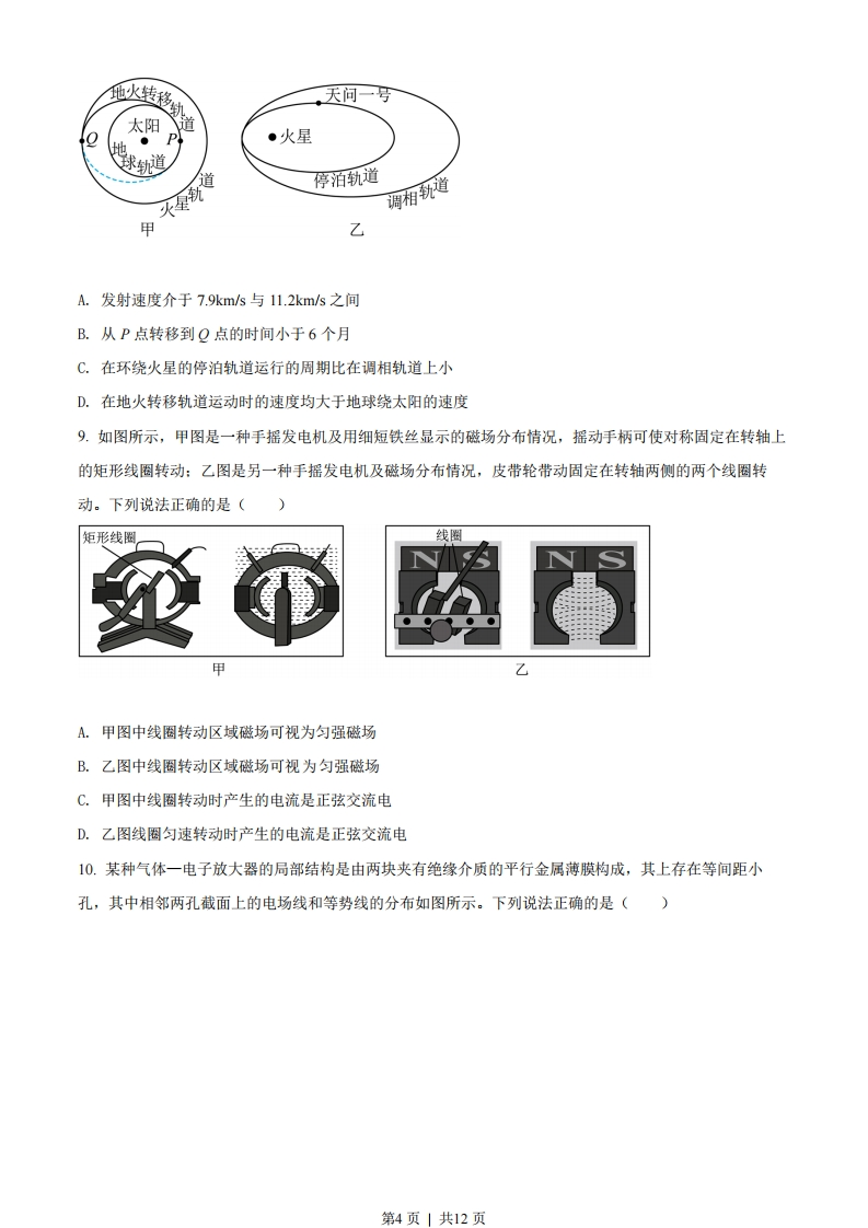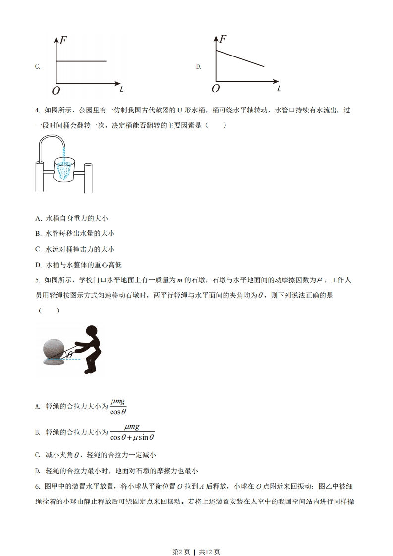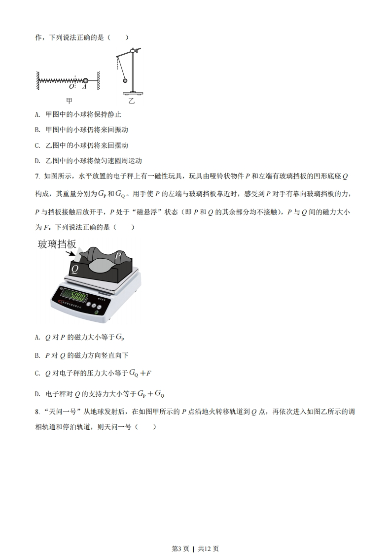 2022年1月浙江省普通高校招生选考科目考试物理试题选择题部分一、选择题I(本题共13小题,每小题3分,共39分。每小题列出的四个备选项中只有一个是符合题目要求的,不选、多选、错选均不得分)1.单位为J/m的物理量是()A.力B.功C.动能D.电场强度2.下列说法正确的是()甲乙丙A.研究甲图中排球运动员扣球动作时,排球可以看成质点B.研究乙图中乒乓球运动员的发球技术时,乒乓球不能看成质点C.研究丙图中羽毛球运动员回击羽毛球动作时,羽毛球大小可以忽略D.研究丁图中体操运动员的平衡木动作时,运动员身体各部分的速度可视为相同3.利用如图所示装置探究匀强磁场中影响通电导线受力的因素,导线垂直匀强磁场方向放置。先保持导线通电部分的长度L不变,改变电流I的大小,然后保持电流I不变,改变导线通电部分的长度L,得到导线受到的力F分别与I和L的关系图象,则正确的是()第1页」共12页4.如图所示,公园里有一仿制我国古代欹器的U形水桶,桶可绕水平轴转动,水管口持续有水流出,过一段时间桶会翻转一次,决定桶能否翻转的主要因素是()A.水桶自身重力的大小B.水管每秒出水量的大小C.水流对桶撞击力的大小D.水桶与水整体的重心高低5.如图所示,学校门口水平地面上有一质量为m的石墩,石墩与水平地面间的动摩擦因数为4,工作人员用轻绳按图示方式匀速移动石墩时,两平行轻绳与水平面间的夹角均为日,则下列说法正确的是)A.轻绳的合拉力大小为4mScos0ungB.轻绳的合拉力大小为cos0+usinC.减小夹角日,轻绳的合拉力一定减小D.轻绳的合拉力最小时,地面对石墩的摩擦力也最小6.图甲中的装置水平放置,将小球从平衡位置O拉到A后释放,小球在O点附近来回振动:图乙中被细绳拴着的小球由静止释放后可绕固定点来回摆动。若将上述装置安装在太空中的我国空间站内进行同样操第2页1共12页作,下列说法正确的是()OA.甲图中的小球将保持静止B.甲图中的小球仍将来回振动C.乙图中的小球仍将来回摆动D.乙图中的小球将做匀速圆周运动7.如图所示,水平放置的电子秤上有一磁性玩具,玩具由哑铃状物件P和左端有玻璃挡板的凹形底座Q构成,其重量分别为G和G。。用手使P的左端与玻璃挡板靠近时,感受到P对手有靠向玻璃挡板的力,P与挡板接触后放开手,P处于“磁悬浮”状态(即P和Q的其余部分均不接触),P与Q间的磁力大小为F。下列说法正确的是()玻璃挡板Q有行。西A.Q对P的磁力大小等于G,B.P对Q的磁力方向竖直向下C.Q对电子秤的压力大小等于Go+FD.电子秤对Q的支持力大小等于G,+G。8.“天问一号”从地球发射后,在如图甲所示的P点沿地火转移轨道到Q点,再依次进入如图乙所示的调相轨道和停泊轨道,则天问一号()第3页」共12页