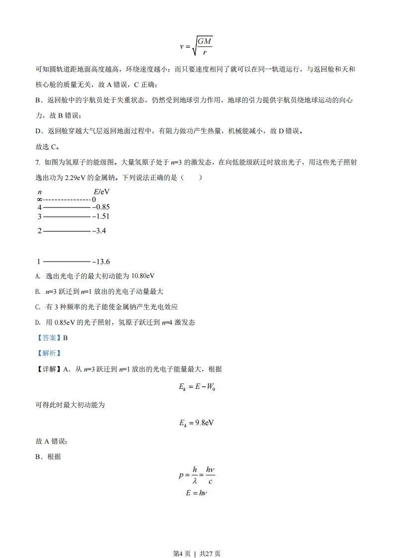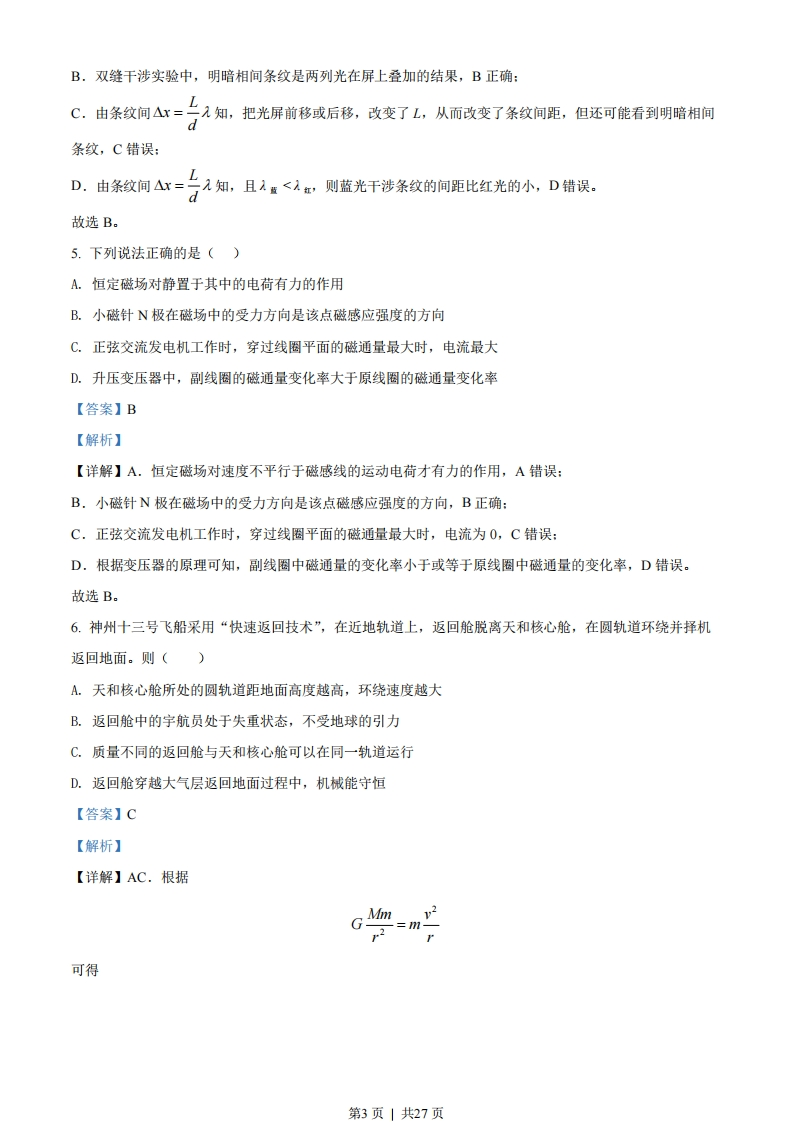 2022年6月浙江省普通高校招生选考科目考试物理试题本试题卷分选择题和非选释题两部分,共7页,满分100分,考试时间90分钟。考生注意:1答题前,请务必将自己的姓名,准考证号用黑色字迹的签字笔或钢笔分别填写在试题卷和答题纸规定的位置上。2.答题时,请按照答题纸上“注意事项”的要求,在答题纸相应的位置上规范作答,在本试题卷上的作答一律无效。3.非选择题的答案必须使用黑色字迹的签字笔或钢笔写在答题纸上相应的区域内,作图时先使用2B铅笔,确定后必须使用黑色字迹的签字笔或钢笔描黑。4.可能用到的相关公式或参数:重力加速度g均取10m/s2.选择题部分一、选释题1(本题共13小题,每小题3分,共39分。每小题列出的四个备选项中只有一个是符合题目要求的,不选、多选、错选均不得分)1.下列属于力的单位是()A.kg.m/s2B.kg.m/sC.kg.m2sD.kg.s/m2【答案】A【解析】【详解】根据牛顿第二定律有F=ma则力的单位为kg.m/s2故选A。2.下列说法正确的是()A.链球做匀速圆周运动过程中加速度不变B足球下落过程中惯性不随速度增大而增大C.乒乓球被击打过程中受到的作用力大小不变D.篮球飞行过程中受到空气阻力的方向与速度方向无关【答案】B第1页」共27页【解析】【详解】A.链球做匀速圆周运动过程中加速度方向在改变,A错误:B.惯性只与质量有关,则足球下落过程中惯性不随速度增大而增大,B正确:C.乒乓球被击打过程中受到的作用力随着形变量的减小而减小,C错误:D.篮球飞行过程中受到空气阻力的方向与速度方向有关,D错误。故选B。3.如图所示,鱼儿摆尾击水跃出水面,吞食荷花花瓣的过程中,下列说法正确的是()A.鱼儿吞食花瓣时鱼儿受力平衡B.鱼儿摆尾出水时浮力大于重力C.鱼儿摆尾击水时受到水的作用力D.研究鱼儿摆尾击水跃出水面的动作可把鱼儿视为质点【答案】C【解析】【详解】A.鱼儿吞食花瓣时处于失重状态,A错误:BC.鱼儿摆尾出水时浮力很小,鱼儿能够出水的主要原因是鱼儿摆尾时水对鱼向上的作用力大于重力,B错误、C正确:D.研究鱼儿摆尾击水跃出水面的动作不可以把鱼儿视为质点,否则就无动作可言,D错误。故选C。4.关于双缝干涉实验,下列说法正确的是()A.用复色光投射就看不到条纹B.明暗相间条纹是两列光在屏上叠加的结果C.把光屏前移或后移,不能看到明暗相间条纹D.蓝光干涉条纹的间距比红光的大【答案】B【解析】【详解】A.用复色光投射同样能看到条纹,A错误:第2页」共27页B.双缝干涉实验中,明暗相间条纹是两列光在屏上叠加的结果,B正确:LC.由条纹间△x=二入知,把光屏前移或后移,改变了L,从而改变了条纹间距,但还可能看到明暗相间d条纹,C错误:D.由条纹间△x=二入知,且1蓝<2红,则蓝光干涉条纹的间距比红光的小,D错误。故选B。5.下列说法正确的是()A.恒定磁场对静置于其中的电荷有力的作用B.小磁针N极在磁场中的受力方向是该点磁感应强度的方向C.正弦交流发电机工作时,穿过线圈平面的磁通量最大时,电流最大D.升压变压器中,副线圈的磁通量变化率大于原线圈的磁通量变化率【答案】B【解析】【详解】A.恒定磁场对速度不平行于磁感线的运动电荷才有力的作用,A错误:B.小磁针N极在磁场中的受力方向是该点磁感应强度的方向,B正确:C.正弦交流发电机工作时,穿过线圈平面的磁通量最大时,电流为0,C错误:D.根据变压器的原理可知,副线圈中磁通量的变化率小于或等于原线圈中磁通量的变化率,D错误。故选B。6.神州十三号飞船采用“快速返回技术”,在近地轨道上,返回舱脱离天和核心舱,在圆轨道环绕并择机返回地面。则()A.天和核心舱所处的圆轨道距地面高度越高,环绕速度越大B.返回舱中的宇航员处于失重状态,不受地球的引力C.质量不同的返回舱与天和核心舱可以在同一轨道运行D.返回舱穿越大气层返回地面过程中,机械能守恒【答案】C【解析】【详解】AC.根据GM-=m可得第3页」共27页