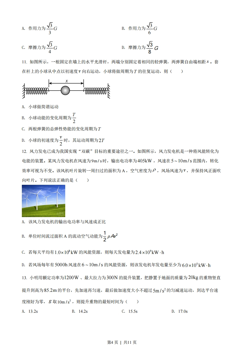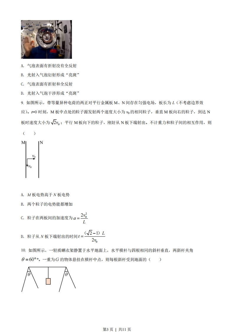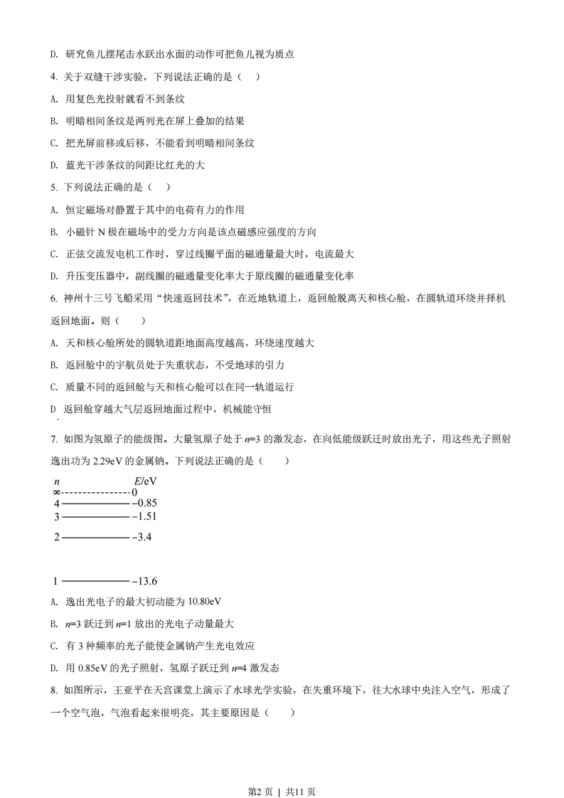 2022年6月浙江省普通高校招生选考科目考试物理试题本试题卷分选择题和非选释题两部分,共7页,满分100分,考试时间90分钟。考生注意:1.答题前,请务必将自已的姓名,准考证号用黑色字迹的签宇字笔或钢笔分别填写在试题卷和答题纸规定的位置上。2.答题时,请按照答题纸上“注意事项”的要求,在答题纸相应的位置上规范作答,在本试题卷上的作答一律无效。3.非选择题的答案必须使用黑色字迹的签字笔或钢笔写在答题纸上相应的区域内,作图时先使用2B铅笔,确定后必须使用黑色字迹的签字笔或钢笔描黑。4.可能用到的相关公式或参数:重力加速度g均取10m/s2,选择题部分一、选释题1((本题共13小题,每小题3分,共39分。每小题列出的四个备选项中只有一个是符合题目要求的,不选、多选、错选均不得分)1.下列属于力的单位是()A.kg.m/s2B.kg.m/sC.kg.m2sD.kg.s/m22.下列说法正确的是()A.链球做匀速圆周运动过程中加速度不变B.足球下落过程中惯性不随速度增大而增大C.乒乓球被击打过程中受到的作用力大小不变D.篮球飞行过程中受到空气阻力的方向与速度方向无关3.如图所示,鱼儿摆尾击水跃出水面,吞食荷花花瓣的过程中,下列说法正确的是()A.鱼儿吞食花瓣时鱼儿受力平衡B.鱼儿摆尾出水时浮力大于重力C.鱼儿摆尾击水时受到水的作用力第1页」共11页D.研究鱼儿摆尾击水跃出水面的动作可把鱼儿视为质点4.关于双缝干涉实验,下列说法正确的是()A.用复色光投射就看不到条纹B.明暗相间条纹是两列光在屏上叠加的结果C.把光屏前移或后移,不能看到明暗相间条纹D.蓝光干涉条纹的间距比红光的大5.下列说法正确的是()A.恒定磁场对静置于其中的电荷有力的作用B.小磁针N极在磁场中的受力方向是该点磁感应强度的方向C.正弦交流发电机工作时,穿过线圈平面的磁通量最大时,电流最大D.升压变压器中,副线圈的磁通量变化率大于原线圈的磁通量变化率6.神州十三号飞船采用“快速返回技术”,在近地轨道上,返回舱脱离天和核心舱,在圆轨道环绕并择机返回地面。则()A.天和核心舱所处的圆轨道距地面高度越高,环绕速度越大B.返回舱中的宇航员处于失重状态,不受地球的引力C.质量不同的返回舱与天和核心舱可以在同一轨道运行D返回舱穿越大气层返回地面过程中,机械能守恒7.如图为氢原子的能级图。大量氢原子处于=3的激发态,在向低能级跃迁时放出光子,用这些光子照射逸出功为2.29V的金属钠。下列说法正确的是()EleV4.-0.8531-1.512-3.4-13.6A.逸出光电子的最大初动能为10.80eVB.=3跃迁到=1放出的光电子动量最大C.有3种频率的光子能使金属钠产生光电效应D.用0.85eV的光子照射,氢原子跃迁到=4激发态8.如图所示,王亚平在天宫课堂上演示了水球光学实验,在失重环境下,往大水球中央注入空气,形成了一个空气泡,气泡看起来很明亮,其主要原因是()第2页共11页A.气泡表面有折射没有全反射B.光射入气泡衍射形成“亮斑”C.气泡表面有折射和全反射D.光射入气泡干涉形成“亮斑”9.如图所示,带等量异种电荷的两正对平行金属板M、N间存在匀强电场,板长为L(不考虑边界效应)。=0时刻,M板中点处的粒子源发射两个速度大小为%的相同粒子,垂直M板向右的粒子,到达N板时速度大小为√2。:平行M板向下的粒子,刚好从N板下端射出。不计重力和粒子间的相互作用,则MA.M板电势高于N板电势B.两个粒子的电势能都增加C.粒子在两板间的加速度为a=26(√2-1)LD.粒子从N板下端射出的时间t=2%10.如图所示,一轻质晒衣架静置于水平地面上,水平横杆与四根相同的斜杆垂直,两斜杆夹角0=60°°。一重为G的物体悬挂在横杆中点,则每根斜杆受到地面的()第3页」共11页
