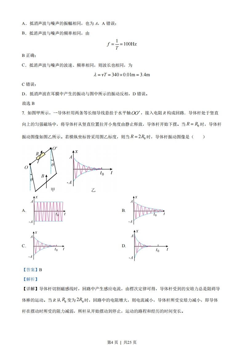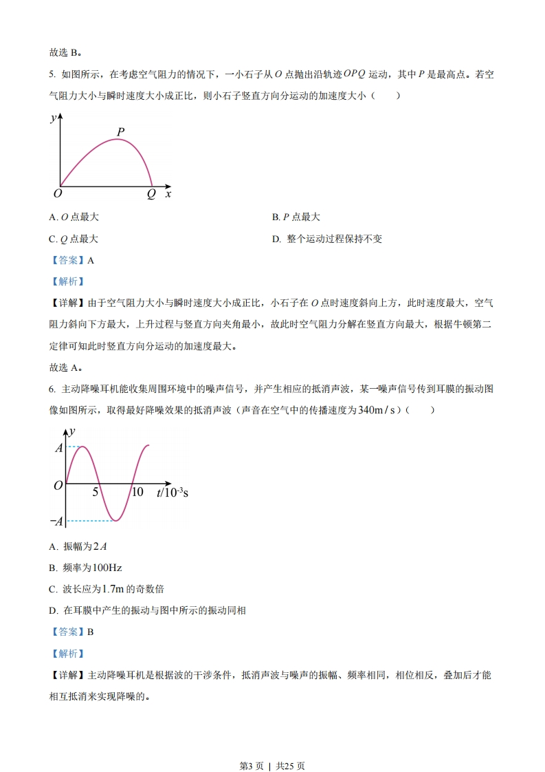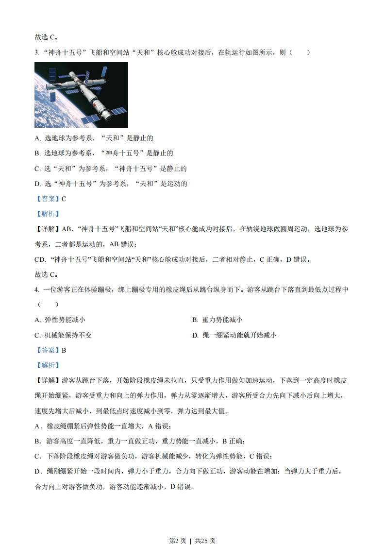 2023年1月浙江省普通高校招生选考科目考试物理试题选择题部分一、选择题I(本题共3小题,每小题3分,共39分.每小题列出的四个备选项中只有一个是符合题目要求的,不选、多选、错选均不得分)1.下列属于国际单位制中基本单位符号的是()A.JB.KC.WD.Wb【答案】B【解析】【详解】国际单位制中的七个基本单位是千克、米、秒、安培、开尔文、坎德拉、摩尔,符号分别是kg、m、s、A、K、cd、mol,其余单位都属于导出单位。故选B。2.如图所示,轻质网兜兜住重力为G的足球,用轻绳挂于光滑竖直墙壁上的A点,轻绳的拉力为F,墙壁对足球的支持力为F,则()轻绳A.FGD.F=G【答案】C【解析】【详解】对网兜和足球受力分析,设轻绳与竖直墙面夹角为0,由平衡条件F=-FNFN=Gtanθcosa sine可知FT>G,FT>F第1页」共25页故选C。3.“神舟十五号”飞船和空间站“天和”核心舱成功对接后,在轨运行如图所示,则()A.选地球为参考系,“天和”是静止的B.选地球为参考系,“神舟十五号”是静止的C.选“天和”为参考系,“神舟十五号”是静止的D.选“神舟十五号”为参考系,“天和”是运动的【答案】C【解析】【详解】AB.“神舟十五号”飞船和空间站“天和”核心舱成功对接后,在轨绕地球做圆周运动,选地球为参考系,二者都是运动的,AB错误:CD.“神舟十五号”飞船和空间站“天和”核心舱成功对接后,二者相对静止,C正确,D错误。故选C。4.一位游客正在体验蹦极,绑上蹦极专用的橡皮绳后从跳台纵身而下。游客从跳台下落直到最低点过程中()A.弹性势能减小B.重力势能减小C.机械能保持不变D.绳一绸紧动能就开始减小【答案】B【解析】【详解】游客从跳台下落,开始阶段橡皮绳未拉直,只受重力作用做匀加速运动,下落到一定高度时橡皮绳开始绷紧,游客受重力和向上的弹力作用,弹力从零逐渐增大,游客所受合力先向下减小后向上增大,速度先增大后减小,到最低点时速度减小到零,弹力达到最大值。A.橡皮绳绷紧后弹性势能一直增大,A错误:B.游客高度一直降低,重力一直做正功,重力势能一直减小,B正确:C.下落阶段橡皮绳对游客做负功,游客机械能减少,转化为弹性势能,C错误:D.绳刚绷紧开始一段时间内,弹力小于重力,合力向下做正功,游客动能在增加:当弹力大于重力后,合力向上对游客做负功,游客动能逐渐减小,D错误。第2页1共25页故选B。5.如图所示,在考虑空气阻力的情况下,一小石子从O点抛出沿轨迹OPQ运动,其中P是最高点。若空气阻力大小与瞬时速度大小成正比,则小石子竖直方向分运动的加速度大小()A.O点最大B.P点最大C.Q点最大D.整个运动过程保持不变【答案】A【解析】【详解】由于空气阻力大小与瞬时速度大小成正比,小石子在O点时速度斜向上方,此时速度最大,空气阻力斜向下方最大,上升过程与竖直方向夹角最小,故此时空气阻力分解在竖直方向最大,根据牛顿第二定律可知此时竖直方向分运动的加速度最大。故选A。6.主动降噪耳机能收集周围环境中的噪声信号,并产生相应的抵消声波,某一噪声信号传到耳膜的振动图像如图所示,取得最好降噪效果的抵消声波(声音在空气中的传播速度为340m/s)()10t/10-3sAA.振幅为2AB.频率为100HzC.波长应为1.7m的奇数倍D.在耳膜中产生的振动与图中所示的振动同相【答案】B【解析】【详解】主动降噪耳机是根据波的干涉条件,抵消声波与噪声的振幅、频率相同,相位相反,叠加后才能相互抵消来实现降噪的。第3页」共25页