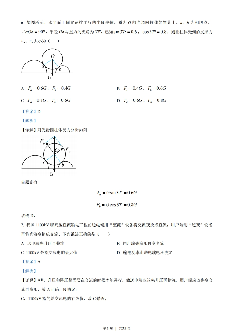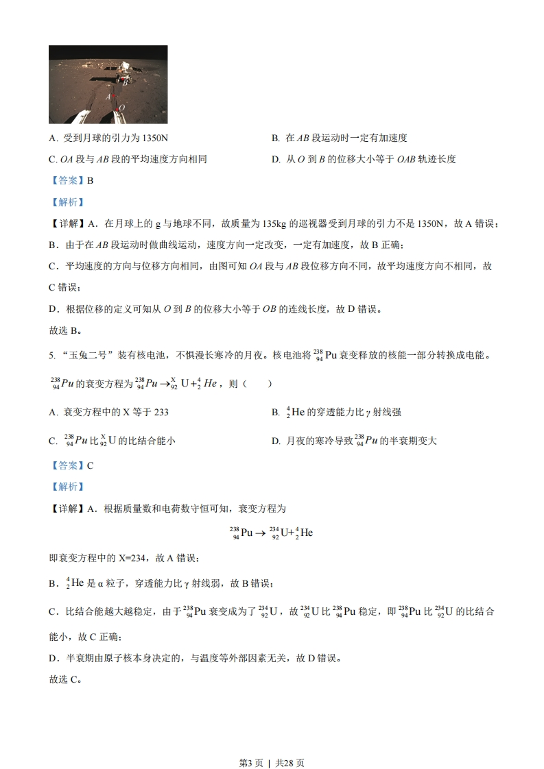 绝密★启用前2023年6月浙江省普通高校招生选考科目考试物理考生注意:1,答题前,请务必将自己的姓名,准考证号用黑色字迹的签字笔或钢笔分别填写在试题卷和答题纸规定的位置上。2.答题时,请按照答题纸上“注意事项”的要求,在答题纸相应的位置上规范作答,在本试题卷上的作答一律无效。3。非选择题的答案必须使用黑色字迹的签字笔或钢笔写在答题纸上相应区域内,作图时可先使用2B铅笔,确定后必须使用黑色字迹的签字笔或钢笔描黑。4.可能用到的相关参数:重力加速度g取10m/s2。选择题部分一、选择题I(本题共13小题,每小题3分,共39分。每小题列出的四个备选项中只有一个是符合题目要求的,不选、多选、错选均不得分)1.下列四组物理量中均为标量的是()A.电势电场强度B.热量功率C.动量动能D.速度加速度【答案】B【解析】【详解】A.电势只有大小没有方向,是标量:电场强度既有大小又有方向,是矢量,故A错误:B.热量和功率都是只有大小没有方向,都是标量,故B正确:C.动量既有大小又有方向,是矢量:动能只有大小没有方向,是标量,故C错误:D.速度和加速度都是既有大小又有方向的物理量,是矢量,故D错误。故选B。2.在足球运动中,足球入网如图所示,则()A.踢香蕉球时足球可视为质点B.足球在飞行和触网时惯性不变C.足球在飞行时受到脚的作用力和重力D.触网时足球对网的力大于网对足球的力【答案】B【解析】【详解】A.在研究如何踢出“香蕉球”时,需要考虑踢在足球上的位置与角度,所以不可以把足球看作质点,故A错误:第1页|共28页B.惯性只与质量有关,足球在飞行和触网时质量不变,则惯性不变,故B正确:C.足球在飞行时脚己经离开足球,故在忽略空气阻力的情况下只受重力,故C错误:D.触网时足球对网的力与网对足球的力是相互作用力,大小相等,故D错误。故选B。3.铅球被水平推出后的运动过程中,不计空气阻力,下列关于铅球在空中运动时的加速度大小、速度大小v、动能E和机械能E随运动时间t的变化关系中,正确的是()↑E【答案】D【解析】【详解】A.由于不计空气阻力,铅球被水平推出后只受重力作用,加速度等于重力加速度,不随时间改变,故A错误:B.铅球被水平推出后做平抛运动,竖直方向有v=gt则抛出后速度大小为=+(gt)可知速度大小与时间不是一次函数关系,故B错误:C.铅球抛出后的动能可知动能与时间不是一次函数关系,故C错误:D,铅球水平抛出后由于忽略空气阻力,所以抛出后铅球机械能守恒,故D正确。故选D。4.图为“玉兔二号”巡视器在月球上从O处行走到B处的照片,轨迹OA段是直线,AB段是曲线,巡视器质量为135kg,则巡视器()第2页」共28页A.受到月球的引力为1350NB.在AB段运动时一定有加速度C.OA段与AB段的平均速度方向相同D.从O到B的位移大小等于OAB轨迹长度【答案】B【解析】【详解】A.在月球上的g与地球不同,故质量为135kg的巡视器受到月球的引力不是1350N,故A错误:B.由于在AB段运动时做曲线运动,速度方向一定改变,一定有加速度,故B正确:C.平均速度的方向与位移方向相同,由图可知OA段与AB段位移方向不同,故平均速度方向不相同,故C错误:D.根据位移的定义可知从O到B的位移大小等于OB的连线长度,故D错误。故选B。5.“玉兔二号”装有核电池,不惧漫长寒冷的月夜。核电池将P山衰变释放的核能一部分转换成电能。Pu的衰变方程为Pu→U+He,则()A.衰变方程中的X等于233B.2He的穿透能力比y射线强C.Pu比U的比结合能小D.月夜的寒冷导致Pu的半衰期变大【答案】C【解析】【详解】A,根据质量数和电荷数守恒可知,衰变方程为2Pu→U+He即衰变方程中的X=234,故A错误:B.2He是a粒子,穿透能力比y射线弱,故B错误:C.比结合能越大越稳定,由于2Pu衰变成为了U,故2U比2Pu稳定,即8Pu比U的比结合能小,故C正确:D.半衰期由原子核本身决定的,与温度等外部因素无关,故D错误。故选C。第3页」共28页
