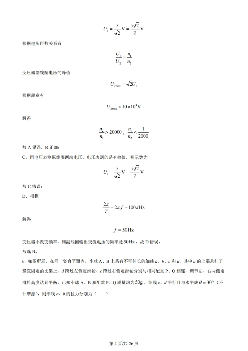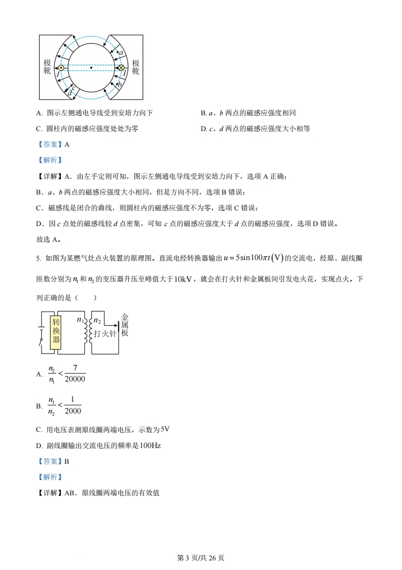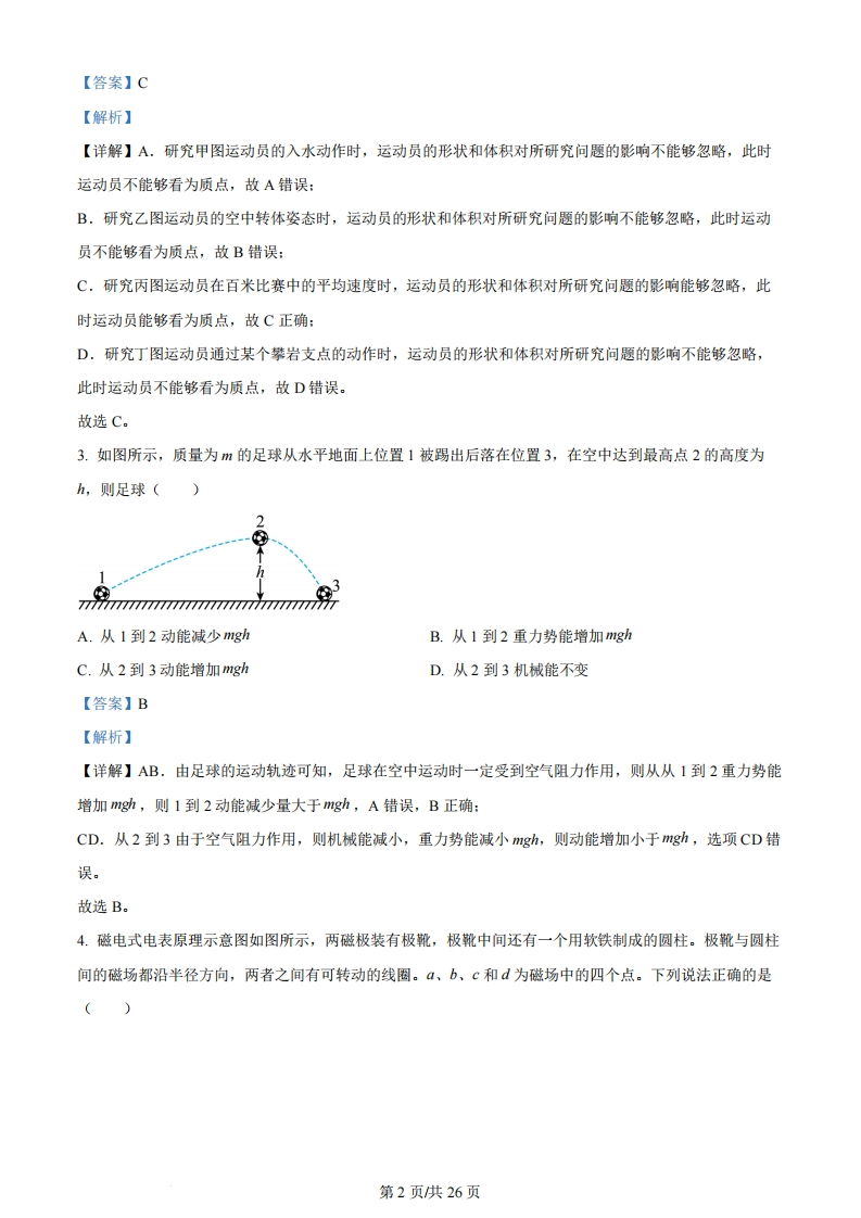 2024年1月浙江省普通高校招生选考科目考试考生注意:1.答题前,请务必将自己的姓名、准考证号用黑色字迹的签字笔或钢笔分别填写在试题卷和答题纸规定的位置上。2.答题时,请按照答题纸上“注意事项”的要求,在答题纸相应的位置上规范作答,在本试题卷上的作答一律无效。3.非选择题的答案必须使用黑色字迹的签字笔或钢笔写在答题纸上相应区域内,作图时可先使用2B铅笔,确定后必须使用黑色字迹的签字笔或钢笔描黑。4.可能用到的相关参数:重力加速度g取10m/s。选择题部分一、选择题1(本题共13小题,每小题3分,共39分。每小题列出的四个备选项中只有一个是符合题目要求的,不选、多选、错选均不得分)1.下列属于国际单位制基本单位符号的是()A.sB.NC.FD.T【答案】A【解析】【详解】国际单位制中的基本单位分别是:长度的单位是米,符号m:质量的单位是千克,符号kg:时间的单位是秒,符号$:电流的单位是安培,符号是A:热力学温度的单位是开尔文,符号K:物质的量单位是摩尔,符号mol:发光强度的单位是坎德拉,符号cd。故选A。2.杭州亚运会顺利举行,如图所示为运动会中的四个比赛场景。在下列研究中可将运动员视为质点的是甲:跳水乙:体操丙:百米比赛丁:攀岩A.研究甲图运动员的入水动作B.研究乙图运动员的空中转体姿态C.研究丙图运动员在百米比赛中的平均速度D.研究丁图运动员通过某个攀岩支点的动作第1页供26页【答案】C【解析】【详解】A,研究甲图运动员的入水动作时,运动员的形状和体积对所研究问题的影响不能够忽略,此时运动员不能够看为质点,故A错误:B.研究乙图运动员的空中转体姿态时,运动员的形状和体积对所研究问题的影响不能够忽略,此时运动员不能够看为质点,故B错误:C.研究丙图运动员在百米比赛中的平均速度时,运动员的形状和体积对所研究问题的影响能够忽略,此时运动员能够看为质点,故C正确:D.研究丁图运动员通过某个攀岩支点的动作时,运动员的形状和体积对所研究问题的影响不能够忽略,此时运动员不能够看为质点,故D错误。故选C。3.如图所示,质量为m的足球从水平地面上位置1被踢出后落在位置3,在空中达到最高点2的高度为h,则足球()377777777777777777777777777777777777777777A.从1到2动能减少mghB.从1到2重力势能增加mghC.从2到3动能增加mghD.从2到3机械能不变【答案】B【解析】【详解】AB.由足球的运动轨迹可知,足球在空中运动时一定受到空气阻力作用,则从从1到2重力势能增加mg,则1到2动能减少量大于mgh,A错误,B正确:CD.从2到3由于空气阻力作用,则机械能减小,重力势能减小mgh,则动能增加小于mgh,选项CD错误。故选B。4.磁电式电表原理示意图如图所示,两磁极装有极靴,极靴中间还有一个用软铁制成的圆柱。极靴与圆柱间的磁场都沿半径方向,两者之间有可转动的线圈。α、b、c和d为磁场中的四个点。下列说法正确的是第2页供26页极靴bA.图示左侧通电导线受到安培力向下B.a、b两点的磁感应强度相同C.圆柱内的磁感应强度处处为零D.c、d两点的磁感应强度大小相等【答案】A【解析】【详解】A,由左手定则可知,图示左侧通电导线受到安培力向下,选项A正确:B.a、b两点的磁感应强度大小相同,但是方向不同,选项B错误:C.磁感线是闭合的曲线,则圆柱内的磁感应强度不为零,选项C错误:D.因c点处的磁感线较d点密集,可知c点的磁感应强度大于d点的磁感应强度,选项D错误。故选A。5.如图为某燃气灶点火装置的原理图。直流电经转换器输出u=5 sin100πtV)的交流电,经原、副线圈匝数分别为乃和2的变压器升压至峰值大于10kV,就会在打火针和金属板间引发电火花,实现点火。下列正确的是(金转72换3打火针器h<7A.220000B.<1122000C.用电压表测原线圈两端电压,示数为5VD.副线圈输出交流电压的频率是100Hz【答案】B【解析】【详解】AB.原线圈两端电压的有效值第3页供26页