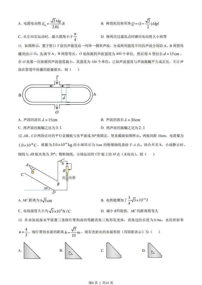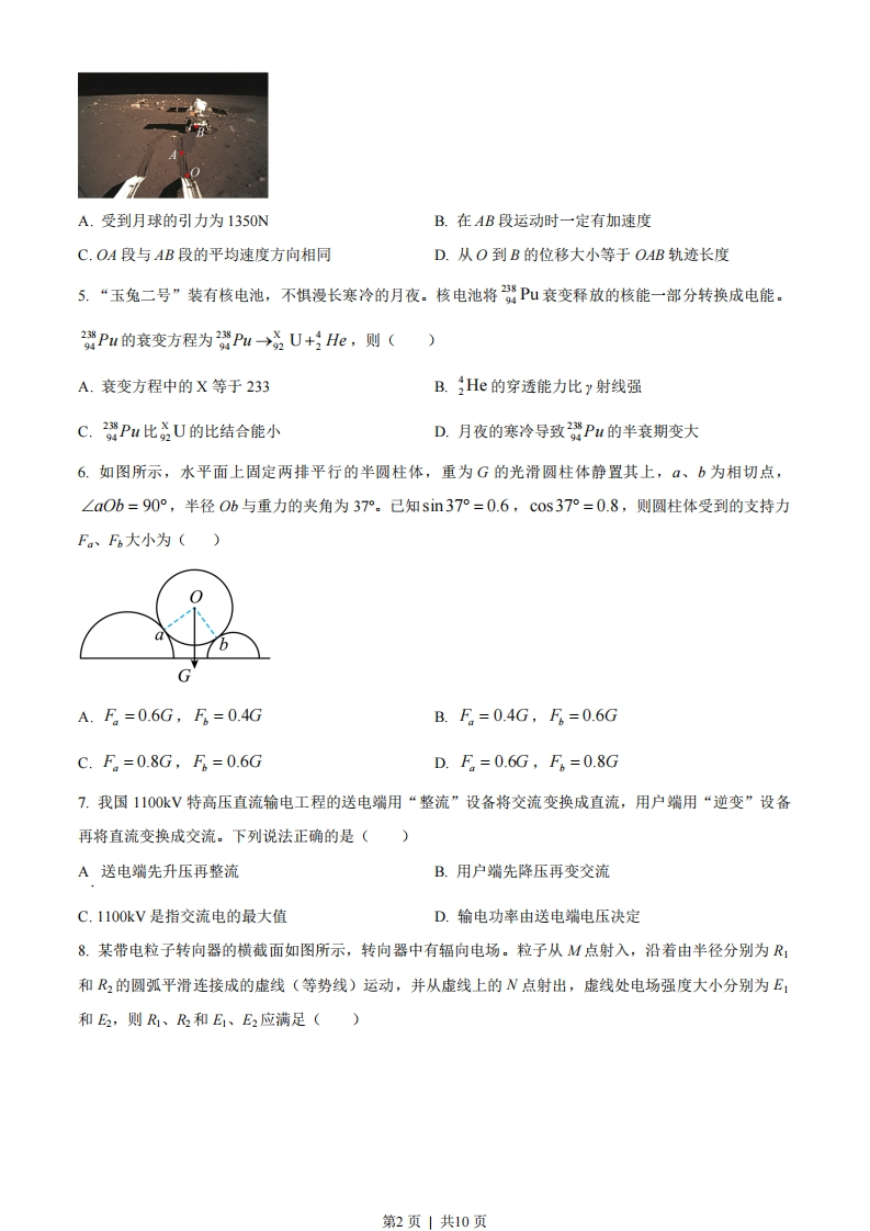 绝密★启用前2023年6月浙江省普通高校招生选考科目考试物理考生注意:1,答题前,请务必将自己的姓名,准考证号用黑色字迹的签字笔或钢笔分别填写在试题卷和答题纸规定的位置上。2.答题时,请按照答题纸上“注意事项”的要求,在答题纸相应的位置上规范作答,在本试题卷上的作答一律无效。3。非选择题的答案必须使用黑色字迹的签字笔或钢笔写在答题纸上相应区域内,作图时可先使用2B铅笔,确定后必须使用黑色字迹的签字笔或钢笔描黑。4.可能用到的相关参数:重力加速度g取10m/s2。选择题部分一、选择题I(本题共13小题,每小题3分,共39分。每小题列出的四个备选项中只有一个是符合题目要求的,不选、多选、错选均不得分)1.下列四组物理量中均为标量的是()A.电势电场强度B.热量功率C.动量动能D.速度加速度2.在足球运动中,足球入网如图所示,则()A.踢香蕉球时足球可视为质点B.足球在飞行和触网时惯性不变C.足球在飞行时受到脚的作用力和重力D.触网时足球对网的力大于网对足球的力3.铅球被水平推出后的运动过程中,不计空气阻力,下列关于铅球在空中运动时的加速度大小α、速度大小"、动能E和机械能E随运动时间t的变化关系中,正确的是()E4.图为“玉兔二号”巡视器在月球上从O处行走到B处的照片,轨迹OA段是直线,AB段是曲线,巡视器质量为135kg,则巡视器()第1页」共10页A.受到月球的引力为1350NB.在AB段运动时一定有加速度C.OA段与AB段的平均速度方向相同D.从O到B的位移大小等于OAB轨迹长度5。“玉兔二号”装有核电池,不惧漫长寒冷的月夜。核电池将Pu衰变释放的核能一部分转换成电能。2Pu的衰变方程为Pu→0U+He,则()A.衰变方程中的X等于233B.&He的穿透能力比y射线强C.Pu比U的比结合能小D.月夜的寒冷导致Pu的半衰期变大6.如图所示,水平面上固定两排平行的半圆柱体,重为G的光滑圆柱体静置其上,α、b为相切点,∠aOb=90°,半径0b与重力的夹角为37°。己知sin37°=0.6,c0s37°=0.8,则圆柱体受到的支持力Fa、F6大小为()GA.F=0.6G,F。=0.4GB.F=0.4G,F。=0.6GC.F=0.8G,F。=0.6GD.F=0.6G,F。=0.8G7.我国1100kV特高压直流输电工程的送电端用“整流”设备将交流变换成直流,用户端用“逆变”设备再将直流变换成交流。下列说法正确的是()A送电端先升压再整流B.用户端先降压再变交流C.1100kV是指交流电的最大值D.输电功率由送电端电压决定8.某带电粒子转向器的横截面如图所示,转向器中有辐向电场。粒子从M点射入,沿着由半径分别为R1和R2的圆弧平滑连接成的虚线(等势线)运动,并从虚线上的N点射出,虚线处电场强度大小分别为E,和E2,则R、R2和E1、E2应满足()第2页」共10页飞0REA.E-RE RB.C.E-RD.E2 RE2 R2E2 R29.木星的卫星中,木卫一、木卫二、木卫三做圆周运动的周期之比为1:2:4。木卫三周期为T,公转轨道半径是月球绕地球轨道半径r的n倍。月球绕地球公转周期为T),则()A.木卫一轨道半径为”,16B.木卫二轨道半径为2C周期T与之比为nD木星质量与地球质量之比为7310.如图所示,质量为M、电阻为R、长为L的导体棒,通过两根长均为1、质量不计的导电细杆连在等高的两固定点上,固定点间距也为L。细杆通过开关S可与直流电源E。或理想二极管串接。在导体棒所在空间存在磁感应强度方向竖直向上、大小为B的匀强磁场,不计空气阻力和其它电阻。开关$接1,当导体棒静止时,细杆与竖直方向的夹角固定点日=严:然后开关S接2,棒从右侧开始运动完成一次振动的过程中()2固定点左右LB第3页」共10页