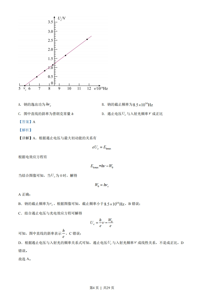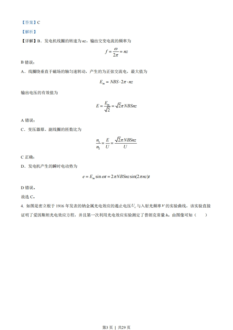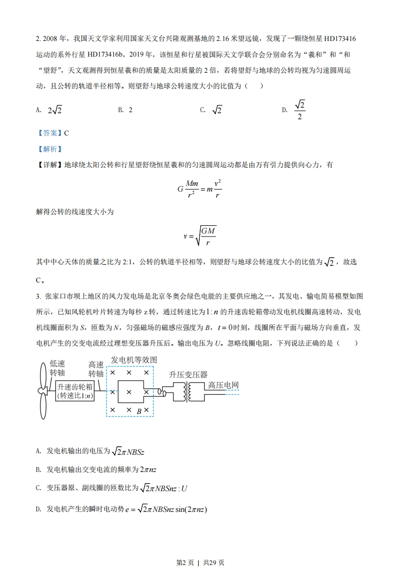 2022年河北省普通高中学业水平选择性考试(河北卷)理综物理部分本试卷满分100分,考试时间90分钟。一、单项选择题:本题共7小题,每小题4分,共28分。在每小题给出的四个选项中,只有一项是符合题目要求的。1.科学训练可以提升运动成绩,某短跑运动员科学训练前后百米全程测试中,速度ⅴ与时间:的关系图像如图所示。由图像可知()训练后训练前0A.0~1时间内,训练后运动员的平均加速度大B.0~t2时间内,训练前、后运动员跑过的距离相等C.2~3时间内,训练后运动员的平均速度小D.时刻后,运动员训练前做减速运动,训练后做加速运动【答案】D【解析】【详解】A.根据V一图像的斜率表示加速度,由题图可知O~1时间内,训练后运动员的平均加速度比训练前的小,故A错误:B.根据V一1图像围成的面积表示位移,由题图可知0~2时间内,训练前运动员跑过的距离比训练后的大,故B错误:C.根据V一图像围成的面积表示位移,由题图可知t2~t3时间内,训练后运动员的位移比训练前的位移大,根据平均速度等于位移与时间的比值,可知训练后运动员的平均速度大,故C错误:D.根据一图像可直接判断知,1时刻后,运动员训练前速度减小,做减速运动:(时刻后,运动员训练后速度增加,做加速运动,故D正确。故选D。第1页」共29页2.2008年,我国天文学家利用国家天文台兴隆观测基地的2.16米望远镜,发现了一颗绕恒星HD173416运动的系外行星HD173416b,2019年,该恒星和行星被国际天文学联合会分别命名为“羲和”和“和“望舒”,天文观测得到恒星羲和的质量是太阳质量的2倍,若将望舒与地球的公转均视为匀速圆周运动,且公转的轨道半径相等。则望舒与地球公转速度大小的比值为()A.2V2B.2C.√迈D.√迈2【答案】C【解析】【详解】地球绕太阳公转和行星望舒绕恒星羲和的匀速圆周运动都是由万有引力提供向心力,有m1v2G-=m解得公转的线速度大小为其中中心天体的质量之比为2:1,公转的轨道半径相等,则望舒与地球公转速度大小的比值为√互,故选Co3.张家口市坝上地区的风力发电场是北京冬奥会绿色电能的主要供应地之一,其发电、输电简易模型如图所示,己知风轮机叶片转速为每秒z转,通过转速比为1:的升速齿轮箱带动发电机线圈高速转动,发电机线圈面积为S,匝数为N,匀强磁场的磁感应强度为B,1=0时刻,线圈所在平面与磁场方向垂直,发电机产生的交变电流经过理想变压器升压后。输出电压为U。忽略线圈电阻,下列说法正确的是()低速高速发电机等效图转轴转轴升压变压器升速齿轮箱高压电网(转速比1:n)X BXA.发电机输出的电压为√2πNBSzB.发电机输出交变电流的频率为2πnzC.变压器原、副线圈的匝数比为√2πNBSz:UD.发电机产生的瞬时电动势e=√2πVBSnz sin(2πnz)第2页」共29页【答案】C【解析】【详解】B.发电机线圈的转速为,输出交变电流的频率为∫-2=nzB错误:A,线圈绕垂直于磁场的轴匀速转动,产生的为正弦交流电,最大值为Em=NBS.2πnz输出电压的有效值为E==rNBSnEv2A错误:C.变压器原、副线圈的匝数比为及-E=V2πNBSen UC正确:D.发电机产生的瞬时电动势为e=E sin ot=2πVBSnzsin(2πnz)tD错误。故选C。4.如图是密立根于1916年发表的钠金属光电效应的遏止电压U。与入射光频率V的实验曲线,该实验直接证明了爱因斯坦光电效应方程,并且第一次利用光电效应实验测定了普朗克常量。由图像可知()第3页共29页