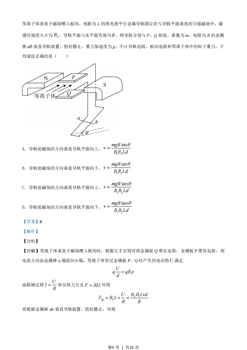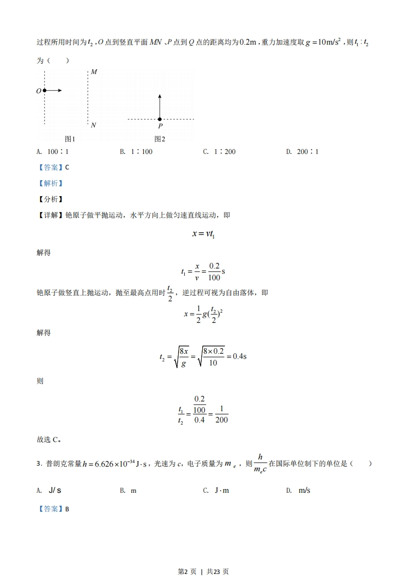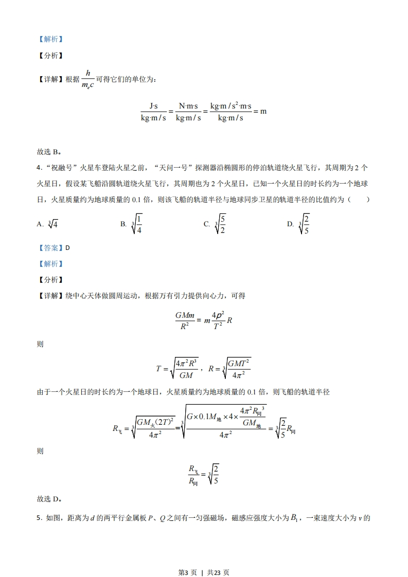 2021年河北省普通高中学业水平选择性考试物理注意事项:1.答卷前,考生务必将自己的姓名、考生号、考场号、座位号填写在答题卡上.2,回答选择题时,选出每小题答案后,用铅笔把答题卡上对应题目的答案标号涂黑。如需改动,用橡皮擦干净后,再选涂其他答案标号。回答非选择题时,将答案写在答题卡上,写在本试卷上无效.3.考试结束后,将本试卷和答题卡一并交回.一、单项选释题:本题共7小题,每小题4分,共28分。在每小题给出的四个选项中,只有一项是符合题目要求的.1.银河系中存在大量的铝同位素26Al,26Al核B衰变的衰变方程为Al→Mg+9e,测得“Al核的半衰期为72万年,下列说法正确的是()A.茹Al核的质量等于5Mg核的质量B.26Al核的中子数大于26Mg核的中子数C.将铝同位素5A1放置在低温低压的环境中,其半衰期不变D.银河系中现有的铝同位素26A1将在144万年后全部衰变为6Mg【答案】C【解析】【分析】【详解】A.26A1和26Mg的质量数均为26相等,但是二者原子核中的质子数和中子数不同,所以质量不同,A错误:B.A1核的中子数为26-13=13个,Mg核的中子数为26-12=14个,B错误:C.半衰期是原子核固有的属性,与外界条件无关,C正确:D.质量为m的“A1的半衰期为2万年,经过144=2×72万年为2个半衰期,剩余质量为4m,不会全部衰变为26Mg,D错误。故选C。2.铯原子钟是精确的计时仪器,图1中铯原子从O点以100/s的初速度在真空中做平抛运动,到达竖直平面N所用时间为:图2中铯原子在真空中从P点做竖直上抛运动,到达最高点Q再返回P点,整个第1页1共23页过程所用时间为2,O点到竖直平面MN、P点到2点的距离均为0.2m,重力加速度取g=10m/s,则:52为().M:0◆N图1图2A.100:1B.1:100C.1:200D.200:1【答案】C【解析】【分析】【详解】铯原子做平抛运动,水平方向上做匀速直线运动,即x=vh解得x0.241=二=y100铯原子做竖直上抛运动,抛至最高点用时三,逆过程可视为自由落体,即212解得8x8×0.2=0.4sV10则0.2=100=1520.4200故选C。3.普朗克常量h=6.626×10-34Js,光速为c,电子质量为m。,则在国际单位制下的单位是()m.cA.J/SB.mC.J.mD.m/s【答案】B第2页1共23页【解析】【分析】h【详解】根据一可得它们的单位为:m.cJs Nmskgm/s'ms-mkg'm/s kgm/s kg'm/s故选B。4.“祝融号”火星车登陆火星之前,“天问一号”探测器沿椭圆形的停泊轨道绕火星飞行,其周期为2个火星日,假设某飞船沿圆轨道绕火星飞行,其周期也为2个火星日,己知一个火星日的时长约为一个地球日,火星质量约为地球质量的0.1倍,则该飞船的轨道半径与地球同步卫星的轨道半径的比值约为()A.4B【答案】D【解析】【分析】【详解】绕中心天体做圆周运动,根据万有引力提供向心力,可得GMm=mR2T2-R则4π2R3GMT2T二A了几ft三3由于一个火星日的时长约为一个地球日,火星质量约为地球质量的0.1倍,则飞船的轨道半径4π2RGM(2TG×0.1M×4×2Rt=GM地4π24π2则得故选D。5.如图,距离为d的两平行金属板P、Q之间有一匀强磁场,磁感应强度大小为B,一束速度大小为v的第3页1共23页