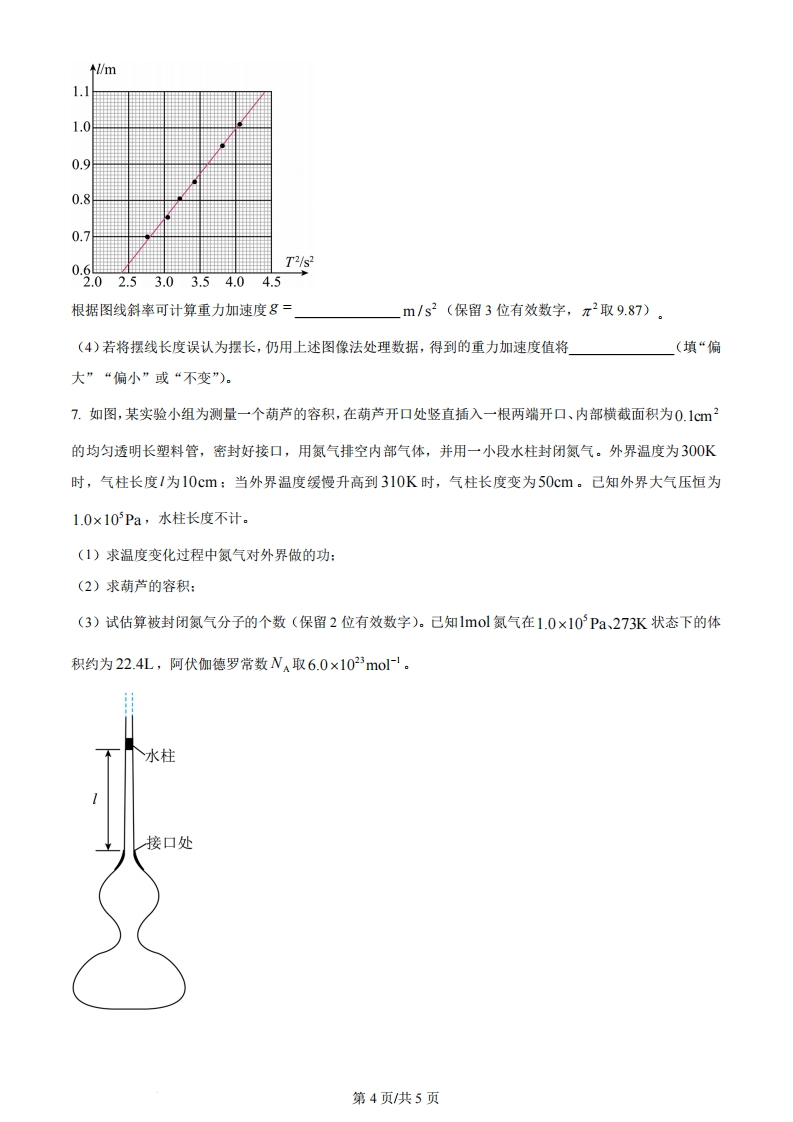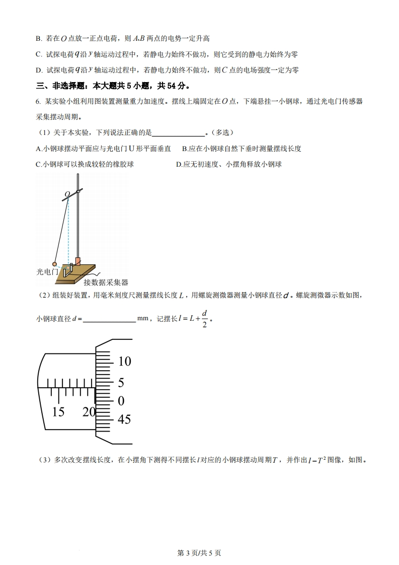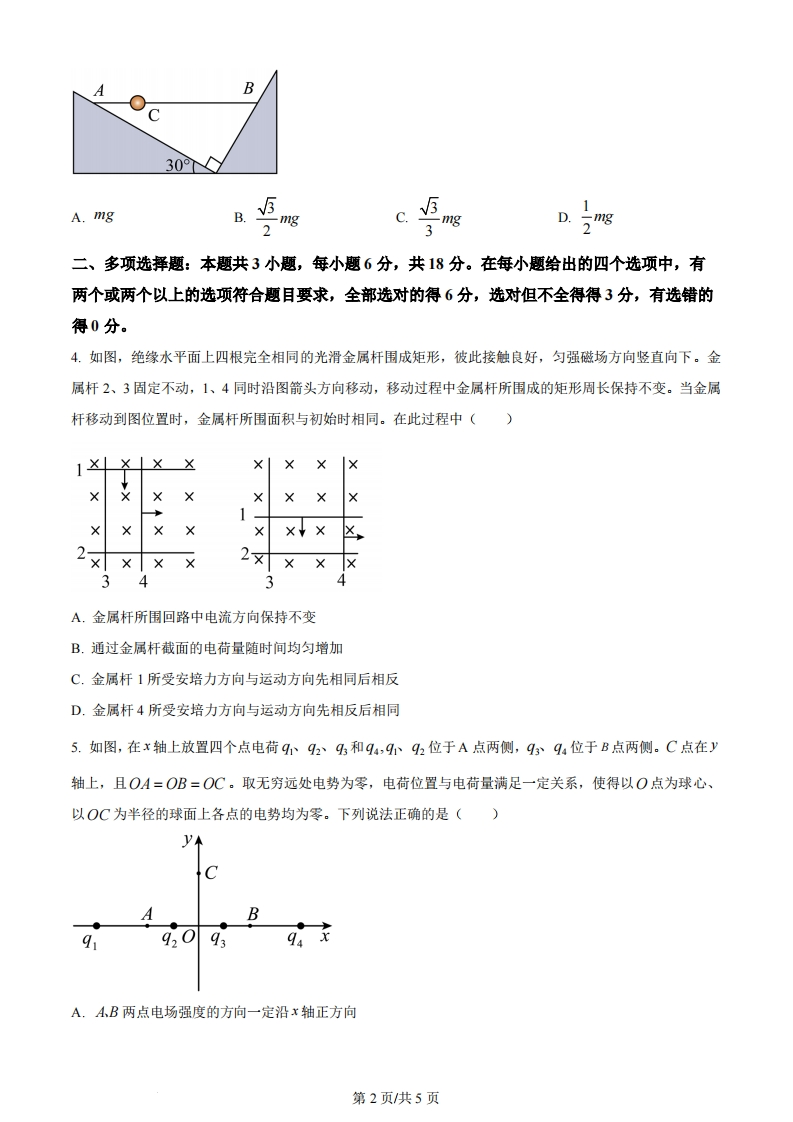 2023年河北省普通高中学业水平等级选择性考试物理注意事项:1.答卷前,考生务必将自已姓名,考生号、考场号、座位号填写在答题卡上。2.回答选择题时,选出每小题答案后,用铅笔把答题卡上对应题目的答案标号涂黑。如需改动,用橡皮擦干净后,再选涂其他答案标号。回答非选择题时,将答案写在答题卡上,写在本试卷上无效。3.考试结束后,将本试卷和答题卡一并交回。一、单项选择题:本题共7小题,每小题4分,共28分。在每小题给出的四个选项中,只有一项是符合题目要求的。1,2022年8月30日,国家航天局正式发布了“羲和号”太阳探测卫星国际上首次在轨获取的太阳H。谱线精细结构。H是氢原子巴耳末系中波长最长的谱线,其对应的能级跃迁过程为()巴耳末系E/eV0005-0.54-0.853-1.512-3.40A.从0跃迁到n=2B.从n=5跃迁到n=2C.从n=4跃迁到n=2D.从n=3跃迁到n=22.制造某型芯片所使用的银灰色硅片覆上一层厚度均匀的无色透明薄膜后,在自然光照射下硅片呈现深紫色。关于此现象,下列说法正确的是()A.上述现象与彩虹的形成原理相同B.光在薄膜的下表面发生了全反射C.薄膜上下表面的反射光发生了干涉D.薄膜厚度发生变化,硅片总呈现深紫色3.如图,轻质细杆AB上穿有一个质量为m的小球C,将杆水平置于相互垂直的固定光滑斜面上,系统恰好处于平衡状态。己知左侧斜面与水平面成30°角,则左侧斜面对杆AB支持力的大小为()第1页共5页ABoc301A.mg-111g171gD.mg3二、多项选择题:本题共3小题,每小题6分,共18分。在每小题给出的四个选项中,有两个或两个以上的选项符合题目要求,全部选对的得6分,选对但不全得得3分,有选错的得0分。4.如图,绝缘水平面上四根完全相同的光滑金属杆围成矩形,彼此接触良好,匀强磁场方向竖直向下。金属杆2、3固定不动,1、4同时沿图箭头方向移动,移动过程中金属杆所围成的矩形周长保持不变。当金属杆移动到图位置时,金属杆所围面积与初始时相同。在此过程中()XX1区2××××2x××33A.金属杆所围回路中电流方向保持不变B.通过金属杆截面的电荷量随时间均匀增加C.金属杆1所受安培力方向与运动方向先相同后相反D.金属杆4所受安培力方向与运动方向先相反后相同5.如图,在x轴上放置四个点电荷9929和94,492位于A点两侧,939位于B点两侧。C点在八轴上,且OA=OB=OC。取无穷远处电势为零,电荷位置与电荷量满足一定关系,使得以O点为球心、以OC为半径的球面上各点的电势均为零。下列说法正确的是()AB99209394xA.AB两点电场强度的方向一定沿x轴正方向第2页共5页B.若在O点放一正点电荷,则AB两点的电势一定升高C.试探电荷q沿y轴运动过程中,若静电力始终不做功,则它受到的静电力始终为零D.试探电荷q沿y轴运动过程中,若静电力始终不做功,则C点的电场强度一定为零三、非选释题:本大题共5小题,共54分。6.某实验小组利用图装置测量重力加速度。摆线上端固定在O点,下端悬挂一小钢球,通过光电门传感器采集摆动周期。(1)关于本实验,下列说法正确的是。(多选)A.小钢球摆动平面应与光电门U形平面垂直B.应在小钢球自然下垂时测量摆线长度C.小钢球可以换成较轻的橡胶球D.应无初速度、小摆角释放小钢球光电门「接数据采集器(2)组装好装置,用毫米刻度尺测量摆线长度L,用螺旋测微器测量小钢球直径d。螺旋测微器示数如图,小钢球直径d=mm,记摆长1=L+d1050152045(3)多次改变摆线长度,在小摆角下测得不同摆长1对应的小钢球摆动周期T,并作出1-T2图像,如图。第3页共5页