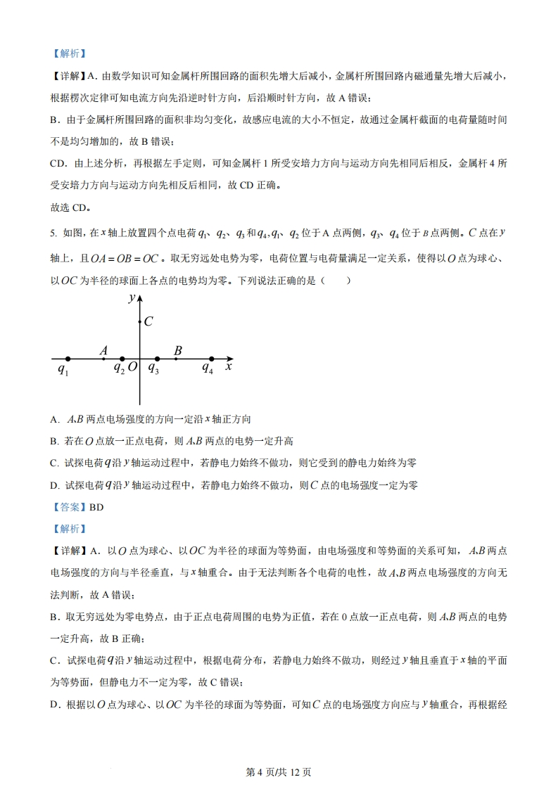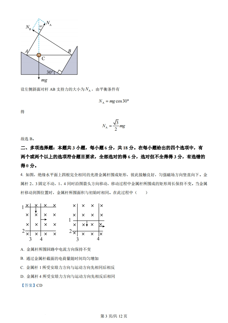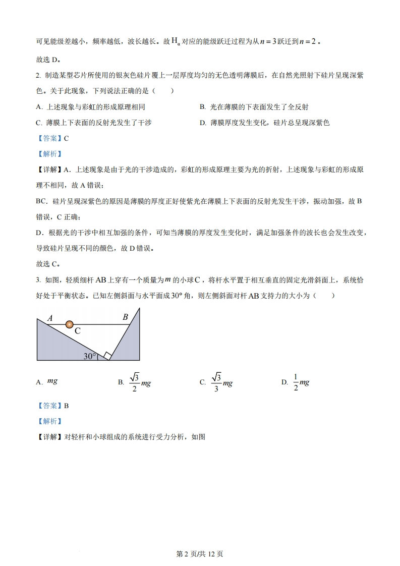 2023年河北省普通高中学业水平等级选择性考试物理注意事项:1.答卷前,考生务必将自已姓名,考生号、考场号、座位号填写在答题卡上。2.回答选择题时,选出每小题答案后,用铅笔把答题卡上对应题目的答案标号涂黑。如需改动,用橡皮擦干净后,再选涂其他答案标号。回答非选择题时,将答案写在答题卡上,写在本试卷上无效。3.考试结后,将本试卷和答题卡一并交回。一、单项选择题:本题共7小题,每小题4分,共28分。在每小题给出的四个选项中,只有一项是符合题目要求的。1,2022年8月30日,国家航天局正式发布了“羲和号”太阳探测卫星国际上首次在轨获取的太阳H。谱线精细结构。H是氢原子巴耳末系中波长最长的谱线,其对应的能级跃迁过程为()巴耳末系E/eV0005-0.54-0.853-1.512-3.40A.从0跃迁到n=2B.从n=5跃迁到n=2C.从n=4跃迁到n=2D.从n=3跃迁到n=2【答案】D【解析】【详解】H。是氢原子巴耳末系中波长最长的谱线,根据可知H。是氢原子巴耳末系中频率最小的谱线,根据氢原子的能级图,利用玻尔理论中的频率条件hv E-E2第1页供12页可见能级差越小,频率越低,波长越长。故H。对应的能级跃迁过程为从n=3跃迁到n=2。故选D。2.制造某型芯片所使用的银灰色硅片覆上一层厚度均匀的无色透明薄膜后,在自然光照射下硅片呈现深紫色。关于此现象,下列说法正确的是()A.上述现象与彩虹的形成原理相同B.光在薄膜的下表面发生了全反射C.薄膜上下表面的反射光发生了干涉D.薄膜厚度发生变化,硅片总呈现深紫色【答案】C【解析】【详解】A.上述现象是由于光的干涉造成的,彩虹的形成原理主要为光的折射,上述现象与彩虹的形成原理不相同,故A错误:BC.硅片呈现深紫色的原因是薄膜的厚度正好使紫光在薄膜上下表面的反射光发生干涉,振动加强,故B错误,C正确:D.根据光的干涉中相互加强的条件,可知当薄膜的厚度发生变化时,满足加强条件的波长也会发生改变,导致硅片呈现不同的颜色,故D错误。故选C。3.如图,轻质细杆AB上穿有一个质量为m的小球C,将杆水平置于相互垂直的固定光滑斜面上,系统恰好处于平衡状态。己知左侧斜面与水平面成30°角,则左侧斜面对杆AB支持力的大小为()B300A.mgB.C.D.13-mg【答案】B【解析】【详解】对轻杆和小球组成的系统进行受力分析,如图第2页供12页N30⊙mg设左侧斜面对杆AB支持力的大小为NA,由平衡条件有VA=mg cos.30°得⊙N=之m8故选B。二、多项选择题:本题共3小题,每小题6分,共18分。在每小题给出的四个选项中,有两个或两个以上的选项符合题目要求,全部选对的得6分,选对但不全得得3分,有选错的得0分。4.如图,绝缘水平面上四根完全相同的光滑金属杆围成矩形,彼此接触良好,匀强磁场方向竖直向下。金属杆2、3固定不动,1、4同时沿图箭头方向移动,移动过程中金属杆所围成的矩形周长保持不变。当金属杆移动到图位置时,金属杆所围面积与初始时相同。在此过程中()XXXX22×××】343A.金属杆所围回路中电流方向保持不变B.通过金属杆截面的电荷量随时间均匀增加C.金属杆1所受安培力方向与运动方向先相同后相反D.金属杆4所受安培力方向与运动方向先相反后相同【答案】CD第3页供12页