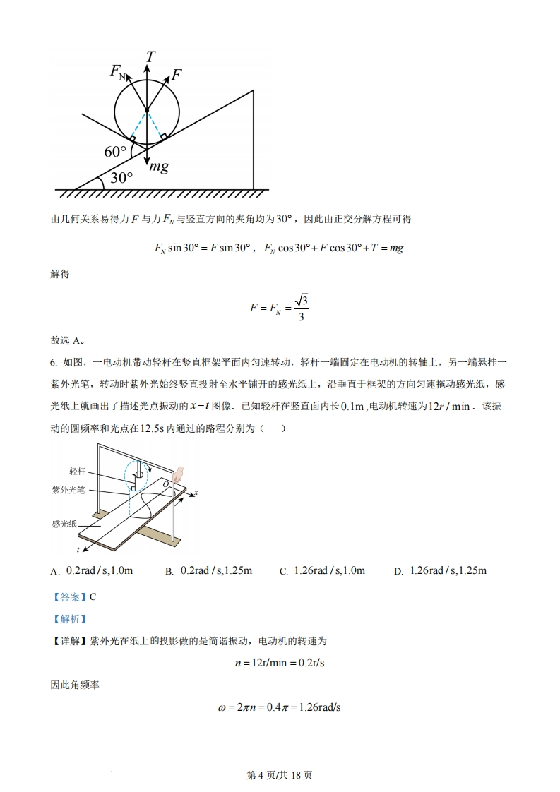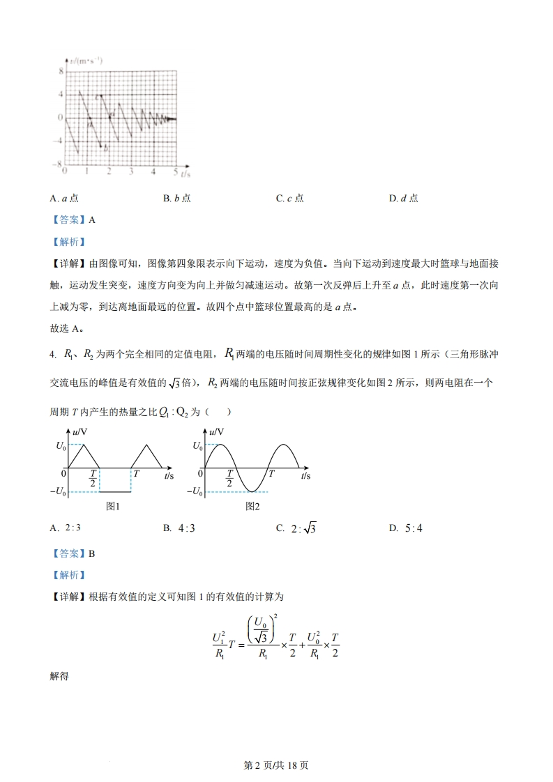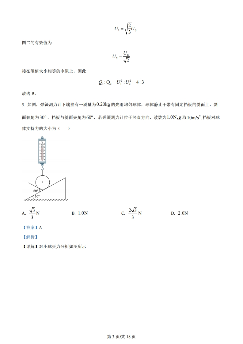 2024年普通高中学业水平选择性考试(河北卷)物理试题本试卷共100分,考试时间75分钟.一、单项选择题:本题共7小题,每小题4分,共28分.在每小题给出的四个选项中,只有一项是符合题目要求的.1.锂是新能源汽车、储能和信息通信等新兴产业的关键材料.研究表明,锂元素主要来自宇宙线高能粒子与星际物质的原子核产生的散裂反应,其中一种核反应方程为C+H→了Li+2H+X,式中的X为()A.onB.eC."eD.He【答案】D【解析】【详解】根据核反应前后质量数和电荷数守恒得A=12+1-7-2×1=4,Z=6+1-3-2×1=2故式中的X为2He,故选D。2.我国古人最早发现了尖端放电现象,并将其用于生产生活,如许多古塔的顶端采用“伞状”金属饰物在雷雨天时保护古塔。雷雨中某时刻,一古塔顶端附近等势线分布如图所示,相邻等势线电势差相等,则a、b、c、d四点中电场强度最大的是()A.a点B.b点C.c点D.d点【答案】C【解析】【详解】在静电场中,等差等势线的疏密程度反映电场强度的大小。图中℃点的等差等势线相对最密集,故该点的电场强度最大。故选C。3.篮球比赛前,常通过观察篮球从一定高度由静止下落后的反弹情况判断篮球的弹性。某同学拍摄了该过程,并得出了篮球运动的v一t图像,如图所示。图像中a、b、c、d四点中对应篮球位置最高的是()第1页供18页:/(m's)5 tsA.a点B.b点C.c点D.d点【答案】A【解析】【详解】由图像可知,图像第四象限表示向下运动,速度为负值。当向下运动到速度最大时篮球与地面接触,运动发生突变,速度方向变为向上并做匀减速运动。故第一次反弹后上升至α点,此时速度第一次向上减为零,到达离地面最远的位置。故四个点中篮球位置最高的是α点。故选A。4.R、R2为两个完全相同的定值电阻,R两端的电压随时间周期性变化的规律如图1所示(三角形脉冲交流电压的峰值是有效值的√万倍),R两端的电压随时间按正弦规律变化如图2所示,则两电阻在一个周期T内产生的热量之比Q:Q2为()个u/V个u/VU.-Uo图1图2A.2:3B.4:3C.2:5D.5:4【答案】B【解析】【详解】根据有效值的定义可知图1的有效值的计算为r=RR2R2解得第2页供18页图二的有效值为接在阻值大小相等的电阻上,因此01:Q2=U7:U2=4:3故选B。5.如图,弹簧测力计下端挂有一质量为020kg的光滑均匀球体,球体静止于带有固定挡板的斜面上,斜面倾角为30°,挡板与斜面夹角为60°.若弹簧测力计位于竖直方向,读数为1.0N,g取10m/s2,挡板对球体支持力的大小为()60°nmmn及NAB.1.0NC.25ND.2.0N【答案】A【解析】【详解】对小球受力分析如图所示第3页供18页