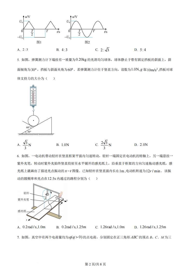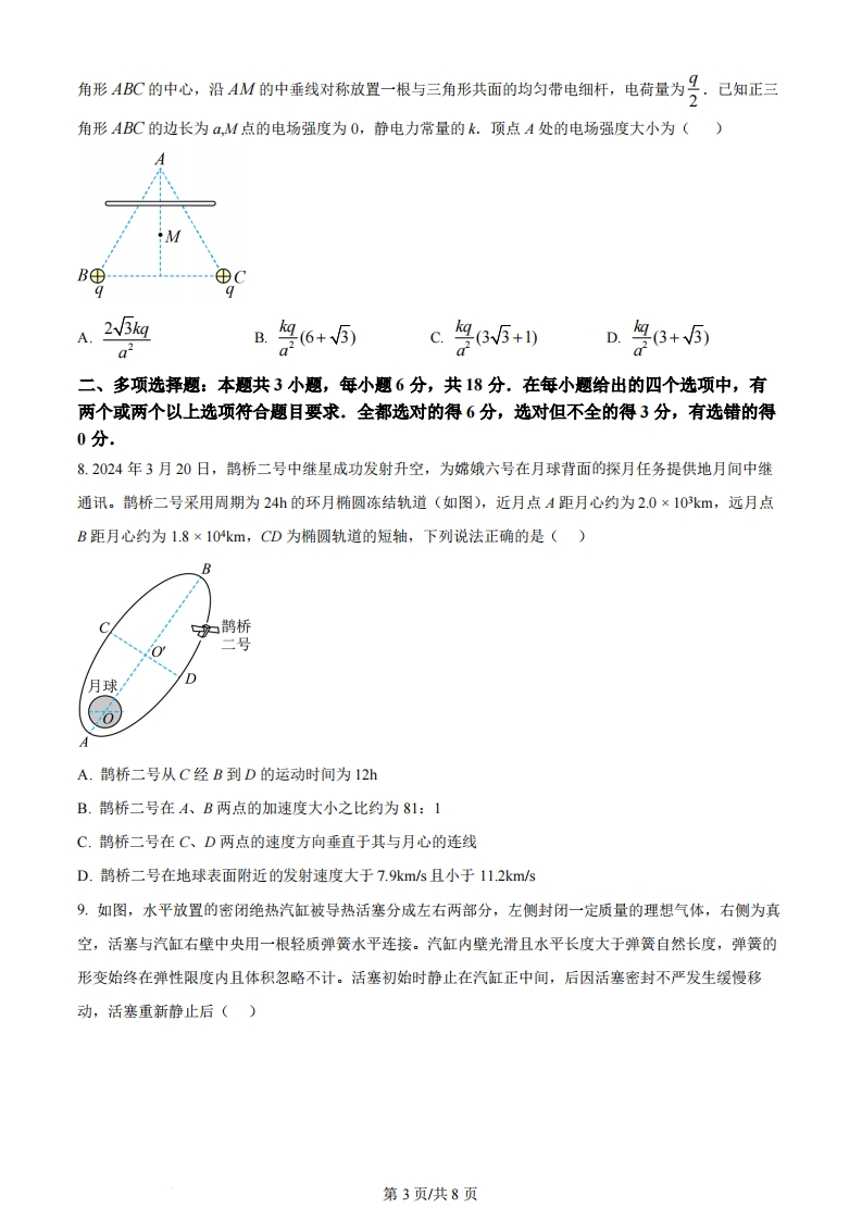 2024年普通高中学业水平选择性考试(河北卷)物理试题本试卷共100分,考试时间75分钟.一、单项选择题:本题共7小题,每小题4分,共28分.在每小题给出的四个选项中,只有一项是符合题目要求的,1.锂是新能源汽车、储能和信息通信等新兴产业的关键材料.研究表明,锂元素主要来自宇宙线高能粒子与星际物质的原子核产生的散裂反应,其中一种核反应方程为C+H→了Li+2H+X,式中的X为()A.onB.eC.eD.He2.我国古人最早发现了尖端放电现象,并将其用于生产生活,如许多古塔的顶端采用“伞状”金属饰物在雷雨天时保护古塔。雷雨中某时刻,一古塔顶端附近等势线分布如图所示,相邻等势线电势差相等,则a、b、c、d四点中电场强度最大的是()A.a点B.b点C.c点D.d点3.篮球比赛前,常通过观察篮球从一定高度由静止下落后的反弹情况判断篮球的弹性。某同学拍摄了该过程,并得出了篮球运动的v-t图像,如图所示。图像中a、b、c、d四点中对应篮球位置最高的是()◆/msA.a点B.b点C.c点D.d点4.R、R,为两个完全相同的定值电阻,R两端的电压随时间周期性变化的规律如图1所示(三角形脉冲交流电压的峰值是有效值的√万倍),R,两端的电压随时间按正弦规律变化如图2所示,则两电阻在一个周期T内产生的热量之比9:Q2为()第1页共8页0t/s0U。图1图2A.2:3B.4:3C.2:V5D.5:45.如图,弹簧测力计下端挂有一质量为0.20kg的光滑均匀球体,球体静止于带有固定挡板的斜面上,斜面倾角为30°,挡板与斜面夹角为60°.若弹簧测力计位于竖直方向,读数为1.0N,g取10m/s2,挡板对球体支持力的大小为()60°CCacottuuucA.B.1.0ND.2.0N6.如图,一电动机带动轻杆在竖直框架平面内匀速转动,轻杆一端固定在电动机的转轴上,另一端悬挂一紫外光笔,转动时紫外光始终竖直投射至水平铺开的感光纸上,沿垂直于框架的方向匀速拖动感光纸,感光纸上就画出了描述光点振动的x-t图像.己知轻杆在竖直面内长0.1m,电动机转速为l2r/mi.该振动的圆频率和光点在12.5s内通过的路程分别为()轻杆紫外光笔感光纸tA.0.2rad/s,1.0mB.0.2rad/s,1.25mc.1.26rad/s,1.0mD.1.26rad/s,1.25m7.如图,真空中有两个电荷量均为q(q>O)的点电荷,分别固定在正三角形ABC的顶点B、C.M为三第2页/共8页角形ABC的中心,沿AM的中垂线对称放置一根与三角形共面的均匀带电细杆,电荷量为?.己知正三角形ABC的边长为a,M点的电场强度为0,静电力常量的k.顶点A处的电场强度大小为()B⊕⊕A.23kg93B.g(6+5)cg(65+)D.鸟B+5)aaa二、多项选择题:本题共3小题,每小题6分,共18分.在每小题给出的四个选项中,有两个或两个以上选项符合题目要求.全都选对的得6分,选对但不全的得3分,有选错的得0分.8.2024年3月20日,鹊桥二号中继星成功发射升空,为嫦娥六号在月球背面的探月任务提供地月间中继通讯。鹊桥二号采用周期为24h的环月椭圆冻结轨道(如图),近月点A距月心约为2.0×103km,远月点B距月心约为1.8×10km,CD为椭圆轨道的短轴,下列说法正确的是()BC护鹊桥二号月球A.鹊桥二号从C经B到D的运动时间为12hB.鹊桥二号在A、B两点的加速度大小之比约为81:1C.鹊桥二号在C、D两点的速度方向垂直于其与月心的连线D.鹊桥二号在地球表面附近的发射速度大于7.9km/s且小于11.2km/s9.如图,水平放置的密闭绝热汽缸被导热活塞分成左右两部分,左侧封闭一定质量的理想气体,右侧为真空,活塞与汽缸右壁中央用一根轻质弹簧水平连接。汽缸内壁光滑且水平长度大于弹簧自然长度,弹簧的形变始终在弹性限度内且体积忽略不计。活塞初始时静止在汽缸正中间,后因活塞密封不严发生缓慢移动,活塞重新静止后()第3页共8页