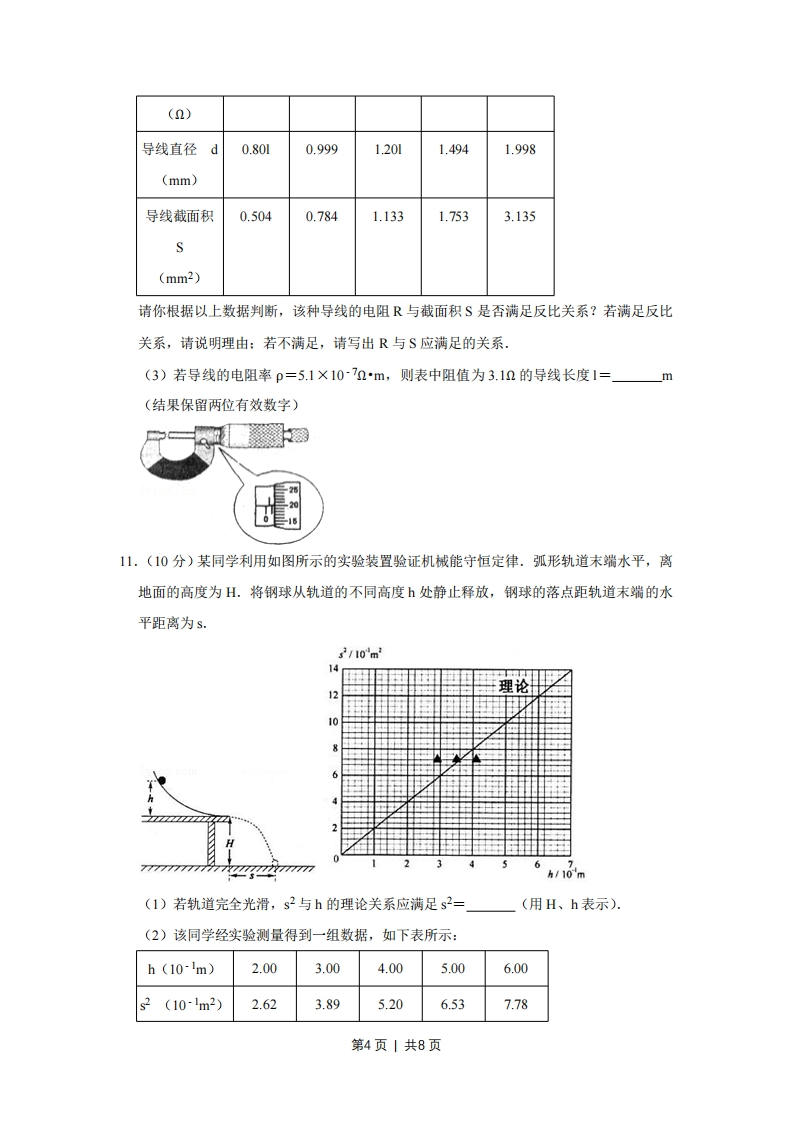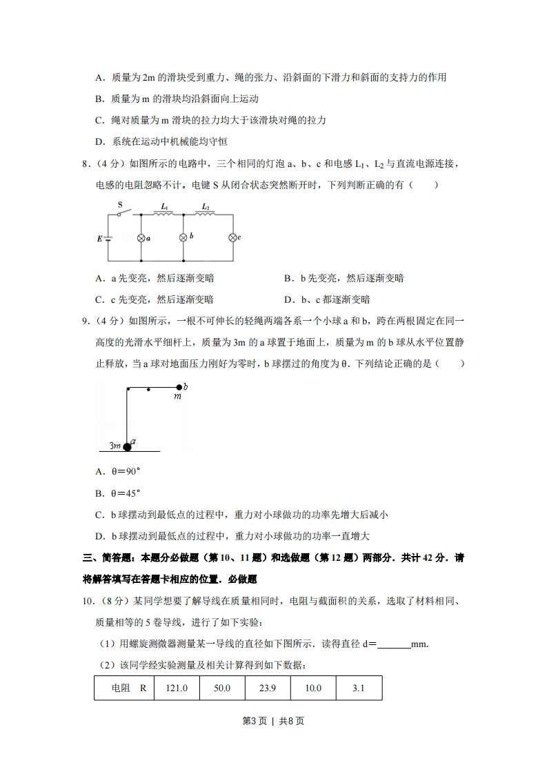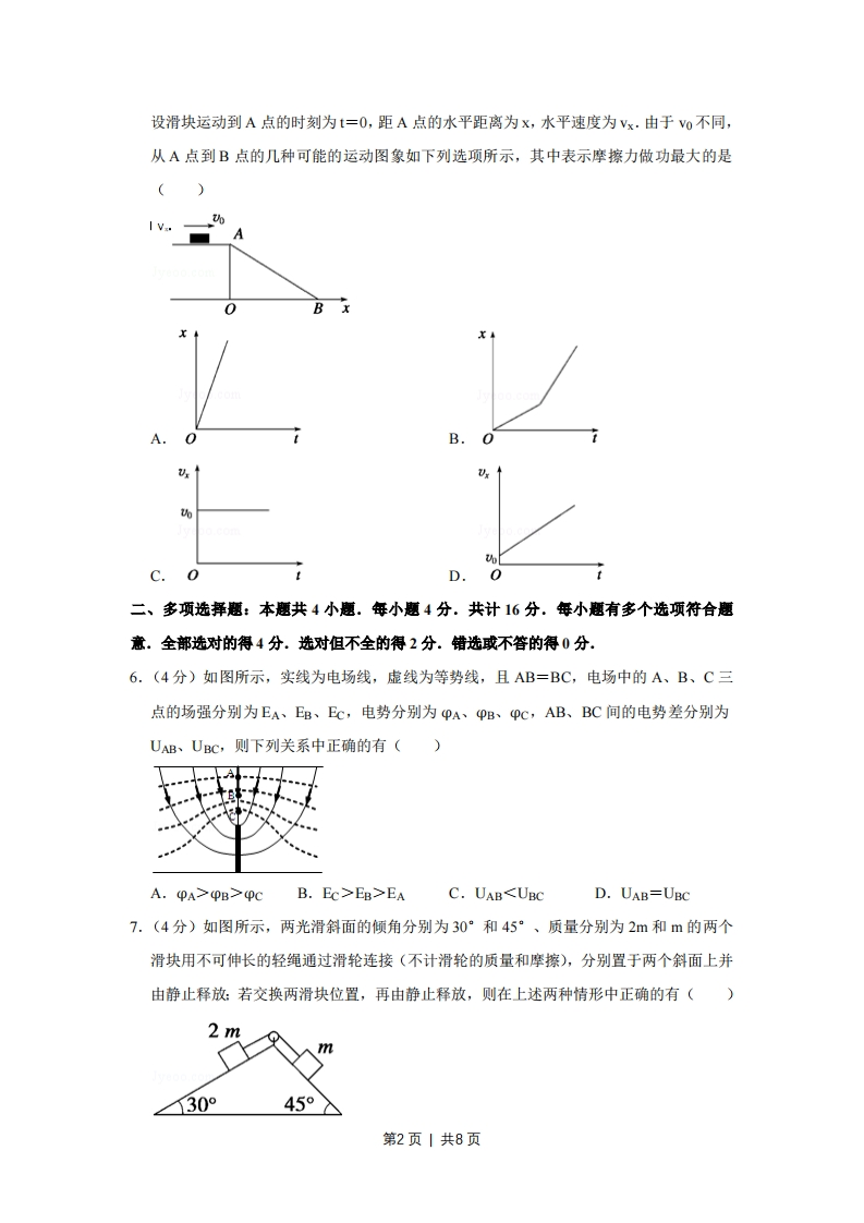 2008年江苏省高考物理试卷一、单项选释题:本题共5小题,每小题3分,共计15分,每小题只有一个选项符合题意.1.(3分)火星的质量和半径分别约为地球的二和三,地球表面的重力加速度为g,则火星102表面的重力加速度约为()A.0.2gB.0.4gC.2.5gD.5g2.(3分)2007年度诺贝尔物理学奖授子了法国和德国的两位科学家,以表彰他们发现“巨磁电阻效应”.基于巨磁电阻效应开发的用于读取硬盘数据的技术,被认为是纳米技术的第一次真正应用.在下列有关其它电阻应用的说法中,错误的是()A.热敏电阻可应用于温度测控装置中B.光敏电阻是一种光电传感器C.电阻丝可应用于电热设备中D.电阻在电路中主要起到通过直流、阻碍交流的作用3.(3分)一质量为M的探空气球在匀速下降,若气球所受浮力F始终保持不变,气球在运动过程中所受阻力仅与速率有关,重力加速度为g.现欲使该气球以同样速率匀速上升,则需从气球吊篮中减少的质量为()A.2(M-E)B.M-2C.2M-ED.g4.(3分)在如图所示的逻辑电路中,当A端输入电信号“1”、B端输入电信号“0”时,则在C和D端输出的电信号分别为()A○BOODA.1和0B.0和1C.1和1D.0和05.(3分)如图所示,粗糙的斜面与光滑的水平面相连接,滑块沿水平面以速度Vo运动,第1页|共8页设滑块运动到A点的时刻为=0,距A点的水平距离为x,水平速度为Vx·由于Vo不同,从A点到B点的几种可能的运动图象如下列选项所示,其中表示摩擦力做功最大的是Vo[C.0D.O二、多项选择题:本题共4小题.每小题4分.共计16分,每小题有多个选项符合题意。全部选对的得4分.选对但不全的得2分。错选或不答的得0分.6.(4分)如图所示,实线为电场线,虚线为等势线,且AB=BC,电场中的A、B、C三点的场强分别为EA、EB、EC,电势分别为pA、pB、pC,AB、BC间的电势差分别为UAB、UBC,则下列关系中正确的有()A.PA>B>c B.Ec>EB>EAC.UAB