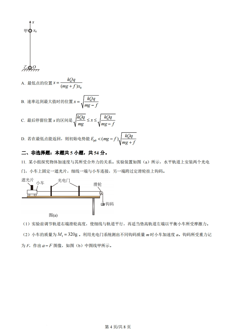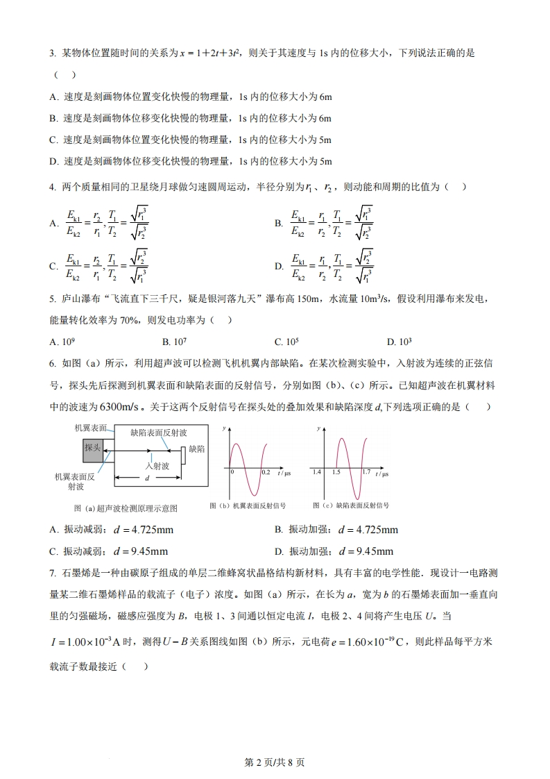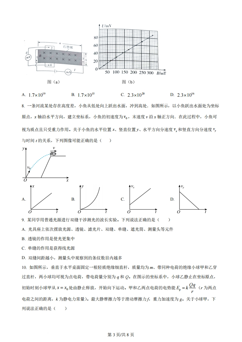 2024年普通高等学校招生全国统一考试物理(江西卷)注意事项:1答卷前,考生务必将自己的姓名、考生号等填写在答题卡和试卷指定位置。2.回答选择题时,选出每小题答案后,用铅笔把答题卡上对应题目的答案标号涂黑。如需改动,用橡皮擦干净后,再选涂其他答案标号。回答非选释题时,将答案写在答题卡上。写在本试卷上无效。3.考试结束后,将本试卷和答题卡一并交回。一、选择题:本题共10小题,共46分。在每小题给出的四个选项中,第1~7题只有一项符合题目要求,每小题4分;第8~10题有多项符合题目要求,每小题6分,全部选对的得6分,选对但不全的得3分,有选错的得0分。1.极板间一蜡烛火焰带有正离子、电子以及其他的带电粒子,两极板电压保持不变,当电极板距离减小时,电场强度如何变?电子受力方向?()A.电场强度增大,方向向左B.电场强度增大,方向向右C.电场强度减小,方向向左D.电场强度减小,方向向右2.近年来,江西省科学家发明硅衬底氮化镓基系列发光二极管,开创了国际上第三条LED技术路线。某氮化镓基LED材料的简化能级如图所示,若能级差为2.20eV(约3.52×10-9J),普朗克常量h=6.63×10-34J.s,则发光频率约为()E。2.20eVE6A6.38×1014HzB.5.67×104HzC.5.31×104HzD.4.67×104Hz第1页共8页3.某物体位置随时间的关系为x=1+21+32,则关于其速度与1s内的位移大小,下列说法正确的是()A.速度是刻画物体位置变化快慢的物理量,1s内的位移大小为6mB.速度是刻画物体位移变化快慢的物理量,1s内的位移大小为6mC.速度是刻画物体位置变化快慢的物理量,1s内的位移大小为5mD.速度是刻画物体位移变化快慢的物理量,1s内的位移大小为5m4.两个质量相同的卫星绕月球做匀速圆周运动,半径分别为5、5,则动能和周期的比值为()A.B.C.E=互,=5.庐山瀑布“飞流直下三千尺,疑是银河落九天”瀑布高150m,水流量10m3/s,假设利用瀑布来发电,能量转化效率为70%,则发电功率为()A.109B.107C.105D.1036.如图()所示,利用超声波可以检测飞机机翼内部缺陷。在某次检测实验中,入射波为连续的正弦信号,探头先后探测到机翼表面和缺陷表面的反射信号,分别如图(b)、(©)所示。己知超声波在机翼材料中的波速为6300m/s。关于这两个反射信号在探头处的叠加效果和缺陷深度d,下列选项正确的是()机翼表面了缺陷表面反射波探头缺陷入射波机翼表面反射波图(a)超声波检测原理示意图图(b)机翼表面反射信号图(e)缺陷表面反射信号A.振动减弱:d=4.725mmB.振动加强:d=4.725mmC.振动减弱:d=9.45mmD.振动加强:d=9.45mm7.石墨烯是一种由碳原子组成的单层二维蜂窝状晶格结构新材料,具有丰富的电学性能.现设计一电路测量某二维石墨烯样品的载流子(电子)浓度。如图(a)所示,在长为α,宽为b的石墨烯表面加一垂直向里的匀强磁场,磁感应强度为B,电极1、3间通以恒定电流1,电极2、4间将产生电压U。当I=1.00×10-3A时,测得U-B关系图线如图(b)所示,元电荷e=1.60×10-9C,则此样品每平方米载流子数最接近()第2页共8页U/mV80·2石墨烯6002040中中m50100150200250300B/mT图(a)图(b)A.1.7×109B.1.7×1015C.2.3×1020D.2.3×10168.一条河流某处存在高度差,小鱼从低处向上跃出水面,冲到高处.如图所示,以小鱼跃出水面处为坐标原点,x轴沿水平方向,建立坐标系,小鱼的初速度为。,末速度v沿x轴正方向.在此过程中,小鱼可视为质点且只受重力作用。关于小鱼的水平位置x、竖直位置y、水平方向分速度”,和竖直方向分速度,与时间1的关系,下列图像可能正确的是()D9.某同学用普通光源进行双缝干涉测光的波长实验。下列说法正确的是(A.光具座上依次摆放光源、透镜、滤光片、双缝、单缝、遮光筒、测量头等元件B.透镜的作用是使光更集中C.单缝的作用是获得线光源D.双缝间距越小,测量头中观察到的条纹数目内越多10.如图所示,垂直于水平桌面固定一根轻质绝缘细直杆,质量均为m、带同种电荷的绝缘小球甲和乙穿过直杆,两小球均可视为点电荷,带电荷量分别为?和Q。在图示的坐标系中,小球乙静止在坐标原点,初始时刻小球甲从x=处由静止释放,开始向下运动。甲和乙两点电荷的电势能E,=k9(为两点电荷之间的距离,k为静电力常量)。最大静摩擦力等于滑动摩擦力厂重力加速度为g。关于小球甲,下列说法正确的是()第3页/共8页