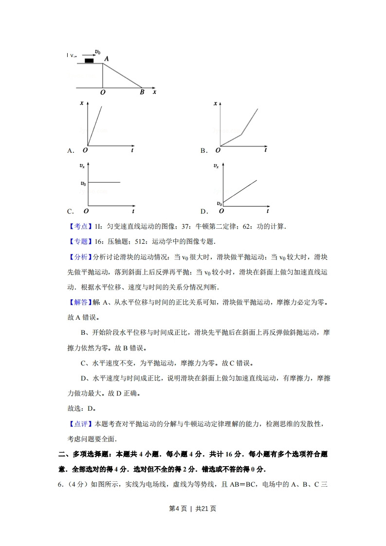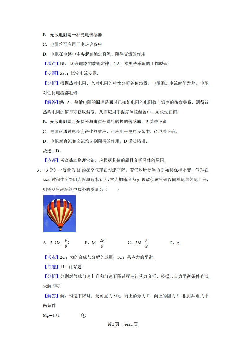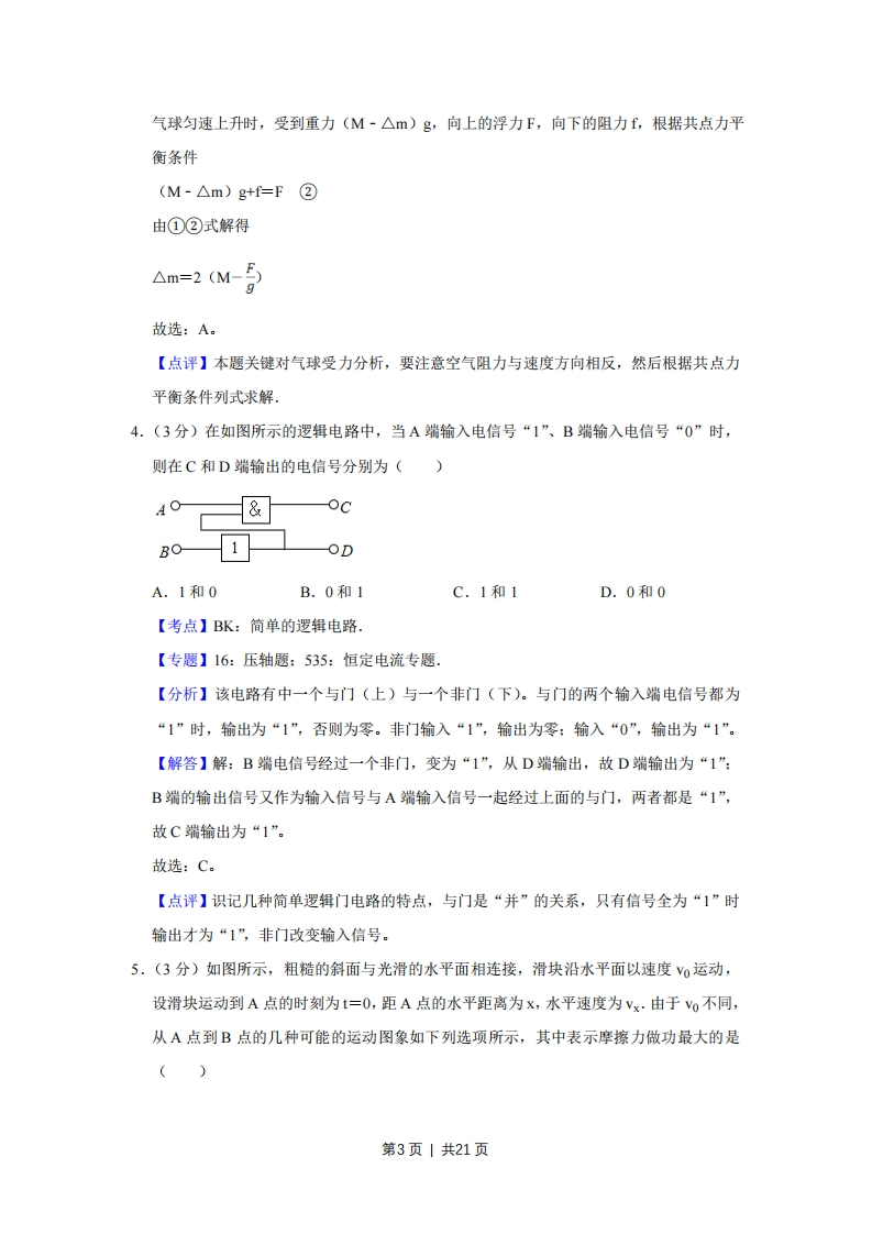 2008年江苏省高考物理试卷解析版套考答案与试题解析一、单项选择题:本题共5小题,每小题3分,共计15分,每小题只有一个选项符合题意.11.(3分)火星的质量和半径分别约为地球的一和一,地球表面的重力加速度为g,则火星102表面的重力加速度约为()A.0.2gB.0.4gC.2.5gD.5g【考点】4F:万有引力定律及其应用【专题】528:万有引力定律的应用专题,【分析】根据星球表面的万有引力等于重力列出等式表示出重力加速度。通过火星的质量和半径与地球的关系找出重力加速度的关系。【解答】解:根据星球表面的万有引力等于重力得:GMmR2=mg解得:9=GMR2火星的质量和半径分别约为地球的二和片,所以火星表面的重力加速度:102g'==0.4g,故B正确,ACD错误:的2故选:B。【点评】求一个物理量之比,我们应该把这个物理量先根据物理规律用己知的物理量表示出来,再进行之比。2.(3分)2007年度诺贝尔物理学奖授子了法国和德国的两位科学家,以表彰他们发现“巨磁电阻效应”.基于巨磁电阻效应开发的用于读取硬盘数据的技术,被认为是纳米技术的第一次真正应用.在下列有关其它电阻应用的说法中.错误的是()A.热敏电阻可应用于温度测控装置中第1页|共21页B.光敏电阻是一种光电传感器C.电阻丝可应用于电热设备中D.电阻在电路中主要起到通过直流、阻碍交流的作用【考点】BB:闭合电路的欧姆定律:GA:常见传感器的工作原理.【专题】535:恒定电流专题【分析】根据热敏电阻、光敏电阻的特性分析各传感器,电阻通过电流时能发热,电阻对任何电流都阻碍【解答】解:A、热敏电阻的原理是通过己知某电阻的电阻值与温度的函数关系,测得该热敏电阻的值即可获取温度,从而应用于温度测控装置中,A说法正确:B、光敏电阻是将光信号与电信号进行转换的传感器,B说法正确:C、电阻丝通过电流会产生热效应,可应用于电热设备中,C说法正确:D、电阻对直流和交流均起到阻碍的作用,D说法错误。故选:D。【点评】考查基本物理常识,应根据具体的题目分析具体的原因3.(3分)一质量为M的探空气球在匀速下降,若气球所受浮力F始终保持不变,气球在运动过程中所受阻力仅与速率有关,重力加速度为g.现欲使该气球以同样速率匀速上升,则需从气球吊篮中减少的质量为()A.2 (M-E)9B.M-2F9C.2M-FD.g【考点】2G:力的合成与分解的运用:3C:共点力的平衡【专题】11:计算题【分析】分别对气球匀速上升和匀速下降过程进行受力分析,根据共点力平衡条件列式求解即可,【解答】解:匀速下降时,受到重力Mg,向上的浮力F,向上的阻力,根据共点力平衡条件Mg=F+f①第2页|共21页气球匀速上升时,受到重力(M-△m)g,向上的浮力F,向下的阻力f,根据共点力平衡条件(M-△m)g+f=F②由①②式解得△m=2M-9故选:A。【点评】本题关键对气球受力分析,要注意空气阻力与速度方向相反,然后根据共点力平衡条件列式求解。4.(3分)在如图所示的逻辑电路中,当A端输入电信号“1”、B端输入电信号“0”时,则在C和D端输出的电信号分别为()oCODA.1和0B.0和1C.1和1D.0和0【考点】BK:简单的逻辑电路.【专题】16:压轴题:535:恒定电流专题【分析】该电路有中一个与门(上)与一个非门(下)。与门的两个输入端电信号都为“1”时,输出为“1”,否则为零。非门输入“1”,输出为零:输入“0”,输出为“1”。【解答】解:B端电信号经过一个非门,变为“1”,从D端输出,故D端输出为“1”:B端的输出信号又作为输入信号与A端输入信号一起经过上面的与门,两者都是“1”,故C端输出为“1”。故选:C。【点评】识记几种简单逻辑门电路的特点,与门是“并”的关系,只有信号全为“1”时输出才为“1”,非门改变输入信号。5.(3分)如图所示,粗糙的斜面与光滑的水平面相连接,滑块沿水平面以速度Vo运动,设滑块运动到A点的时刻为t=0,距A点的水平距离为x,水平速度为Vx·由于Vo不同,从A点到B点的几种可能的运动图象如下列选项所示,其中表示摩擦力做功最大的是()第3页1共21页
