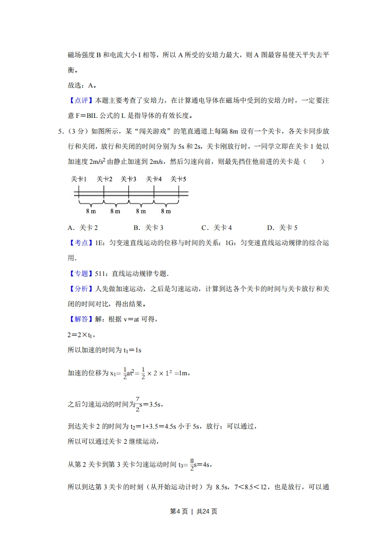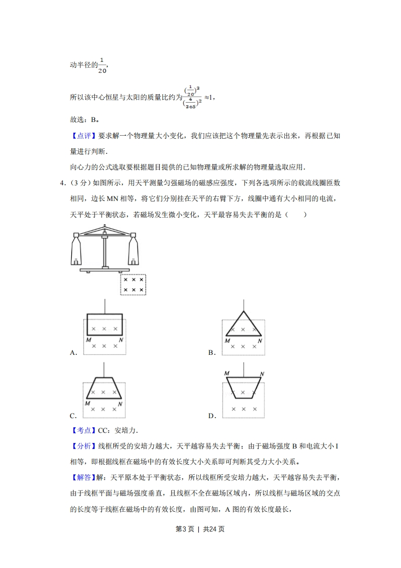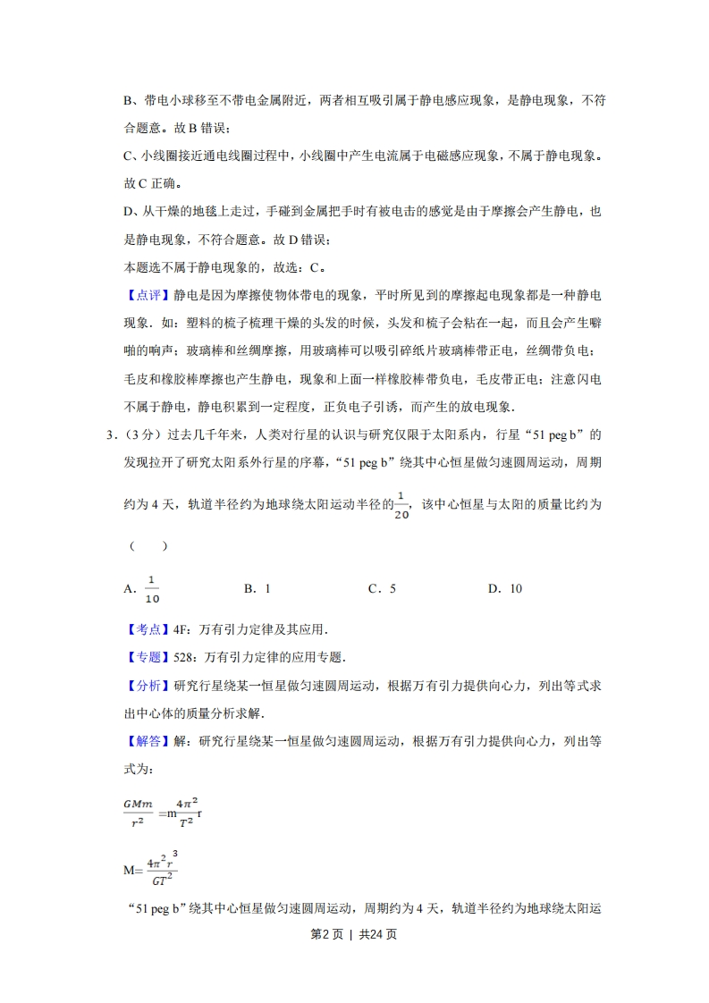 2015年江苏省高考物理试卷解析版◆考答案与试题解折一、单项选择题(本题共5道小题,每小题3分,共计15分,每小题只有一个选项符合题意)1.(3分)一电器中的变压器可视为理想变压器,它将220V交变电流改变为110V,已知变压器原线圈匝数为800,则副线圈的匝数为()A.200B.400C.1600D.3200【考点】E8:变压器的构造和原理.【专题】53A:交流电专题,【分析】根据理想变压器原副线圈匝数比等于电压比即可求解,【解答】解:根据理想变压器原副线圈匝数比等于电压比得:凸=上U2 n2变压器能将220V交变电流改变为110V,原线圈匝数1=800,副线圈匝数2·U2则:2=U1110n1=220×800=400匝故选:B。【点评】本题主要考查了变压器原副线圈匝数比与电压比之间的关系,难度不大,属于基础题。2.(3分)静电现象在自然界中普遍存在,我国早在西汉末年已有对静电现象的记载,《春秋纬·考异邮》中有“玳瑁吸”之说,但下列不属于静电现象的是()A.梳过头发的塑料梳子吸起纸屑B.带电小球移至不带电金属附近,两者相互吸引C.小线圈接近通电线圈过程中,小线圈中产生电流D.从干燥的地毯上走过,手碰到金属把手时有被电击的感觉【考点】AH:静电场中的导体:AL:静电现象的解释【分析】分析各现象的形成原因,然后判断各现象的成因是否与静电现象有关,然后答题.【解答】解:A、梳子与头发摩擦会产生静电,吸起纸屑,是静电现象,不符合题意。故A错误:第1页1共24页B、带电小球移至不带电金属附近,两者相互吸引属于静电感应现象,是静电现象,不符合题意。故B错误:C、小线圈接近通电线圈过程中,小线圈中产生电流属于电磁感应现象,不属于静电现象。故C正确。D、从干燥的地毯上走过,手碰到金属把手时有被电击的感觉是由于摩擦会产生静电,也是静电现象,不符合题意。故D错误:本题选不属于静电现象的,故选:C。【点评】静电是因为摩擦使物体带电的现象,平时所见到的摩擦起电现象都是一种静电现象.如:塑料的梳子梳理干燥的头发的时候,头发和梳子会粘在一起,而且会产生噼啪的响声:玻璃棒和丝绸摩擦,用玻璃棒可以吸引碎纸片玻璃棒带正电,丝绸带负电:毛皮和橡胶棒摩擦也产生静电,现象和上面一样橡胶棒带负电,毛皮带正电:注意闪电不属于静电,静电积累到一定程度,正负电子引诱,而产生的放电现象3.(3分)过去几千年来,人类对行星的认识与研究仅限于太阳系内,行星“51pgb”的发现拉开了研究太阳系外行星的序幕,“51pgb”绕其中心恒星做匀速圆周运动,周期约为4天,轨道半径约为地球绕太阳运动半径的一,该中心恒星与太阳的质量比约为20(1A.B.1C.5D.1010【考点】4F:万有引力定律及其应用,【专题】528:万有引力定律的应用专题.【分析】研究行星绕某一恒星做匀速圆周运动,根据万有引力提供向心力,列出等式求出中心体的质量分析求解.【解答】解:研究行星绕某一恒星做匀速圆周运动,根据万有引力提供向心力,列出等式为:GMm、4n22=mr233M=i“51pgb”绕其中心恒星做匀速圆周运动,周期约为4天,轨道半径约为地球绕太阳运第2页|共24页动半径的0所以该中心恒星与太阳的质量比约为故选:B。【点评】要求解一个物理量大小变化,我们应该把这个物理量先表示出来,再根据己知量进行判断,向心力的公式选取要根据题目提供的己知物理量或所求解的物理量选取应用,4.(3分)如图所示,用天平测量匀强磁场的磁感应强度,下列各选项所示的载流线圈匝数相同,边长MN相等,将它们分别挂在天平的右臂下方,线圈中通有大小相同的电流,天平处于平衡状态,若磁场发生微小变化,天平最容易失去平衡的是()×××C.D【考点】CC:安培力.【分析】线框所受的安培力越大,天平越容易失去平衡:由于磁场强度B和电流大小I相等,即根据线框在磁场中的有效长度大小关系即可判断其受力大小关系。【解答】解:天平原本处于平衡状态,所以线框所受安培力越大,天平越容易失去平衡,由于线框平面与磁场强度垂直,且线框不全在磁场区域内,所以线框与磁场区域的交点的长度等于线框在磁场中的有效长度,由图可知,A图的有效长度最长,第3页1共24页