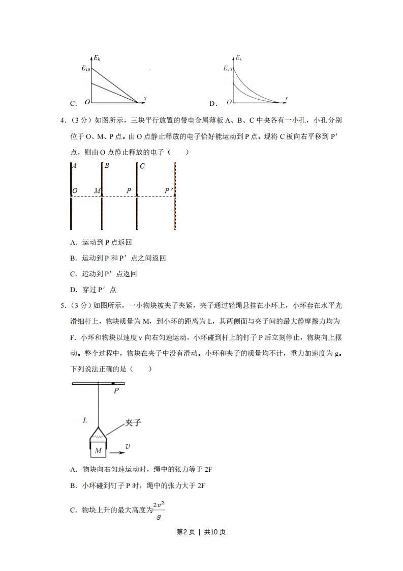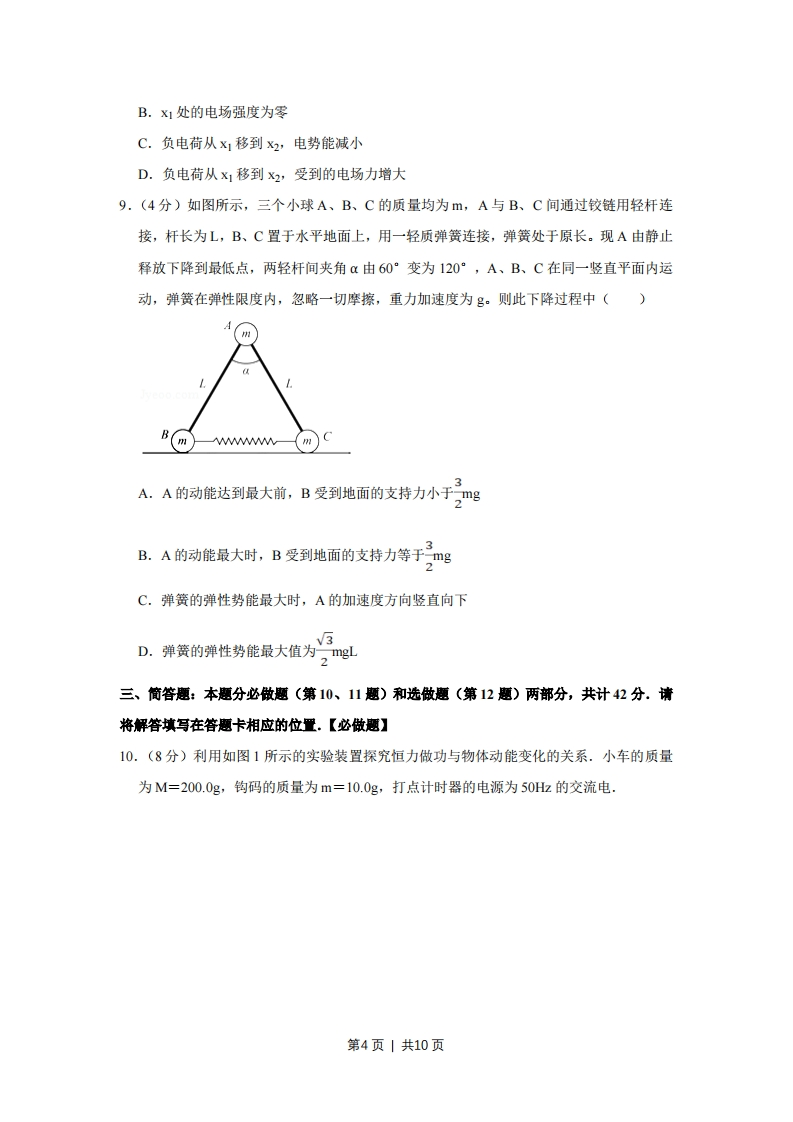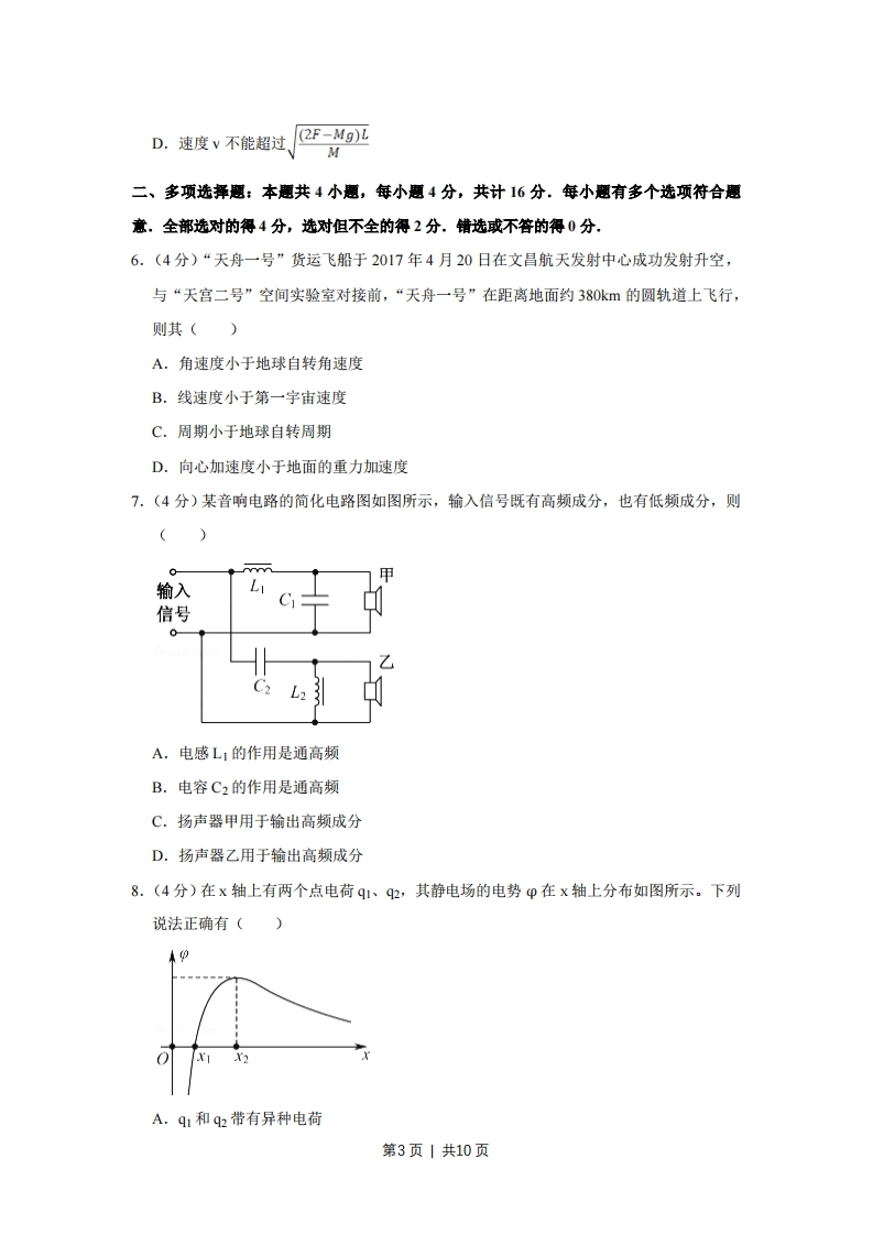 2017年江苏省高考物理试卷一、单项选释题:本题共5小题,每小题3分,共计15分,每小题只有一个选项符合题意1.(3分)如图所示,两个单匝线圈a、b的半径分别为r和2r.圆形匀强磁场B的边缘恰好与a线圈重合,则穿过a、b两线圈的磁通量之比为()A.1:1B.1:2C.1:4D.4:12.(3分)如图所示,A、B两小球从相同高度同时水平抛出,经过时间t在空中相遇,若两球的抛出速度都变为原来的2倍,则两球从抛出到相遇经过的时间为()BAA.tB②C.2n3.(3分)一小物块沿斜面向上滑动,然后滑回到原处。物块初动能为Ek0,与斜面间的动摩擦因数不变,则该过程中,物块的动能E与位移x关系的图线是()B第1页|共10页EExoD.4.(3分)如图所示,三块平行放置的带电金属薄板A、B、C中央各有一小孔,小孔分别位于O、M、P点。由O点静止释放的电子恰好能运动到P点。现将C板向右平移到P'点,则由O点静止释放的电子()ABA.运动到P点返回B.运动到P和P'点之间返回C.运动到P'点返回D.穿过P'点5.(3分)如图所示,一小物块被夹子夹紧,夹子通过轻绳悬挂在小环上,小环套在水平光滑细杆上,物块质量为M,到小环的距离为L,其两侧面与夹子间的最大静摩擦力均为F.小环和物块以速度V向右匀速运动,小环碰到杆上的钉子P后立刻停止,物块向上摆动。整个过程中,物块在夹子中没有滑动。小环和夹子的质量均不计,重力加速度为g。下列说法正确的是()夹子MA,物块向右匀速运动时,绳中的张力等于2FB.小环碰到钉子P时,绳中的张力大于2FC。物块上升的最大高度为2”第2页1共10页D.速度v不能超过(2F-Mg)LM二、多项选择题:本题共4小题,每小题4分,共计16分,每小题有多个选项符合题意.全部选对的得4分,选对但不全的得2分.错选或不答的得0分.6.(4分)“天舟一号”货运飞船于2017年4月20日在文昌航天发射中心成功发射升空,与“天宫二号”空间实验室对接前,“天舟一号”在距离地面约380km的圆轨道上飞行,则其()A.角速度小于地球自转角速度B.线速度小于第一宇宙速度C.周期小于地球自转周期D.向心加速度小于地面的重力加速度7.(4分)某音响电路的简化电路图如图所示,输入信号既有高频成分,也有低频成分,则()0输入信号A.电感L1的作用是通高频B.电容C2的作用是通高频C.扬声器甲用于输出高频成分D.扬声器乙用于输出高频成分8.(4分)在x轴上有两个点电荷q1、q2,其静电场的电势φ在x轴上分布如图所示。下列说法正确有()/x1A.q1和q2带有异种电荷第3页|共10页