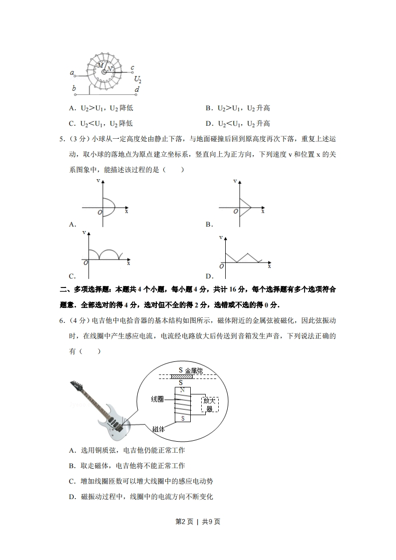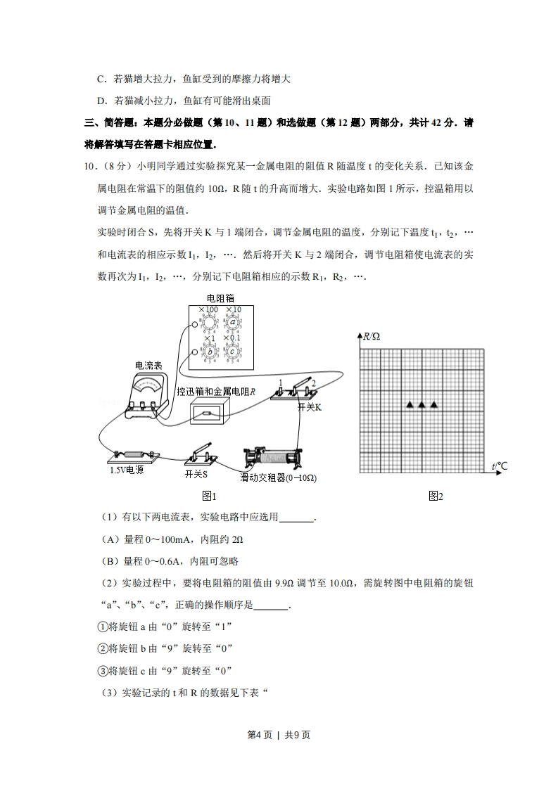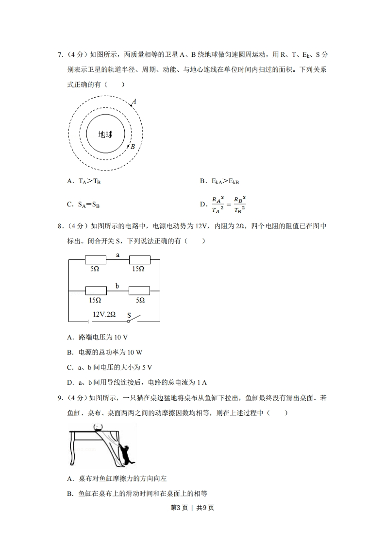 2016年江苏省高考物理试卷一、单项选释题:本题共5小题,每小题3分,共计15分,每小题只有一个选项符合题意.1.(3分)一轻质弹簧原长为8cm,在4N的拉力作用下伸长了2cm,弹簧未超出弹性限度,则该弹簧的劲度系数为()A.40 m/NB.40N/mC.200m/ND.200N/m2.(3分)有A、B两小球,B的质量为A的两倍。现将它们以相同速率沿同一方向抛出,不计空气阻力。图中①为A的运动轨迹,则B的运动轨迹是()②①④ccccci67864A.①B.②c.③D.④3.(3分)一金属容器置于绝缘板上,带电小球用绝缘细线悬挂于容器中,容器内的电场线分布如图所示.容器内表面为等势面,A、B为容器内表面上的两点,下列说法正确的是()A.A点的电场强度比B点的大B.小球表面的电势比容器内表面的低C.B点的电场强度方向与该处内表面垂直D.将检验电荷从A点沿不同路径到B点,电场力所做的功不同4.(3分)一自耦变压器如图所示,环形铁芯上只饶有一个线圈,将其接在、b间作为原线圈。通过滑动触头取该线圈的一部分,接在c、d间作为副线圈。在a、b间输入电压为U1的交变电流时,c、d间的输出电压为U2,在将滑动触头从M点顺时针旋转到N点的过程中()第1页|共9页0巧6dA.U2>U1,U2降低B.U2>U1,U2升高C.U2TBB.EkA>EkBC.SA=SBD.Ra3Rg2A2=8.(4分)如图所示的电路中,电源电动势为12V,内阻为22,四个电阻的阻值己在图中标出。闭合开关S,下列说法正确的有()a5Ω152b1525212V.22A.路端电压为10VB.电源的总功率为10WC.a、b间电压的大小为5VD.a、b间用导线连接后,电路的总电流为1A9.(4分)如图所示,一只猫在桌边猛地将桌布从鱼缸下拉出,鱼缸最终没有滑出桌面。若鱼缸、桌布、桌面两两之间的动摩擦因数均相等,则在上述过程中()A.桌布对鱼缸摩擦力的方向向左B.鱼缸在桌布上的滑动时间和在桌面上的相等第3页丨共9页