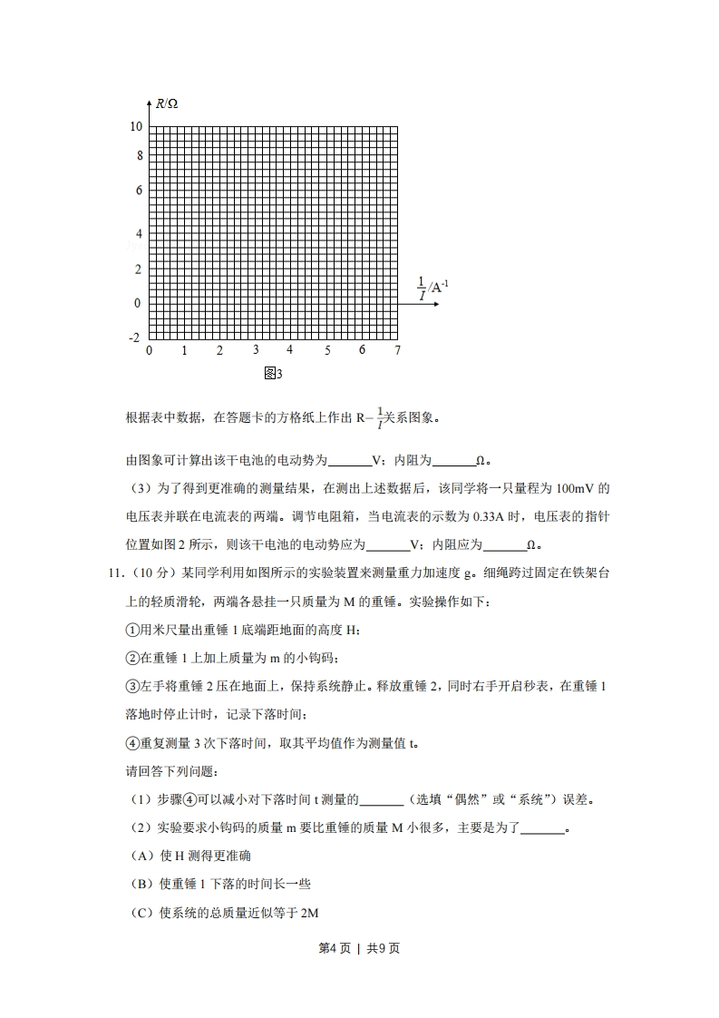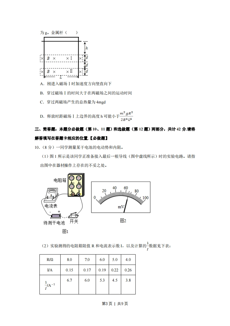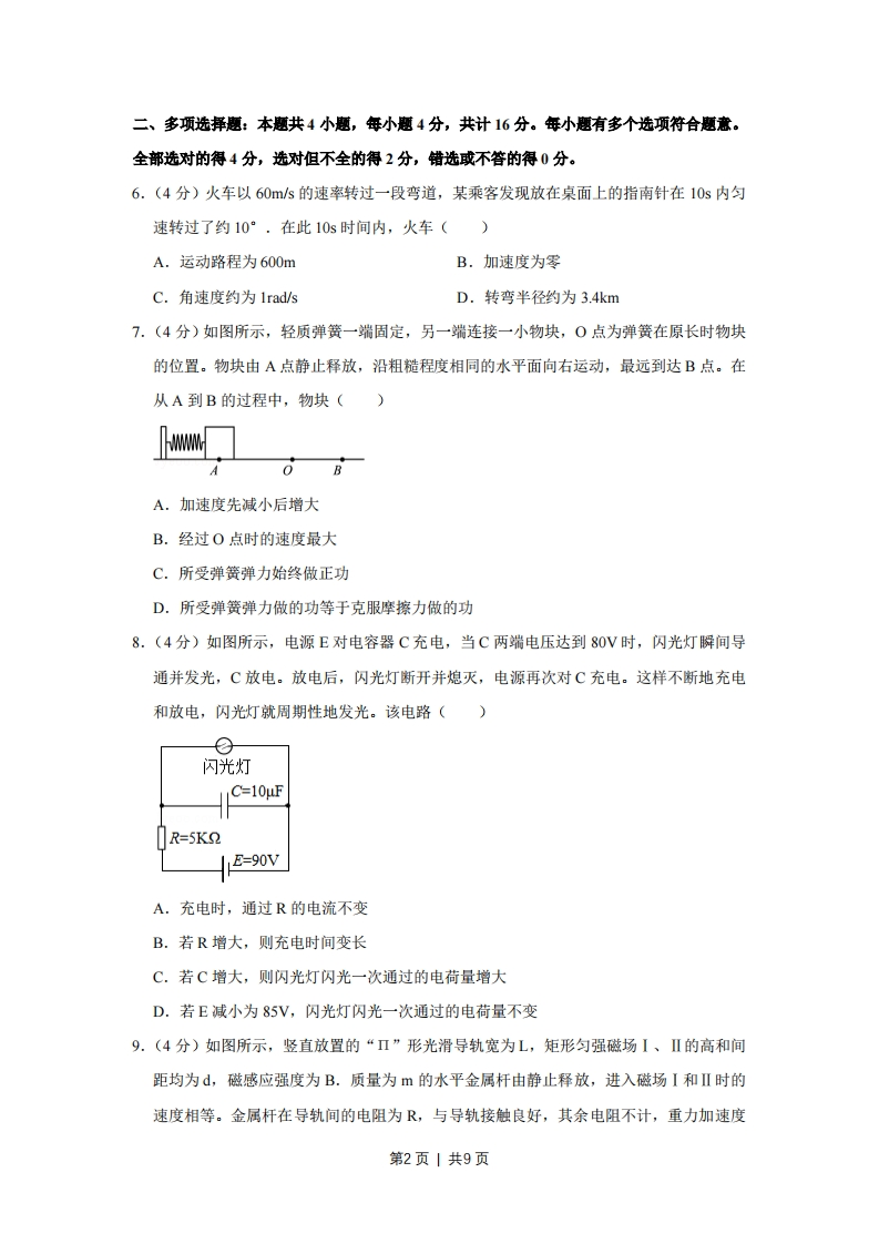 2018年江苏省高考物理试卷一、单项选择题:本题共5小题,每小题3分,共计15分.每小题只有一个选项符合思意1.(3分)我国高分系列卫星的高分辨对地观察能力不断提高。今年5月9日发射的“高分五号”轨道高度约为705km,之前己运行的“高分四号”轨道高度约为36000km,它们都绕地球做圆周运动。与“高分四号”相比,下列物理量中“高分五号”较小的是(A.周期B.角速度C.线速度D.向心加速度2.(3分)采用220kV高压向远方的城市输电。当输送功率一定时,为使输电线上损耗的功率减小为原来的,输电电压应变为()A.55kVB.110kVC.440kVD.880kV3.(3分)某弹射管每次弹出的小球速度相等。在沿光滑竖直轨道自由下落过程中,该弹射管保持水平,先后弹出两只小球。忽略空气阻力,两只小球落到水平地面的()A.时刻相同,地点相同B.时刻相同,地点不同C.时刻不同,地点相同D.时刻不同,地点不同4.(3分)从地面竖直向上抛出一只小球,小球运动一段时间后落回地面。忽略空气阻力,该过程中小球的动能Ek与时间t的关系图象是()B5.(3分)如图所示,水平金属板A、B分别与电源两极相连,带电油滴处于静止状态。现将B板右端向下移动一小段距离,两金属板表面仍均为等势面,则该油滴()U。油滴A.仍然保持静止B.竖直向下运动C.向左下方运动D.向右下方运动第1页丨共9页二、多项选择题:本题共4小题,每小题4分,共计16分。年小题有多个选项符合题意。全部选对的得4分,选对但不全的得2分,错选或不答的得0分。6.(4分)火车以60m/s的速率转过一段弯道,某乘客发现放在桌面上的指南针在10s内匀速转过了约10°.在此10s时间内,火车()A.运动路程为600mB.加速度为零C.角速度约为lrad/sD.转弯半径约为3.4km7.(4分)如图所示,轻质弹簧一端固定,另一端连接一小物块,0点为弹簧在原长时物块的位置。物块由A点静止释放,沿粗糙程度相同的水平面向右运动,最远到达B点。在从A到B的过程中,物块()0BA.加速度先减小后增大B.经过O点时的速度最大C.所受弹簧弹力始终做正功D.所受弹簧弹力做的功等于克服摩擦力做的功8.(4分)如图所示,电源E对电容器C充电,当C两端电压达到80V时,闪光灯瞬间导通并发光,C放电。放电后,闪光灯断开并熄灭,电源再次对C充电。这样不断地充电和放电,闪光灯就周期性地发光。该电路()e闪光灯C10μFR=5K2E-90VA,充电时,通过R的电流不变B.若R增大,则充电时间变长C.若C增大,则闪光灯闪光一次通过的电荷量增大D.若E减小为85V,闪光灯闪光一次通过的电荷量不变9.(4分)如图所示,竖直放置的“Π”形光滑导轨宽为L,矩形匀强磁场I、Ⅱ的高和间距均为d,磁感应强度为B.质量为m的水平金属杆由静止释放,进入磁场I和Ⅱ时的速度相等。金属杆在导轨间的电阻为R,与导轨接触良好,其余电阻不计,重力加速度第2页丨共9页为g。金属杆(B X不dB x2A.刚进入磁场I时加速度方向竖直向下B.穿过磁场I的时间大于在两磁场之间的运动时间C.穿过两磁场产生的总热量为4mgdD.释放时距磁场I上边界的高度h可能小于mgR2B4L4三、简答愿:本题分必做题(第10、11题)和选做题(第12题)两部分,共计42分.请将解答填写在答题卡相应的位置.【必做题】10.(8分)一同学测量某干电池的电动势和内阻.(1)图1所示是该同学正准备接入最后一根导线(图中虚线所示)时的实验电路。请指出图中在器材操作上存在的不妥之处。电阻箱4062080,533里8适∠1→电流表待测干电池开关图2图1(2)实验测得的电阻箱阻值R和电流表示数I,以及计算的数据见下表:R/Q8.07.06.05.04.0VA0.150.170.190.220.266.76.05.34.53.8A第3页丨共9页