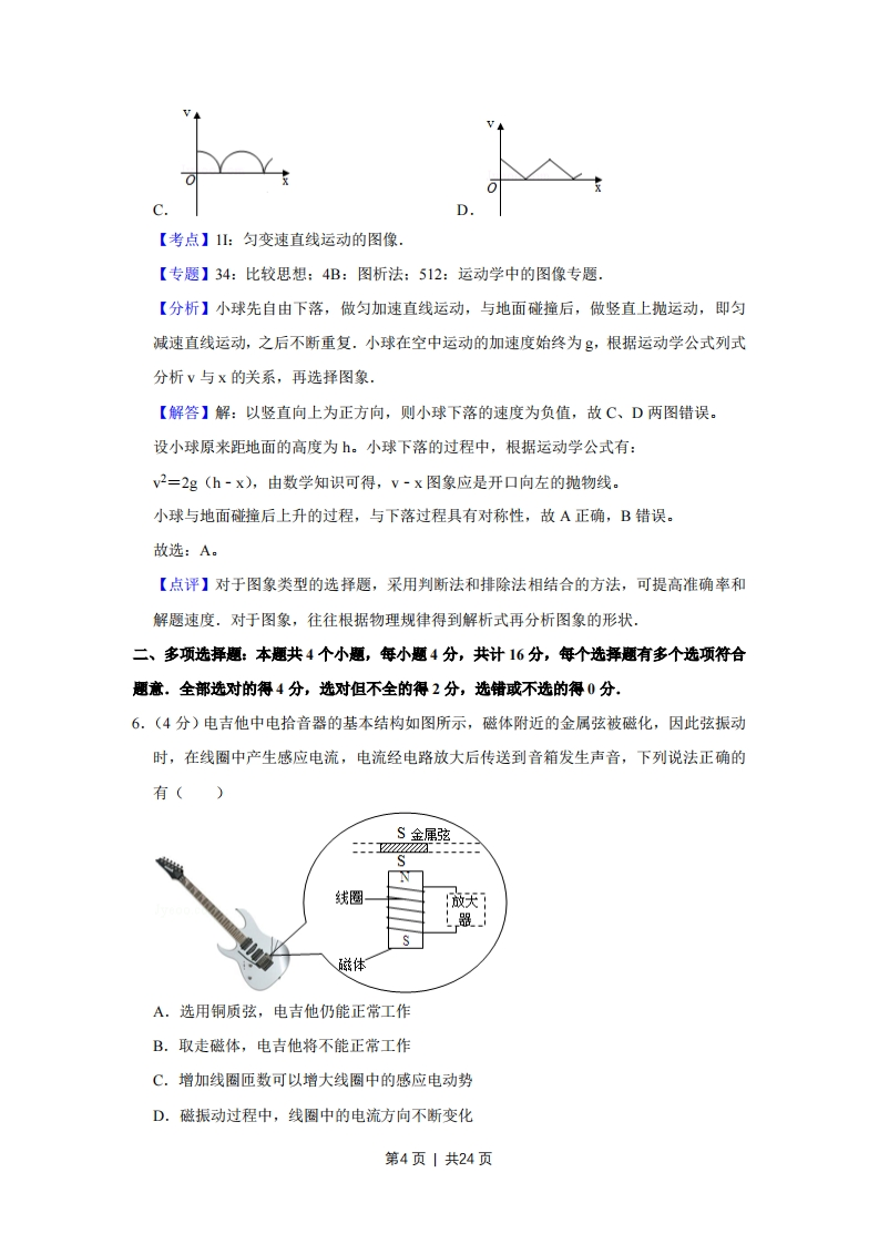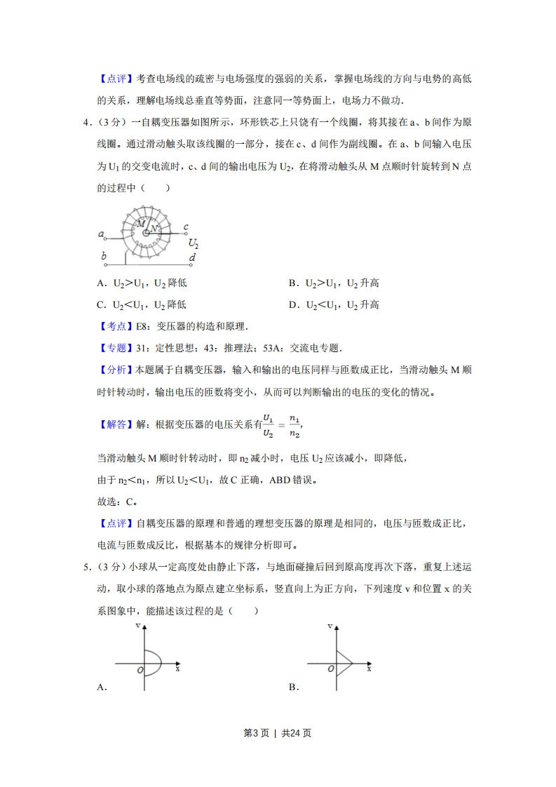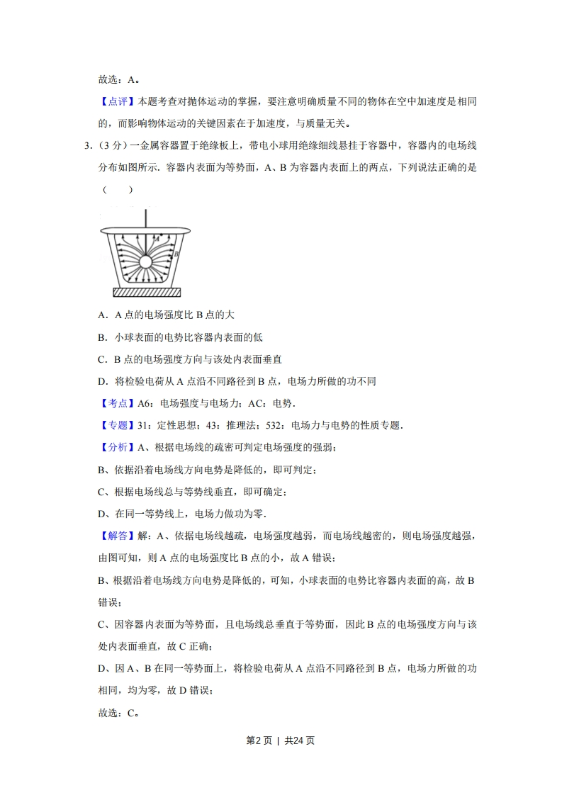 2016年江苏省高考物理试卷解析版◆考答案与试题解析一、单项选择题:本题共5小题,每小题3分,共计15分,每小题只有一个选项符合题意1.(3分)一轻质弹簧原长为8cm,在4N的拉力作用下伸长了2cm,弹簧未超出弹性限度,则该弹簧的劲度系数为()A.40 m/NB.40 N/mC.200m/ND.200N/m【考点】2S:胡克定律.【专题】32:定量思想:4E:模型法:523:弹力的存在及方向的判定专题【分析】由题确定出弹簧的弹力和伸长的长度,根据胡克定律求解弹簧的劲度系数【解答】解:弹簧伸长的长度为:x=2cm=0.02m,弹簧的弹力为F=4N,根据胡克定律F=x得:k是=意220Nm,故ABC错误,D正确.故选:D。【点评】本题考查胡克定律的基本应用,关键要知道公式F=kx中,x是弹簧伸长的长度或缩短的长度,不是弹簧的长度.该题还应特别注意单位2.(3分)有A、B两小球,B的质量为A的两倍。现将它们以相同速率沿同一方向抛出,不计空气阻力。图中①为A的运动轨迹,则B的运动轨迹是()②①A.①B.②C.③D.④【考点】44:抛体运动.【专题】31:定性思想:43:推理法:518:平抛运动专题.【分析】明确抛体运动的轨迹取决于物体的初速度和加速度,明确加速度均为重力加速度,即可分析小球B的运动轨迹。【解答】解:两球初速度大小和方向均相同,同时因抛出后两物体均只受重力,故加速度相同,因此二者具有相同的运动状态,故B的运动轨迹也是①:选项A正确,BCD错误。第1页1共24页故选:A【点评】本题考查对抛体运动的掌握,要注意明确质量不同的物体在空中加速度是相同的,而影响物体运动的关键因素在于加速度,与质量无关。3.(3分)一金属容器置于绝缘板上,带电小球用绝缘细线悬挂于容器中,容器内的电场线分布如图所示.容器内表面为等势面,A、B为容器内表面上的两点,下列说法正确的是()A.A点的电场强度比B点的大B.小球表面的电势比容器内表面的低C.B点的电场强度方向与该处内表面垂直D.将检验电荷从A点沿不同路径到B点,电场力所做的功不同【考点】A6:电场强度与电场力:AC:电势.【专题】31:定性思想:43:推理法:532:电场力与电势的性质专题.【分析】A、根据电场线的疏密可判定电场强度的强弱:B、依据沿着电场线方向电势是降低的,即可判定:C、根据电场线总与等势线垂直,即可确定:D、在同一等势线上,电场力做功为零【解答】解:A、依据电场线越疏,电场强度越弱,而电场线越密的,则电场强度越强,由图可知,则A点的电场强度比B点的小,故A错误:B、根据沿着电场线方向电势是降低的,可知,小球表面的电势比容器内表面的高,故B错误:C、因容器内表面为等势面,且电场线总垂直于等势面,因此B点的电场强度方向与该处内表面垂直,故C正确:D、因A、B在同一等势面上,将检验电荷从A点沿不同路径到B点,电场力所做的功相同,均为零,故D错误:故选:C。第2页1共24页【点评】考查电场线的疏密与电场强度的强弱的关系,掌握电场线的方向与电势的高低的关系,理解电场线总垂直等势面,注意同一等势面上,电场力不做功:4.(3分)一自耦变压器如图所示,环形铁芯上只饶有一个线圈,将其接在、b间作为原线圈。通过滑动触头取该线圈的一部分,接在c、d间作为副线圈。在a、b间输入电压为U1的交变电流时,c、d间的输出电压为U2,在将滑动触头从M点顺时针旋转到N点的过程中(n6dA.U2>U1,U2降低B.U2>U1,U2升高C.U2