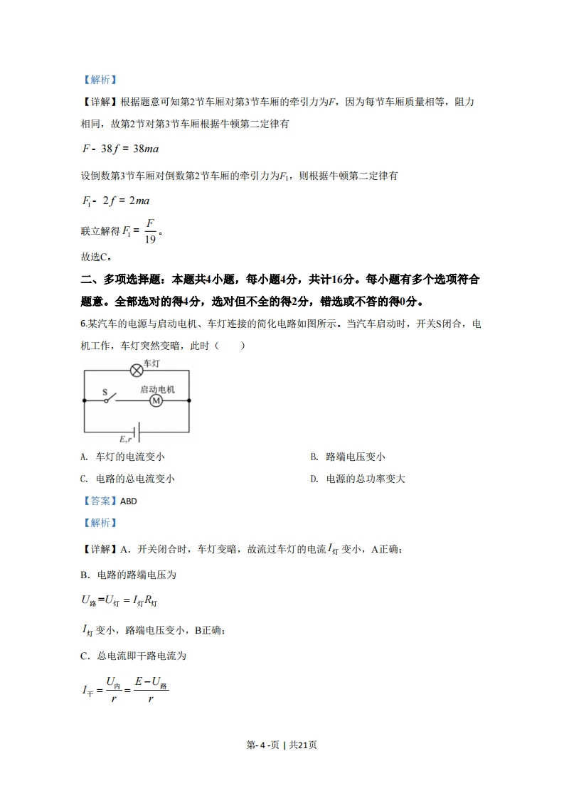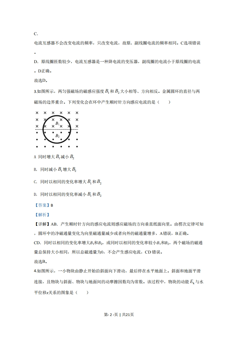 2020年江苏省高考物理试卷一、单项选择题:本题共5小题,每小题3分,共计15分。每小题只有一个选项符合题意。1.质量为1.5×103kg的汽车在水平路面上匀速行驶,速度为20m/s,受到的阻力大小为1.8×103N。此时,汽车发动机输出的实际功率是()A.90WB.30kWC.36kWD.300kW【答案】C【解析】【详解】汽车匀速行驶,则牵引力与阻力平衡F=f=1.8×103N汽车发动机的功率P=Fv=1.8×103×20W=36kW战边C。2.电流互感器是一种测量电路中电流的变压器,工作原理如图所示。其原线圈匝数较少,串联在电路中,副线圈匝数较多,两端接在电流表上。则电流互感器()电路A.是一种降压变压器B.能测量直流电路的电流C.原、副线圈电流的频率不同D.副线圈的电流小于原线圈的电流【答案】D【解析】【详解】A.原线圈匝数较少,电流互感器是一种降电流的变压器,A选项错误。B.电流互感器的工作原理是电磁感应中的互感现象,只可以测量交变电流,B选项错误。第-1-页1共21页C.电流互感器不会改变电流的频率,只改变电流,故原、副线圈电流的频率相同。C选项错误D.原线圈匝数较少,电流互感器是一种降电流的变压器,副线圈的电流小于原线圈的电流。D正确。故选D。3如图所示,两匀强磁场的磁感应强度B,和B2大小相等、方向相反。金属圆环的直径与两磁场的边界重合。下列变化会在环中产生顺时针方向感应电流的是()XXXB2A同时增大B,减小B,B.同时减小B,增大BC.同时以相同的变化率增大B和B,D.同时以相同的变化率减小B,和B2【答案】B【解析】【详解】AB.产生顺时针方向的感应电流则感应磁场的方向垂直纸面向里。由楞次定律可知,圆环中的净磁通量变化为向里磁通量减少或者向外的磁通量增多,A错误,B正确。CD.同时以相同的变化率增大B1和B2,或同时以相同的变化率较小B1和B2,两个磁场的磁通量总保持大小相同,所以总磁通量为0,不会产生感应电流,CD错误。故选B。4如图所示,一小物块由静止开始沿斜面向下滑动,最后停在水平地面上。斜面和地面平滑连接,且物块与斜面、物块与地面间的动摩擦因数均为常数。该过程中,物块的动能E,与水平位移x关系的图象是()第-2-页1共21页【答案】A【解析】【详解】由题意可知设斜面倾角为8,动摩擦因数为μ,则物块在斜面上下滑水平距离x时根据动能定理有mgxtan0-umg cos0.x-=Ecos0整理可得(mg tane-umg)x=Ex即在斜面上运动时动能与x成线性关系:当小物块在水平面运动时有umgx Ex即在水平面运动时动能与x也成线性关系:综上分析可知A正确。故选A。5.中欧班列在欧亚大陆开辟了“生命之路”,为国际抗疫贡献了中国力量。某运送防疫物资的班列由40节质量相等的车厢组成,在车头牵引下,列车沿平直轨道匀加速行驶时,第2节对第3节车厢的牵引力为F。若每节车厢所受摩擦力、空气阻力均相等,则倒数第3节对倒数第2节车厢的牵引力为()19FFFA.FC.201920【答案】C第-3-页1共21页