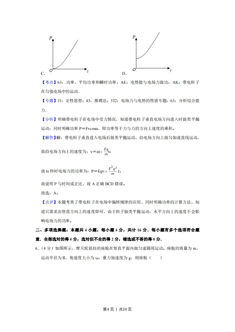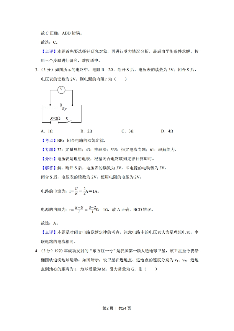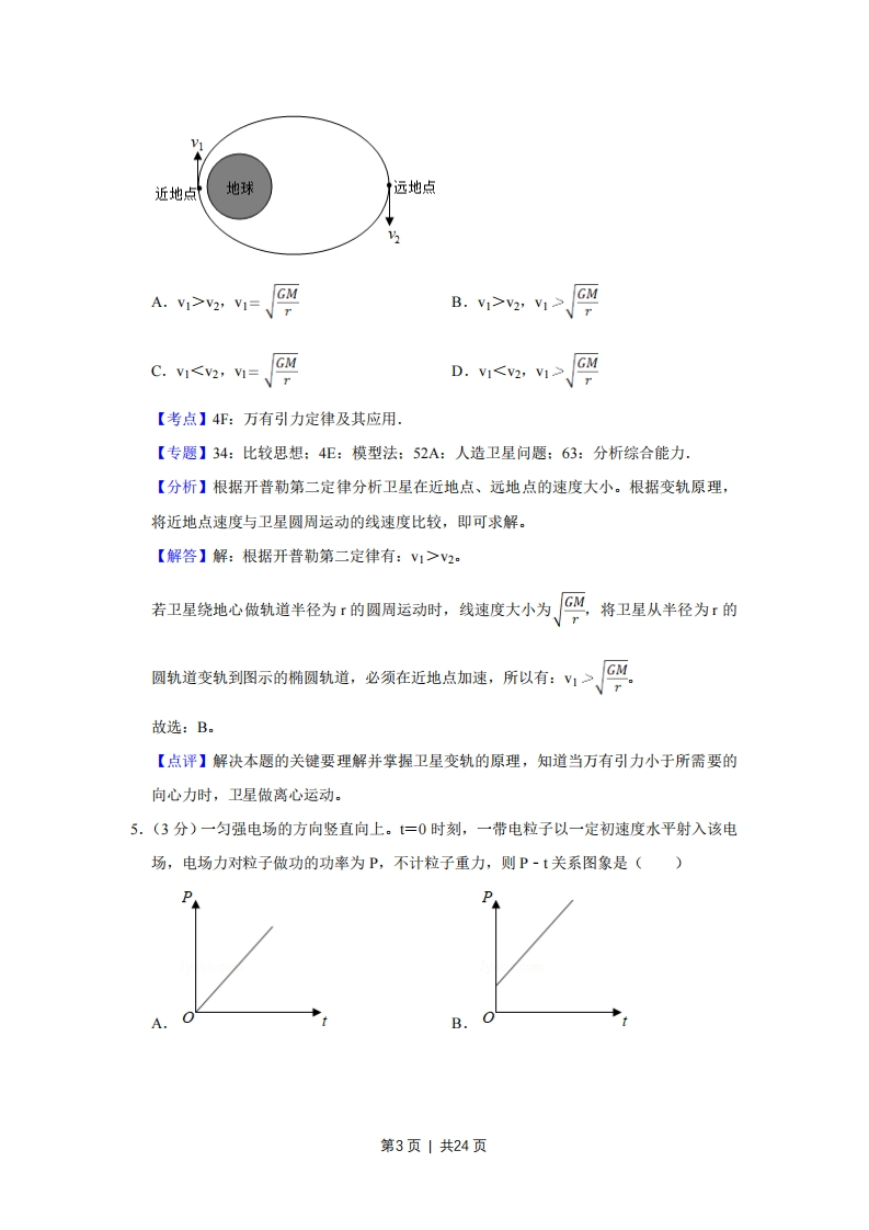 2019年江苏省高考物理试卷解析版◆考答案与试题解析一、单项选择愿本题共5小题,每小题3分,共计15分。每小题只有一个选项符合题意。1.(3分)某理想变压器原、副线圈的匝数之比为1:10,当输入电压增加20V时,输出电压()A.降低2VB.增加2VC.降低200VD.增加200V【考点】E8:变压器的构造和原理,【专题】32:定量思想:43:推理法:53A:交流电专题:62:推理能力.【分析】变压器原副线圈的电压之比等于匝数之比,结合原线圈电压的变化得出副线圈电压的变化。【解答】解:根据2=”得,A=%即20=U2 n2△U2nz△=10解得:△U=200V,即输出电压增加200V.故D正确,ABC错误。故选:D。【点评】解决本题的关键知道原副线圈的电压之比和匝数之比的关系,基础题。2.(3分)如图所示,一只气球在风中处于静止状态,风对气球的作用力水平向右。细绳与竖直方向的夹角为α《,绳的拉力为T,则风对气球作用力的大小为()气球TA.B.-C.TsinaD.Tcosasinacosa【考点】3C:共点力的平衡.【专题】32:定量思想:43:推理法:527:共点力作用下物体平衡专题:61:理解能力、【分析】气球处于静止状态,受力平衡,对气球受力分析,根据受力平衡即可计算。【解答】解:气球在风中处于静止状态,受力平衡合力为零,对气球受力分析得,气球受到重力、浮力、拉力和水平方向上风的作用力,水平方向上受力平衡得:F=Tsi,第1页1共24页故C正确,ABD错误。故选:C。【点评】本题首先要选择好研究对象,再进行受力情况分析,最后由平衡条件求解,按照三个步骤进行研究,难度适中。3.(3分)如图所示的电路中,电阻R=22.断开S后,电压表的读数为3V:闭合S后,电压表的读数为2V,则电源的内阻r为()R=20SA.12B.22C.32D.42【考点】BB:闭合电路的欧姆定律【专题】32:定量思想:43:推理法:535:恒定电流专题:61:理解能力.【分析】电压表是理想电表,根据闭合电路欧姆定律计算即可。【解答】解:断开S后,电压表的读数为3V,即电源的电动势为3V,闭合S后,电压表的读数为2V,使用电阻的电压为2V,电路的电流为:I上景=A=1A,电源的内阻为:=3=1n.故A正确,BCD错误。故选:A【点评】本题是对闭合电路欧姆定律的考查,注意电路中的电压表认为是理想电表,串联电路的电流相同。4.(3分)1970年成功发射的“东方红一号”是我国第一颗人造地球卫星,该卫星至今仍沿椭圆轨道绕地球运动。如图所示,设卫星在近地点、远地点的速度分别为V1、V2,近地点到地心的距离为r,地球质量为M,引力常量为G.则()第2页1共24页近地点地球远地点A.V1>V2,V1=GMB.V1>V2,V1>GMV rC.V1GMV r【考点】4F:万有引力定律及其应用,【专题】34:比较思想:4E:模型法:52A:人造卫星问题:63:分析综合能力【分析】根据开普勒第二定律分析卫星在近地点、远地点的速度大小。根据变轨原理,将近地点速度与卫星圆周运动的线速度比较,即可求解。【解答】解:根据开普勒第二定律有:V1>V2。若卫星绕地心做轨道半径为r的圆周运动时,线速度大小为GMr将卫星从半径为r的圆轨道变轨到图示的椭圆轨道,必须在近地点加速,所以有:V1>GM故选:B。【点评】解决本题的关键要理解并掌握卫星变轨的原理,知道当万有引力小于所需要的向心力时,卫星做离心运动。5.(3分)一匀强电场的方向竖直向上。=0时刻,一带电粒子以一定初速度水平射入该电场,电场力对粒子做功的功率为P,不计粒子重力,则P-t关系图象是()B.O第3页|共24页