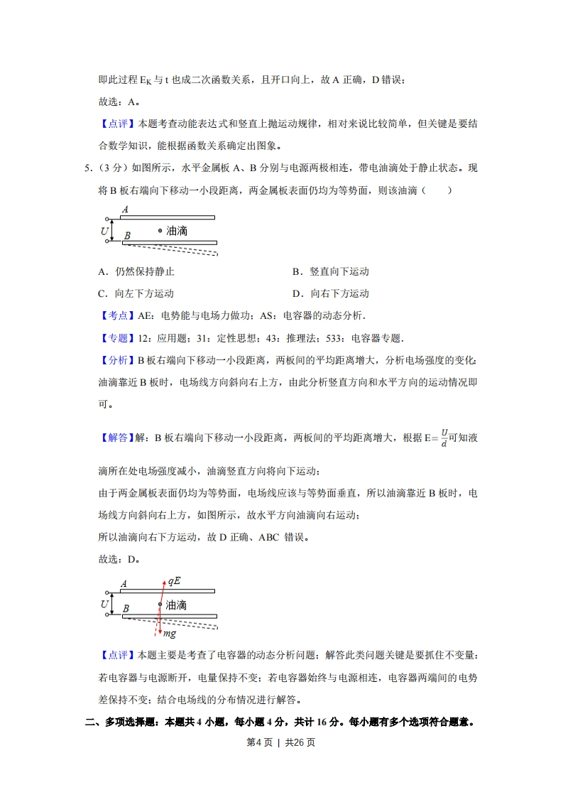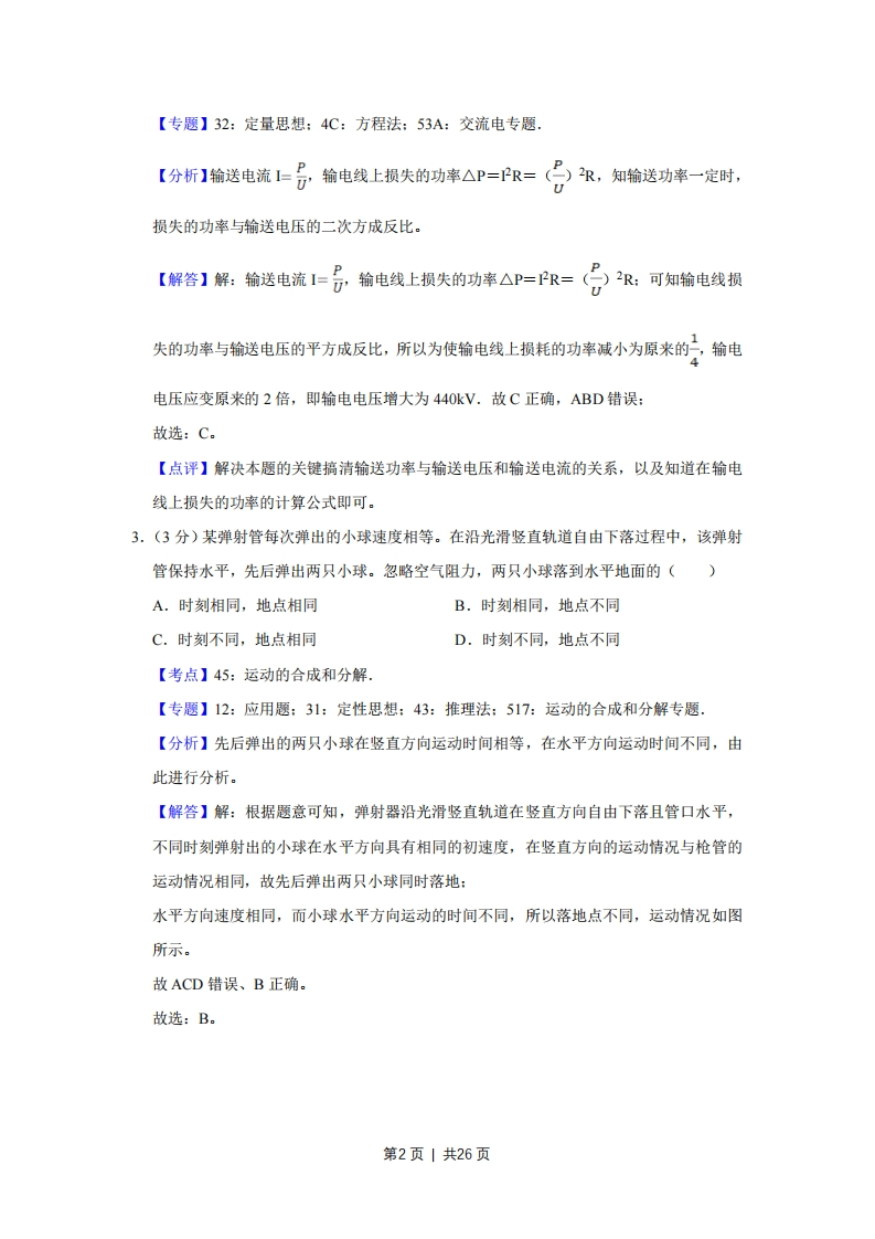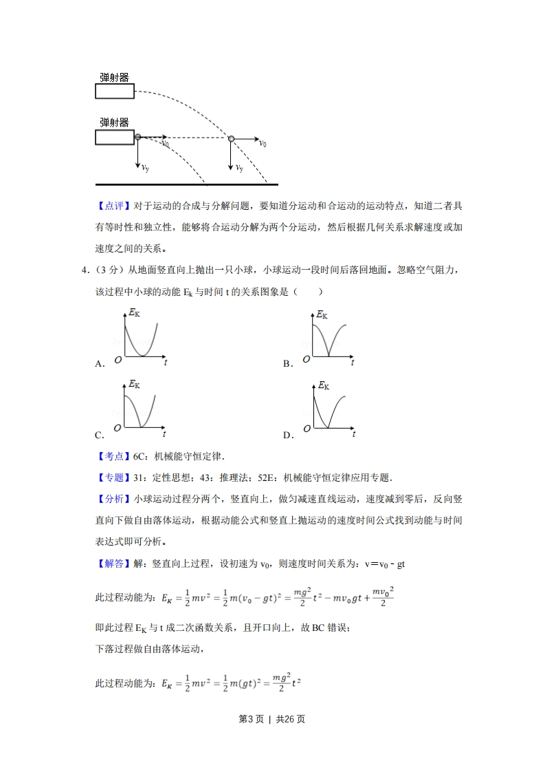 2018年江苏省高考物理试卷解析版套考答案与试题解析一、单项选择题:本题共5小题,每小题3分,共计15分.每小题只有一个选项符合题意1.(3分)我国高分系列卫星的高分辨对地观察能力不断提高。今年5月9日发射的“高分五号”轨道高度约为705km,之前己运行的“高分四号”轨道高度约为36000km,它们都绕地球做圆周运动。与“高分四号”相比,下列物理量中“高分五号”较小的是()A.周期B.角速度C.线速度D.向心加速度【考点】4F:万有引力定律及其应用:4H:人造卫星.【专题】34:比较思想:4E:模型法:52A:人造卫星问题【分析】卫星绕地球匀速做圆周运动,由地球的万有引力提供向心力,由此列式得到卫星的周期、角速度、线速度和向心加速度与轨道半径的关系式,再进行分析。【解答】解:设卫星的质量为m,轨道半径为r,地球的质量为M,卫星绕地球匀速做圆周运动,由地球的万有引力提供向心力,则得:4π2r2-mTar=mo-m=ma3得:T=2Gw=、可知,卫星的轨道半径越小,周期越小,而角速度、线速度和向心加速度越大,“高分五号”的轨道半径比“高分四号”的小,所以“高分五号”较小的是周期,故A正确,BCD错误。故选:A。【点评】解决本题的关键是要掌握万有引力提供向心力这一重要理论,知道卫星的线速度、角速度、周期、加速度与轨道半径的关系。对于周期,也可以根据开普勒第三定律分析。2.(3分)采用220kV高压向远方的城市输电。当输送功率一定时,为使输电线上损耗的功率减小为原来的片输电电压应变为()A.55kVB.110kVC.440kVD.880kV【考点】EA:电能的输送.第1页|共26页【专题】32:定量思想:4C:方程法:53A:交流电专题,【分析】输送电流1上=号,输电线上损失的功率△P=PR=(R,知输送功率一定时,P损失的功率与输送电压的二次方成反比。【解答】解:输送电流I=易,输电线上损失的功率△P=PR=(月R:可知输电线损P失的功率与输送电压的平方成反比,所以为使输电线上损耗的功率减小为原来的,输电电压应变原来的2倍,即输电电压增大为440kV.故C正确,ABD错误:故选:C。【点评】解决本题的关键搞清输送功率与输送电压和输送电流的关系,以及知道在输电线上损失的功率的计算公式即可。3.(3分)某弹射管每次弹出的小球速度相等。在沿光滑竖直轨道自由下落过程中,该弹射管保持水平,先后弹出两只小球。忽略空气阻力,两只小球落到水平地面的()A,时刻相同,地点相同B.时刻相同,地点不同C.时刻不同,地点相同D.时刻不同,地点不同【考点】45:运动的合成和分解.【专题】12:应用题:31:定性思想:43:推理法:517:运动的合成和分解专题.【分析】先后弹出的两只小球在竖直方向运动时间相等,在水平方向运动时间不同,由此进行分析。【解答】解:根据题意可知,弹射器沿光滑竖直轨道在竖直方向自由下落且管口水平,不同时刻弹射出的小球在水平方向具有相同的初速度,在竖直方向的运动情况与枪管的运动情况相同,故先后弹出两只小球同时落地:水平方向速度相同,而小球水平方向运动的时间不同,所以落地点不同,运动情况如图所示。故ACD错误、B正确。故选:B。第2页1共26页弹射器弹射器【点评】对于运动的合成与分解问题,要知道分运动和合运动的运动特点,知道二者具有等时性和独立性,能够将合运动分解为两个分运动,然后根据几何关系求解速度或加速度之间的关系。4.(3分)从地面竖直向上抛出一只小球,小球运动一段时间后落回地面。忽略空气阻力,该过程中小球的动能Ek与时间t的关系图象是(【考点】6C:机械能守恒定律【专题】31:定性思想:43:推理法:52E:机械能守恒定律应用专题,【分析】小球运动过程分两个,竖直向上,做匀减速直线运动,速度减到零后,反向竖直向下做自由落体运动,根据动能公式和竖直上抛运动的速度时间公式找到动能与时间表达式即可分析。【解答】解:竖直向上过程,设初速为vo,则速度时间关系为:v=Vo~gt此过程动能为:5=mp:=m。-9r9=:-m,9t+"受1mv02即此过程EK与t成二次函数关系,且开口向上,故BC错误:下落过程做自由落体运动,此过程动能为:=mv2=m(gt)=m9t2第3页|共26页