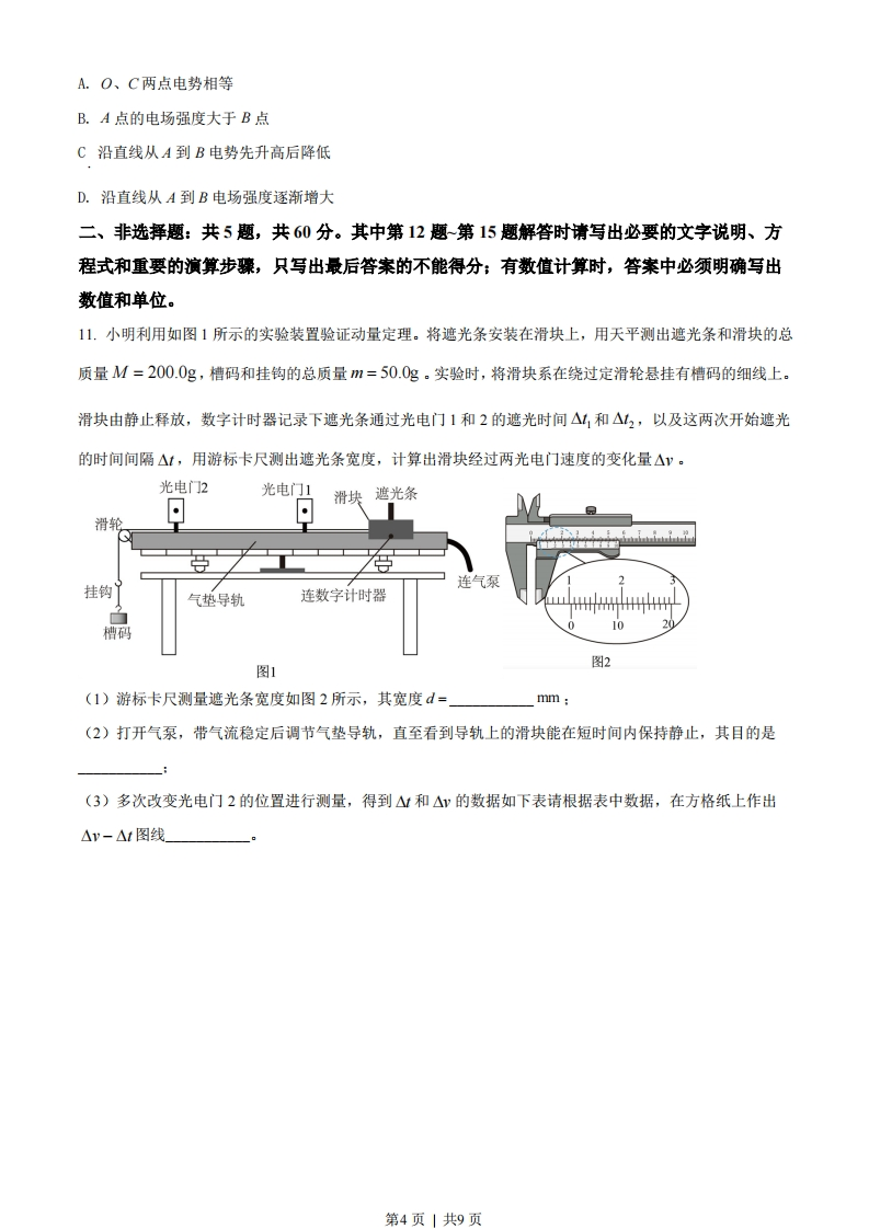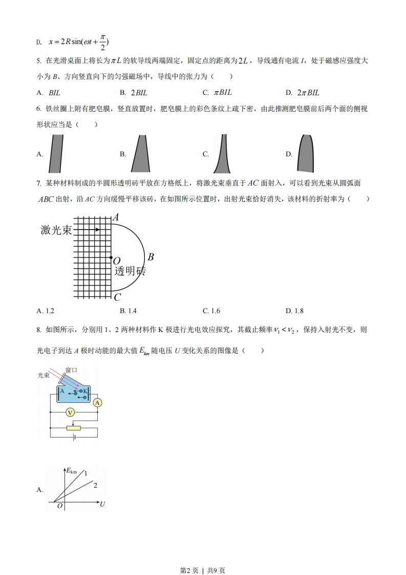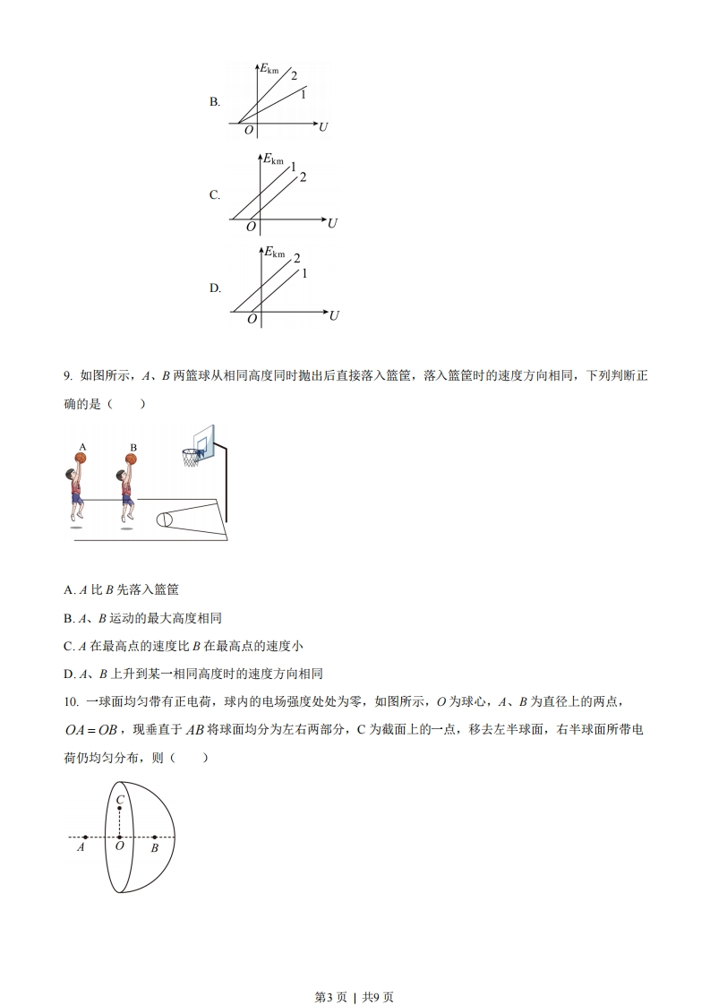江苏省2021年普通高中学业水平选择性考试物理一、单项选释题:共10题,每题4分,共40分,每题只有一个选项最符合题意1.用“中子活化”技术分析某样品的成分,中子轰击样品中的N产生C和另一种粒子X,则X是()A.质子B.a粒子C.B粒子D.正电子2.有研究发现,某神经细胞传递信号时,离子从细胞膜一侧流到另一侧形成跨膜电流,若将该细胞膜视为1×10-8F的电容器,在2ms内细胞膜两侧的电势差从-70mV变为30mV,则该过程中跨膜电流的平均值为()A.1.5×10-7AB.2×10-7AC.3.5×10-7AD.5×10-7A3.我国航天人发扬“两弹一星”精神砥砺前行,从“东方红一号”到“北斗”不断创造奇迹。“北斗”第49颗卫星的发射迈出组网的关键一步。该卫星绕地球做圆周运动,运动周期与地球自转周期相同,轨道平面与地球赤道平面成一定夹角。该卫星()A.运动速度大于第一宇宙速度B.运动速度小于第一宇宙速度C.轨道半径大于“静止”在赤道上空的同步卫星D.轨道半径小于“静止”在赤道上空的同步卫星4.如图所示,半径为R的圆盘边缘有一钉子B,在水平光线下,圆盘的转轴A和钉子B在右侧墙壁上形成影子O和P,以O为原点在竖直方向上建立x坐标系。t=0时从图示位置沿逆时针方向匀速转动圆盘,角速度为@,则P做简谐运动的表达式为()本X光R线A.x=Rsin(ot)2B.x=Rsin(t+2C.x=2Rsin(of-)第1页」共9页D.x-2Rsin(o+5.在光滑桌面上将长为πL的软导线两端固定,固定点的距离为2L,导线通有电流I,处于磁感应强度大小为B、方向竖直向下的匀强磁场中,导线中的张力为()A.BILB.2BILC.πBILD.2πBIL6.铁丝圈上附有肥皂膜,竖直放置时,肥皂膜上的彩色条纹上疏下密,由此推测肥皂膜前后两个面的侧视形状应当是()7.某种材料制成的半圆形透明砖平放在方格纸上,将激光束垂直于AC面射入,可以看到光束从圆弧面ABC出射,沿AC方向缓慢平移该砖,在如图所示位置时,出射光束恰好消失,该材料的折射率为()激光束B透明砖CA.1.2B.1.4C.1.6D.1.88.如图所示,分别用1、2两种材料作K极进行光电效应探究,其截止频率<2,保持入射光不变,则光电子到达A极时动能的最大值E随电压U变化关系的图像是()窗口光束第2页|共9页↑EkmEkm29.如图所示,A、B两篮球从相同高度同时抛出后直接落入篮筐,落入篮筐时的速度方向相同,下列判断正确的是()A.A比B先落入篮筐B.A、B运动的最大高度相同C.A在最高点的速度比B在最高点的速度小D.A、B上升到某一相同高度时的速度方向相同10.一球面均匀带有正电荷,球内的电场强度处处为零,如图所示,O为球心,A、B为直径上的两点,OA=OB,现垂直于AB将球面均分为左右两部分,C为截面上的一点,移去左半球面,右半球面所带电荷仍均匀分布,则()0B第3页|共9页