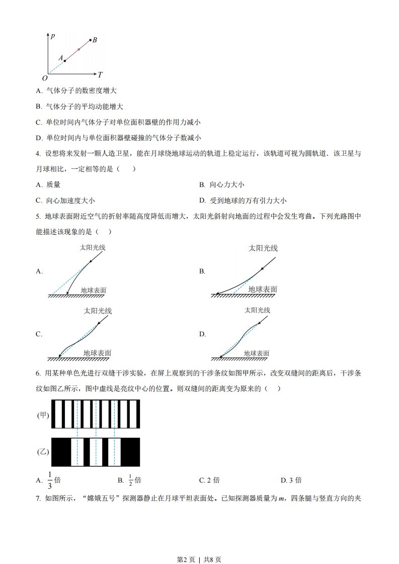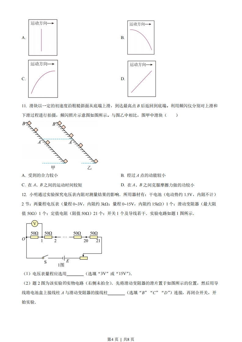 绝密★启用前江苏省2023年普通高中学业水平选择性考试物理注意事项考生在答题前请认真阅读本注意事项及各题答题要求1.本试卷共6页,满分为100分,考试时间为75分钟。考试结束后,请将本试卷和答题卡一并交回。2.答题前,请务必将自已的姓名、准考证号用0.5毫米黑色墨水的签字笔填写在试卷及答题卡的规定位置。3.请认真核对监考员在答题卡上所粘贴的条形码上的姓名、准考证号与本人是否相符。4.作答选择题,必须用2B铅笔将答题卡上对应选项的方框涂满、涂黑;如需改动,请用橡皮擦干净后,再选涂其他答案。作答非选择题,必须用0.5毫米黑色墨水的签字笔在答题卡上的指定位置作答,在其他位置作答一律无效。5.如需作图,必须用2B铅笔绘、写清楚,线条、符号等须加黑、加粗。一、单项选择题:共11题,每题4分,共44分.每题只有一个选项最符合题意.1.电梯上升过程中,某同学用智能手机记录了电梯速度随时间变化的关系,如图所示。电梯加速上升的时段是(1.000.500.000.0020.040.060.0时间(s)A.从20.0s到30.0sB.从30.0s到40.0sC.从40.0s到50.0sD.从50.0s到60.0s2.如图所示,匀强磁场的磁感应强度为B.L形导线通以恒定电流I,放置在磁场中.己知b边长为21,与磁场方向垂直,bc边长为1,与磁场方向平行.该导线受到的安培力为()BbA.0B.BIlC.2BIID.√5B03.如图所示,密闭容器内一定质量的理想气体由状态A变化到状态B。该过程中()第1页」共8页DBA.气体分子的数密度增大B.气体分子的平均动能增大C.单位时间内气体分子对单位面积器壁的作用力减小D.单位时间内与单位面积器壁碰撞的气体分子数减小4.设想将来发射一颗人造卫星,能在月球绕地球运动的轨道上稳定运行,该轨道可视为圆轨道.该卫星与月球相比,一定相等的是()A.质量B.向心力大小C.向心加速度大小D.受到地球的万有引力大小5.地球表面附近空气的折射率随高度降低而增大,太阳光斜射向地面的过程中会发生弯曲。下列光路图中能描述该现象的是()太阳光线太阳光线AB地球表面地球表面777ni7n7n77777aacuuunodd太阳光线太阳光线地球表面地球表面7777777777777777777n7777777777777776.用某种单色光进行双缝干涉实验,在屏上观察到的干涉条纹如图甲所示,改变双缝间的距离后,干涉条纹如图乙所示,图中虚线是亮纹中心的位置。则双缝间的距离变为原来的()(甲)(乙)3倍A.B.2倍C.2倍D.3倍7.如图所示,“嫦娥五号”探测器静止在月球平坦表面处。己知探测器质量为m,四条腿与竖直方向的夹第2页|共8页角均为日,月球表面的重力加速度为地球表面重力加速度g的二。每条腿对月球表面压力的大小为()AmgB.mgC.ingD.mg44cos06cos0248.如图所示,圆形区域内有垂直纸面向里的匀强磁场,OC导体棒的O端位于圆心,棒的中点A位于磁场区域的边缘。现使导体棒绕O点在纸面内逆时针转动。O、A、C点电势分别为po、P4、C,则()XA.9o>ocB.oc>AC.o=AD.90-0A=A-9C9.在“探究气体等温变化的规律”的实验中,实验装置如图所示。利用注射器选取一段空气柱为研究对象。下列改变空气柱体积的操作正确的是()S52压力表柱塞空气柱橡胶塞A.把柱塞快速地向下压B.把柱塞缓慢地向上拉C.在橡胶套处接另一注射器,快速推动该注射器柱塞D.在橡胶套处接另一注射器,缓慢推动该注射器柱塞10.达·芬奇的手稿中描述了这样一个实验:一个罐子在空中沿水平直线向右做匀加速运动,沿途连续漏出沙子。若不计空气阻力,则下列图中能反映空中沙子排列的几何图形是()第3页1共8页