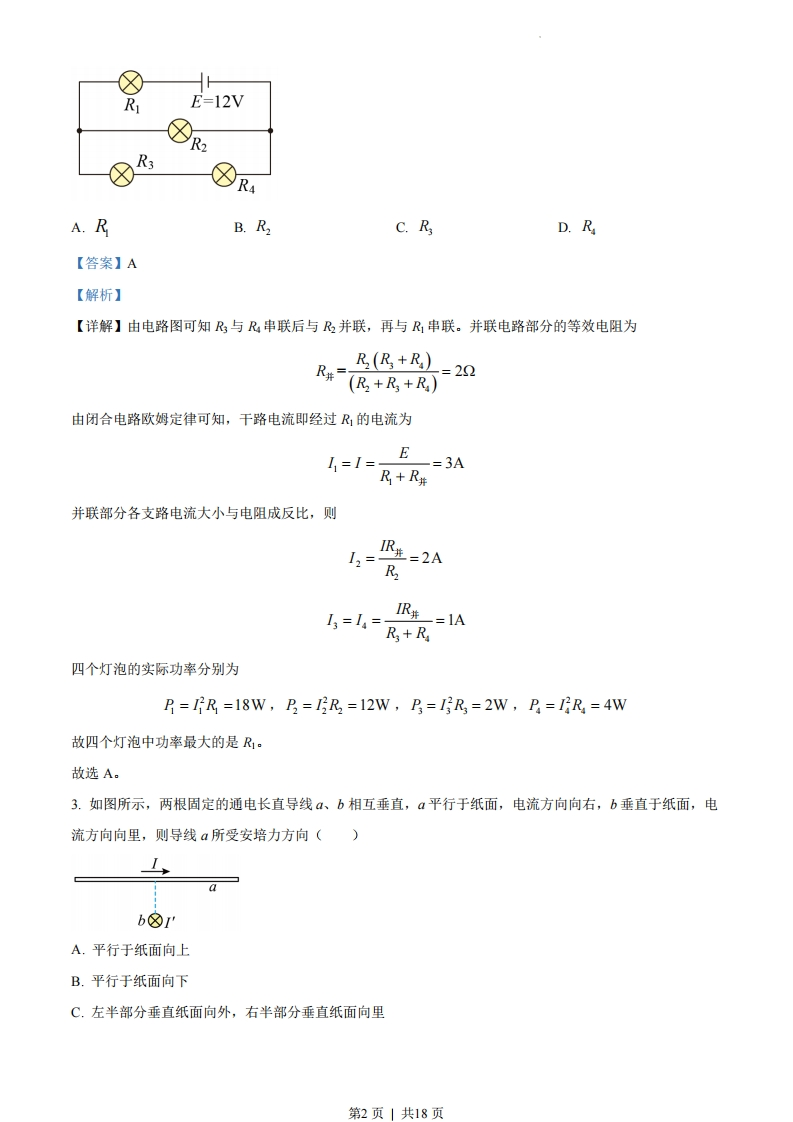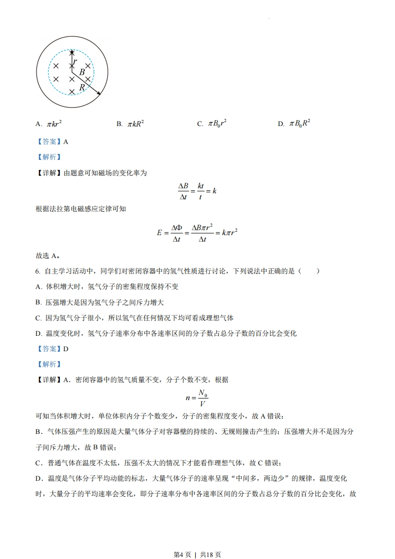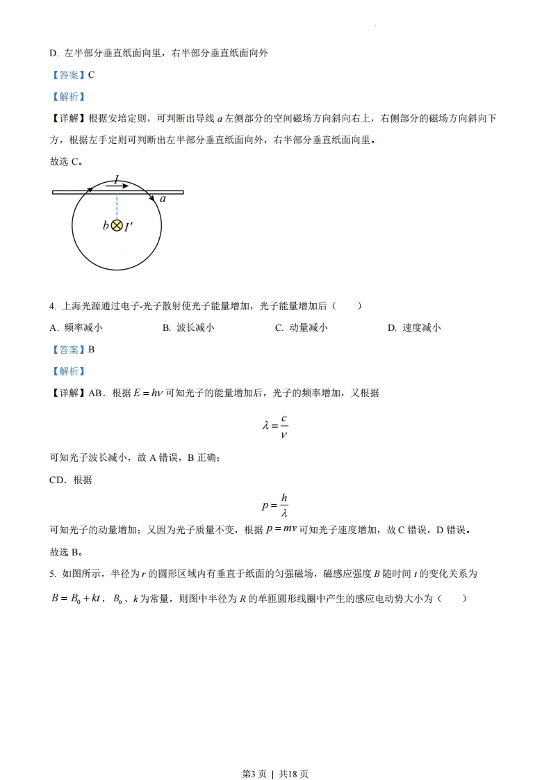 江苏省2022年普通高中学业水平选择性考试物理注意事项:考生在答题前请认真阅读本注意事项及各题答题要求1.本试卷共6页,满分为100分,考试时间为75分钟。考试结束后,请将本试卷和答题卡一并交回。2.答题前,请务必将自己的姓名,准考证号用0.5毫米黑色墨水的签字笔填写在试卷及答题卡的规定位置。3。请认真核对监考员在答题卡上所粘贴的条形码上的姓名、准考证号与本人是否相符。4.作答选择题,必须用2B铅笔将答题卡上对应选项的方框涂满、涂黑;如需改动,请用橡皮擦干净后,再选涂其他答案。作答非选择题,必须用0.5毫米黑色墨水的签字笔在答题卡上的指定位置作答,在其他位置作答一律无效。5.如需作图,必须用2B铅笔绘、写清楚,线条、符号等须加黑、加粗。一、单项选释题:共10题,每题4分,共40分,每题只有一个选项最符合题意。1.高铁车厢里的水平桌面上放置一本书,书与桌面间的动摩擦因数为0.4,最大静摩擦力等于滑动摩擦力,取重力加速度8=10m/s°。若书不滑动,则高铁的最大加速度不超过()A.2.0m/s2B.4.0m/s2c.6.0m/s2D.8.0m/s2【答案】B【解析】【详解】书放在水平桌面上,若书相对于桌面不滑动,则最大静摩擦力提供加速度fo=umg ma解得am =ug =4m/s2书相对高铁静止,故若书不动,高铁的最大加速度4m/s2。故选B。2.如图所示,电路中灯泡均正常发光,阻值分别为R=22,R2=32,R3=22,R=42,电源电动势E=12V,内阻不计,四个灯泡中消耗功率最大的是()第1页」共18页RE-12VRaA.RB.R2C.R3D.R【答案】A【解析】【详解】由电路图可知R与R串联后与R2并联,再与R串联。并联电路部分的等效电阻为R#=R(R+R)=2Q(R+Rs+R)由闭合电路欧姆定律可知,干路电流即经过R的电流为EI1=I==3AR+R并联部分各支路电流大小与电阻成反比,则R先=2A12=RR#一=1A1,=12R+R四个灯泡的实际功率分别为P=IR =18W,P=IR=12W,P=12R=2W,P=IR=4W故四个灯泡中功率最大的是R1。故选A。3.如图所示,两根固定的通电长直导线a、b相互垂直,α平行于纸面,电流方向向右,b垂直于纸面,电流方向向里,则导线a所受安培力方向()ab☒'A,平行于纸面向上B.平行于纸面向下C.左半部分垂直纸面向外,右半部分垂直纸面向里第2页」共18页D.左半部分垂直纸面向里,右半部分垂直纸面向外【答案】C【解析】【详解】根据安培定则,可判断出导线α左侧部分的空间磁场方向斜向右上,右侧部分的磁场方向斜向下方,根据左手定则可判断出左半部分垂直纸面向外,右半部分垂直纸面向里。故选C。b☒'4.上海光源通过电子光子散射使光子能量增加,光子能量增加后()A.频率减小B.波长减小C.动量减小D.速度减小【答案】B【解析】【详解】AB.根据E=v可知光子的能量增加后,光子的频率增加,又根据λ=二可知光子波长减小,故A错误,B正确:CD.根据p=身可知光子的动量增加:又因为光子质量不变,根据P=v可知光子速度增加,故C错误,D错误。故选B。5.如图所示,半径为”的圆形区域内有垂直于纸面的匀强磁场,磁感应强度B随时间1的变化关系为B=B。+kt,B。、k为常量,则图中半径为R的单匝圆形线圈中产生的感应电动势大小为()第3页」共18页