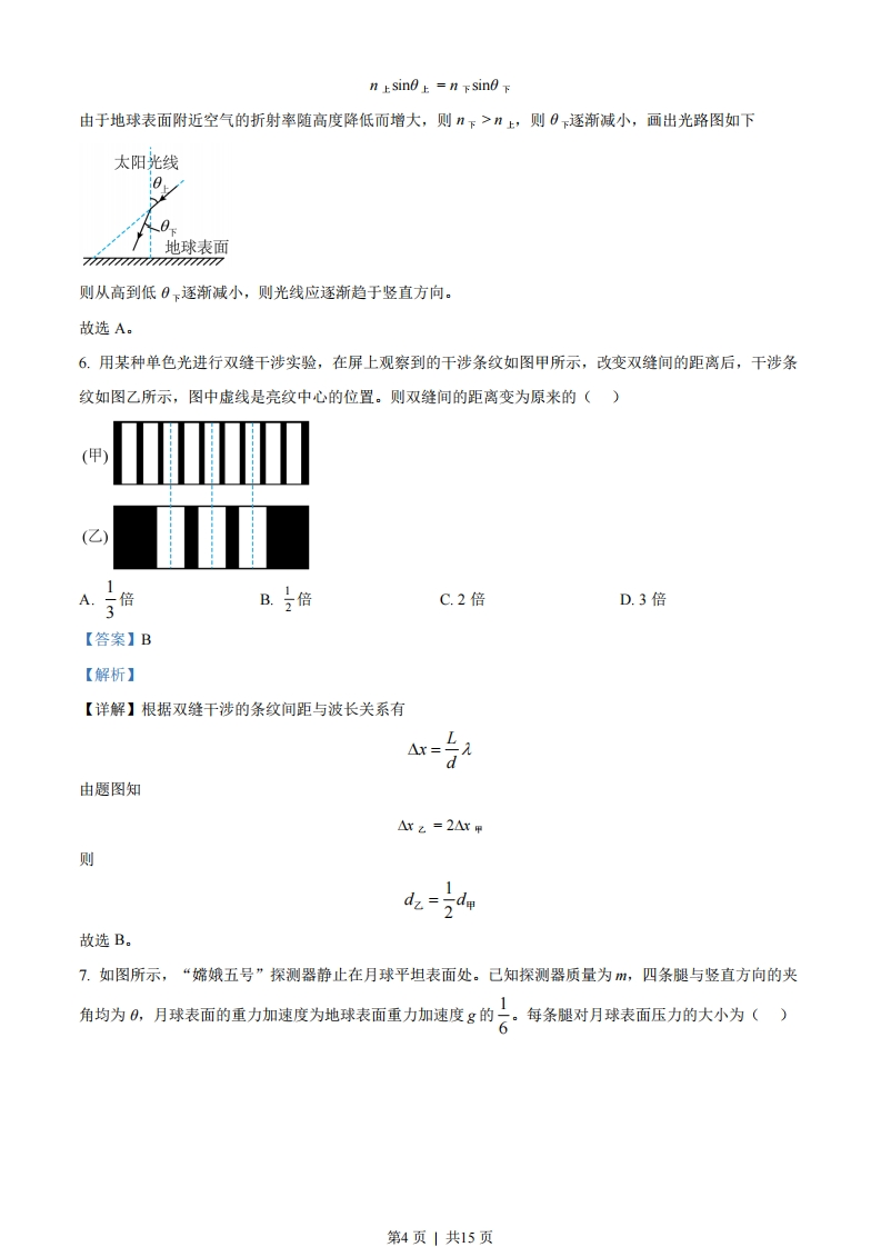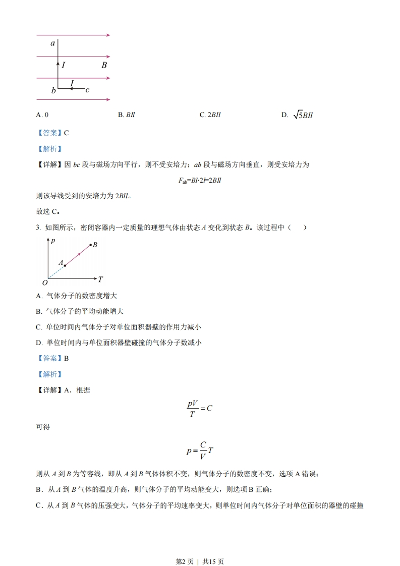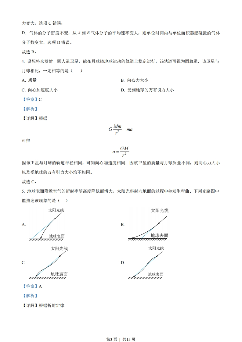绝密★启用前江苏省2023年普通高中学业水平选择性考试物理注意事项考生在答题前请认真阅读本注意事项及各题答题要求1.本试卷共6页,满分为100分,考试时间为75分钟。考试结束后,请将本试卷和答题卡一并交回。2,答题前,请务必将自已的姓名、准考证号用0.5毫米黑色墨水的签字笔填写在试卷及答题卡的规定位置。3.请认真核对监考员在答题卡上所粘贴的条形码上的姓名、准考证号与本人是否相符。4.作答选择题,必须用2B铅笔将答题卡上对应选项的方框涂满、涂黑;如需改动,请用橡皮擦干净后,再选涂其他答案。作答非选择题,必须用0.5毫米黑色墨水的签字笔在答题卡上的指定位置作答,在其他位置作答一律无效。5.如需作图,必须用2B铅笔绘、写清楚,线条、符号等须加黑、加粗。一、单项选择题:共11题,每题4分,共44分.每题只有一个选项最符合题意.1.电梯上升过程中,某同学用智能手机记录了电梯速度随时间变化的关系,如图所示。电梯加速上升的时段是(1.000.500.000.0020.040.060.0时间(s)A.从20.0s到30.0sB.从30.0s到40.0sC.从40.0s到50.0sD.从50.0s到60.0s【答案】A【解析】【详解】因电梯上升,由速度图像可知,电梯加速上升的时间段为20.0s到30.0s。故选A。2.如图所示,匀强磁场的磁感应强度为B.L形导线通以恒定电流I,放置在磁场中.已知b边长为21,与磁场方向垂直,bc边长为1,与磁场方向平行.该导线受到的安培力为()第1页|共15页BbA.0B.BIlC.2BIID.√5Bl【答案】C【解析】【详解】因bc段与磁场方向平行,则不受安培力:ab段与磁场方向垂直,则受安培力为Fab=BI2E2BIl则该导线受到的安培力为2Bl。故选C。3.如图所示,密闭容器内一定质量的理想气体由状态A变化到状态B。该过程中()↑pBTA.气体分子的数密度增大B.气体分子的平均动能增大C.单位时间内气体分子对单位面积器壁的作用力减小D.单位时间内与单位面积器壁碰撞的气体分子数减小【答案】B【解析】【详解】A.根据可得p=CT则从A到B为等容线,即从A到B气体体积不变,则气体分子的数密度不变,选项A错误:B.从A到B气体的温度升高,则气体分子的平均动能变大,则选项B正确:C,从A到B气体的压强变大,气体分子的平均速率变大,则单位时间内气体分子对单位面积的器壁的碰撞第2页|共15页力变大,选项C错误:D,气体的分子密度不变,从A到B气体分子的平均速率变大,则单位时间内与单位面积器壁碰撞的气体分子数变大,选项D错误。故选B。4.设想将来发射一颗人造卫星,能在月球绕地球运动的轨道上稳定运行,该轨道可视为圆轨道.该卫星与月球相比,一定相等的是()A.质量B.向心力大小C.向心加速度大小D.受到地球的万有引力大小【答案】C【解析】【详解】根据GM21=ma可得GMa=2因该卫星与月球的轨道半径相同,可知向心加速度相同:因该卫星的质量与月球质量不同,则向心力大小以及受地球的万有引力大小均不相同。故选C。5.地球表面附近空气的折射率随高度降低而增大,太阳光斜射向地面的过程中会发生弯曲。下列光路图中能描述该现象的是()太阳光线太阳光线B地球表面地球表面77n77777n77777nn77777777777777777777太阳光线太阳光线C地球表面地球表面7777hn7777n777777777777n7777777777777777【答案】A【解析】【详解】根据折射定律第3页|共15页