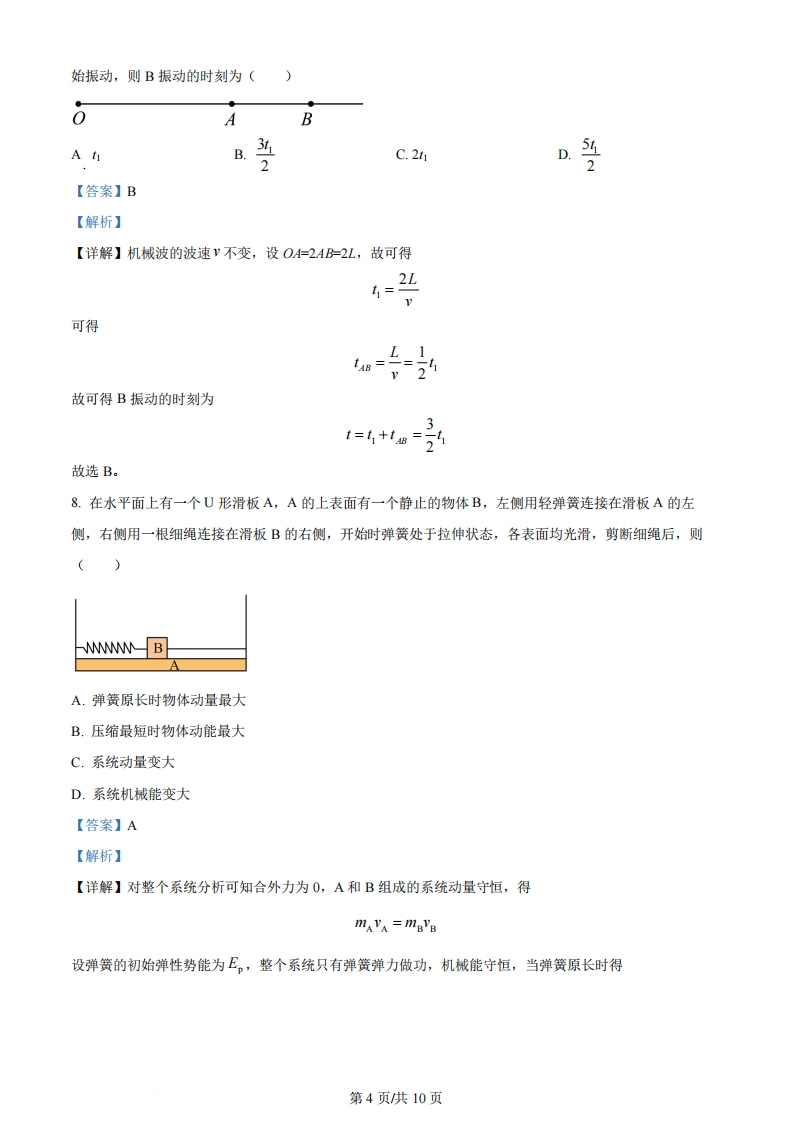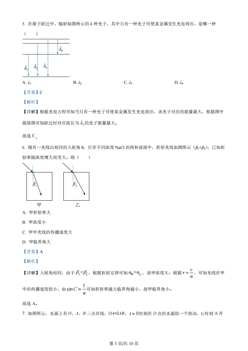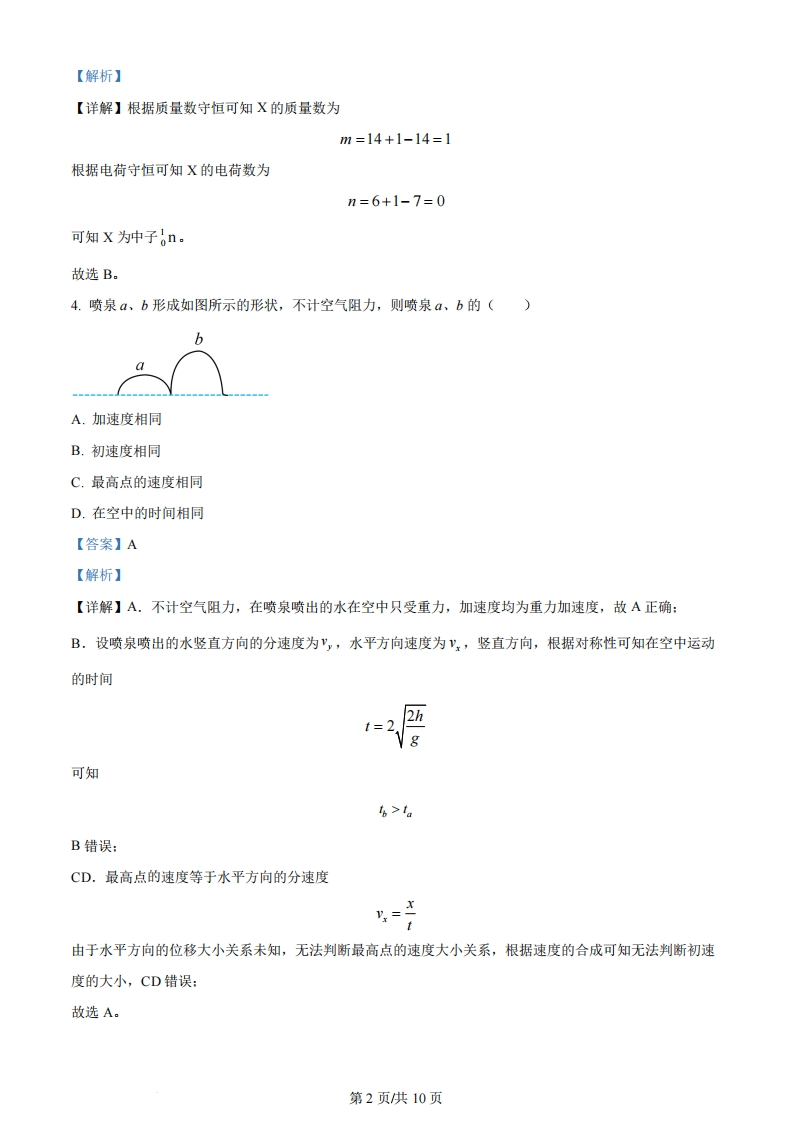 江苏高考物理试卷1.在静电场中有a、b两点,试探电荷在两点的静电力F与电荷量g满足如图所示的关系,请问a、b两点的场强大小关系是()A.E。=EbB.E=2E6C.E。E6【答案】D【解析】F【详解】根据E=一可知F一q图像斜率表示电场强度,由图可知qE。>E6根据题意无法得出E,和E。的数量关系。故选D。2.用立体影院的特殊眼镜去观看手机液晶屏幕,左镜片明亮,右镜片暗,现在将手机屏幕旋转90度,会观察到()A.两镜片都变亮B.两镜片都变暗C.两镜片没有任何变化D.左镜片变暗,右镜片变亮【答案】D【解析】【详解】立体影院的特殊眼镜是利用了光的偏振,其镜片为偏振片,立体影院的特殊眼镜去观看手机液晶屏幕,左镜片明亮,右镜片暗,根据I=I。c0s2B可知将手机屏幕旋转90度后左镜片变暗,右镜片变亮。故选D。3.用粒子轰击氮核从原子核中打出了质子,该实验的核反应方程式是X+,N→H+。C,粒子X为()A.正电子9eB.中子。nC.氘核HD.氢核【答案】B第1页供10页【解析】【详解】根据质量数守恒可知X的质量数为m=14+1-14=1根据电荷守恒可知X的电荷数为n=6+1-7=0可知X为中子。n。故选B。4.喷泉a、b形成如图所示的形状,不计空气阻力,则喷泉a、b的()bA.加速度相同B.初速度相同C.最高点的速度相同D.在空中的时间相同【答案】A【解析】【详解】A.不计空气阻力,在喷泉喷出的水在空中只受重力,加速度均为重力加速度,故A正确:B。设喷泉喷出的水竖直方向的分速度为”,水平方向速度为V,竖直方向,根据对称性可知在空中运动的时间t=2h可知t>laB错误:CD,最高点的速度等于水平方向的分速度由于水平方向的位移大小关系未知,无法判断最高点的速度大小关系,根据速度的合成可知无法判断初速度的大小,CD错误:故选A。第2页供10页5.在原子跃迁中,辐射如图所示的4种光子,其中只有一种光子可使某金属发生光电效应,是哪一种A.1B.2C.3D.4【答案】C【解析】【详解】根据光电方程可知当只有一种光子可使某金属发生光电效应,该光子对应的能量最大,根据图中能级图可知跃迁时对应波长为入的光子能量最大。故选C。6.现有一光线以相同的入射角0,打在不同浓度NCI的两杯溶液中,折射光线如图所示(B1<2),己知折射率随浓度增大而变大。则()甲A.甲折射率大B.甲浓度小C.甲中光线的传播速度大D.甲临界角大【答案】A【解析】【详解】入射角相同,由于R<及,根据折射定律可知>2,故甲浓度大:根据v=S,可知光线在甲中的传播速度较小,由sC=一可知折射率越大临界角越小,故甲临界角小。n故选A。7.如图所示,水面上有O、A、B三点共线,OA=2AB,1=0时刻在O点的水面给一个扰动,11时刻A开第3页供10页